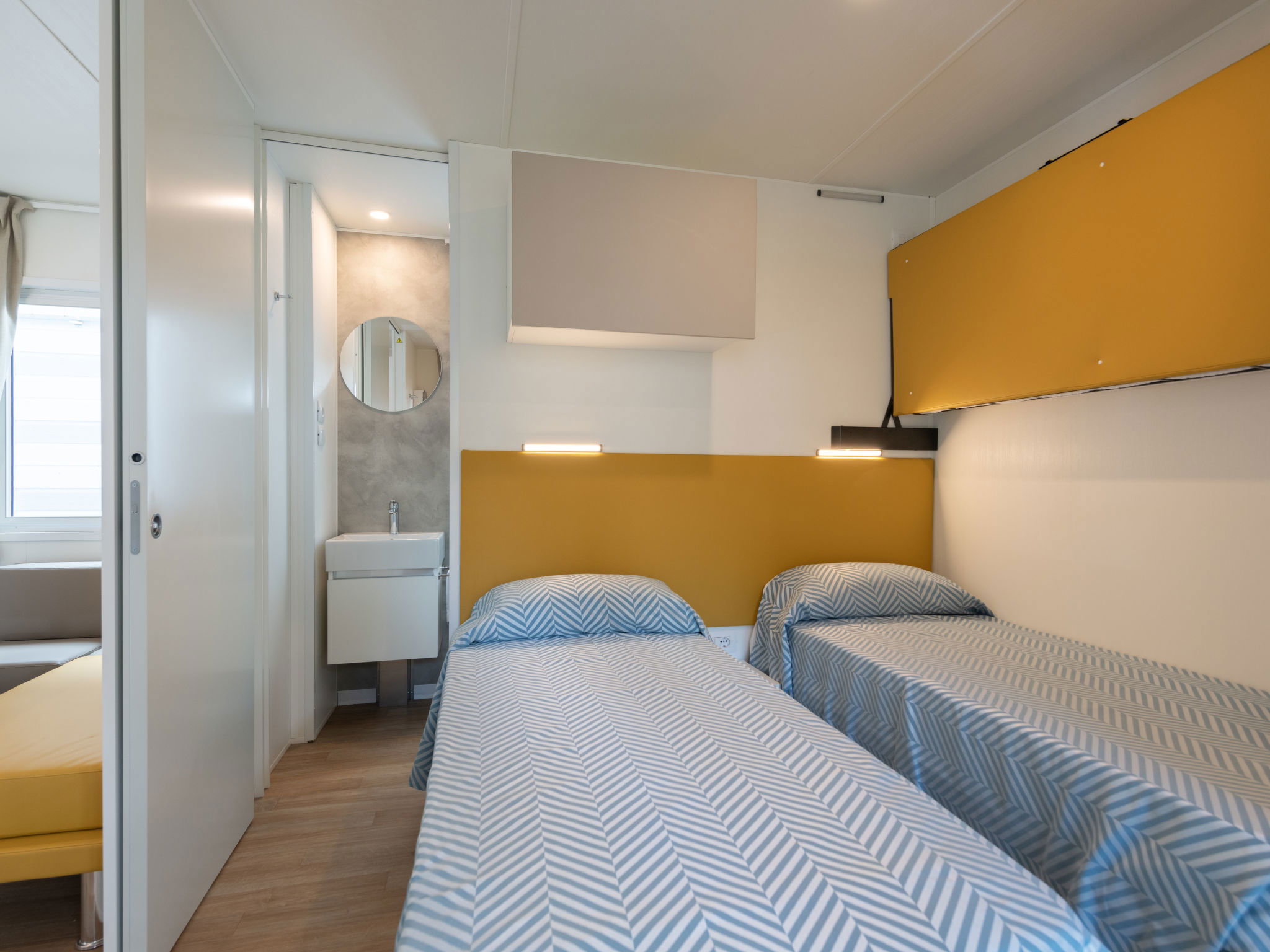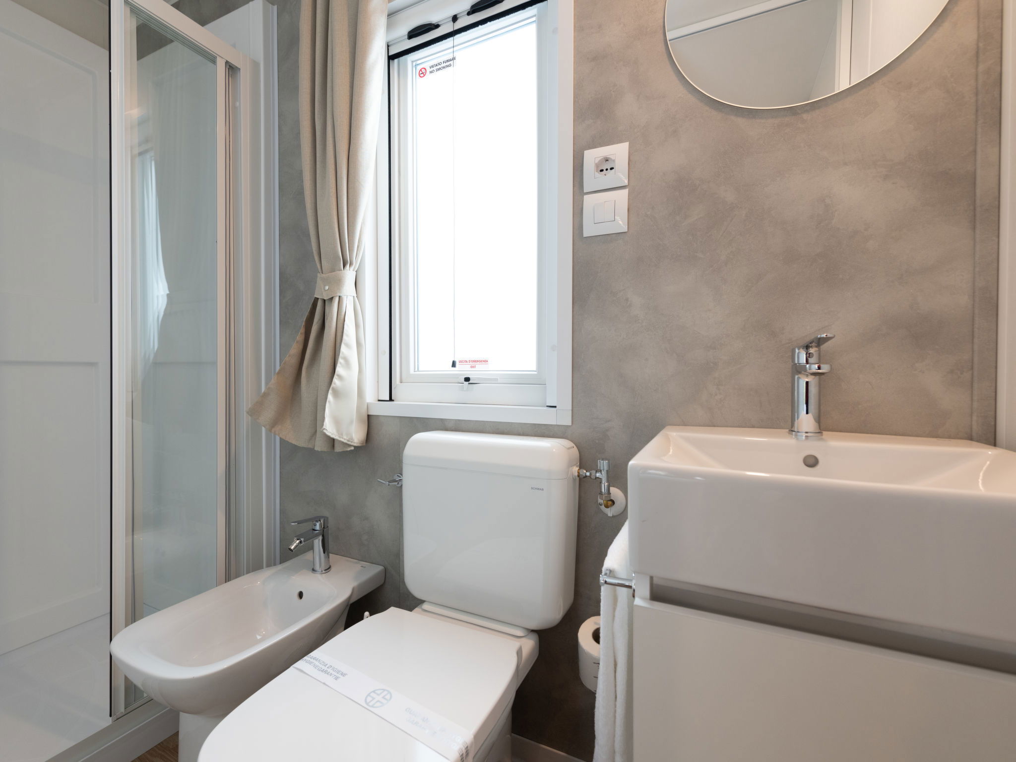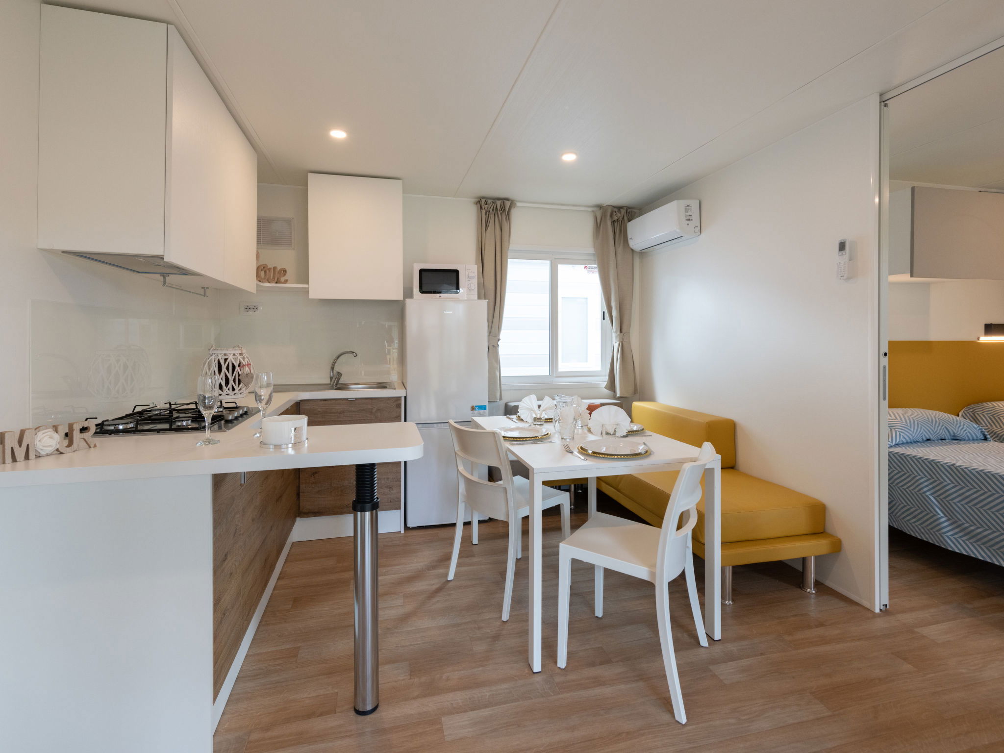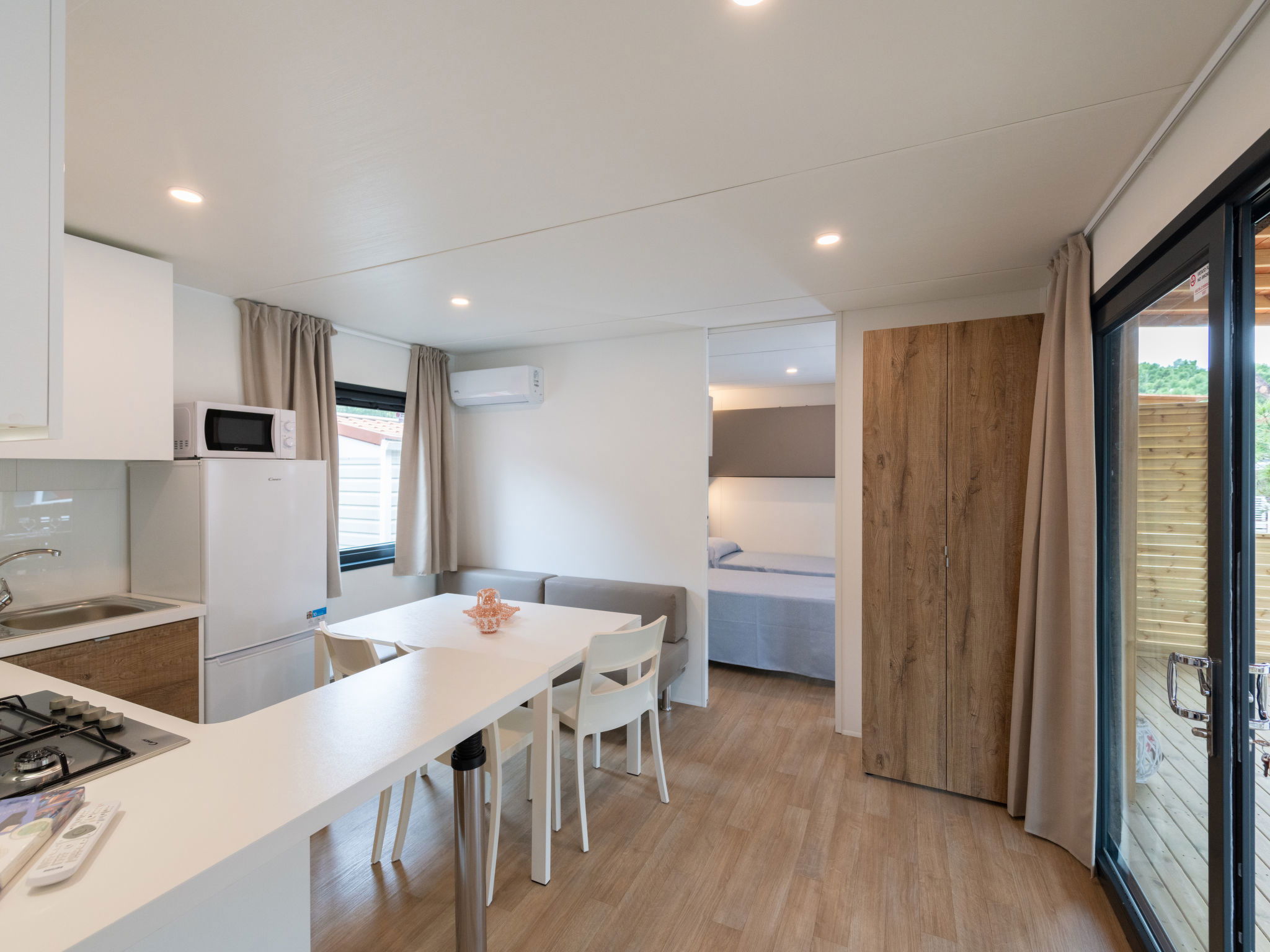"Ambra", 3 pièces mobil home 34 m2. Logement idéal pour 4 adultes + 1 enfant. Aménagement moderne: séjour/salle à manger avec TV (satellite), air-conditionné et chauffage à air chaud. Sortie sur la véranda. 1 chambre double avec douche/bidet/WC. Sortie sur la véranda. 1 chambre avec 2 lits et 1 x 1 lits superposés, douche/WC. Sortie sur la véranda. Cuisine ouverte (4 feux, micro-ondes). Douche/bidet/WC. Air-conditionné, chauffage à air chaud. Terrasse couverte. Meubles de terrasse. Place de parking (1 Voiture). Maximum 1 animal/ chien autorisé. IT038006B17TCUP7WY