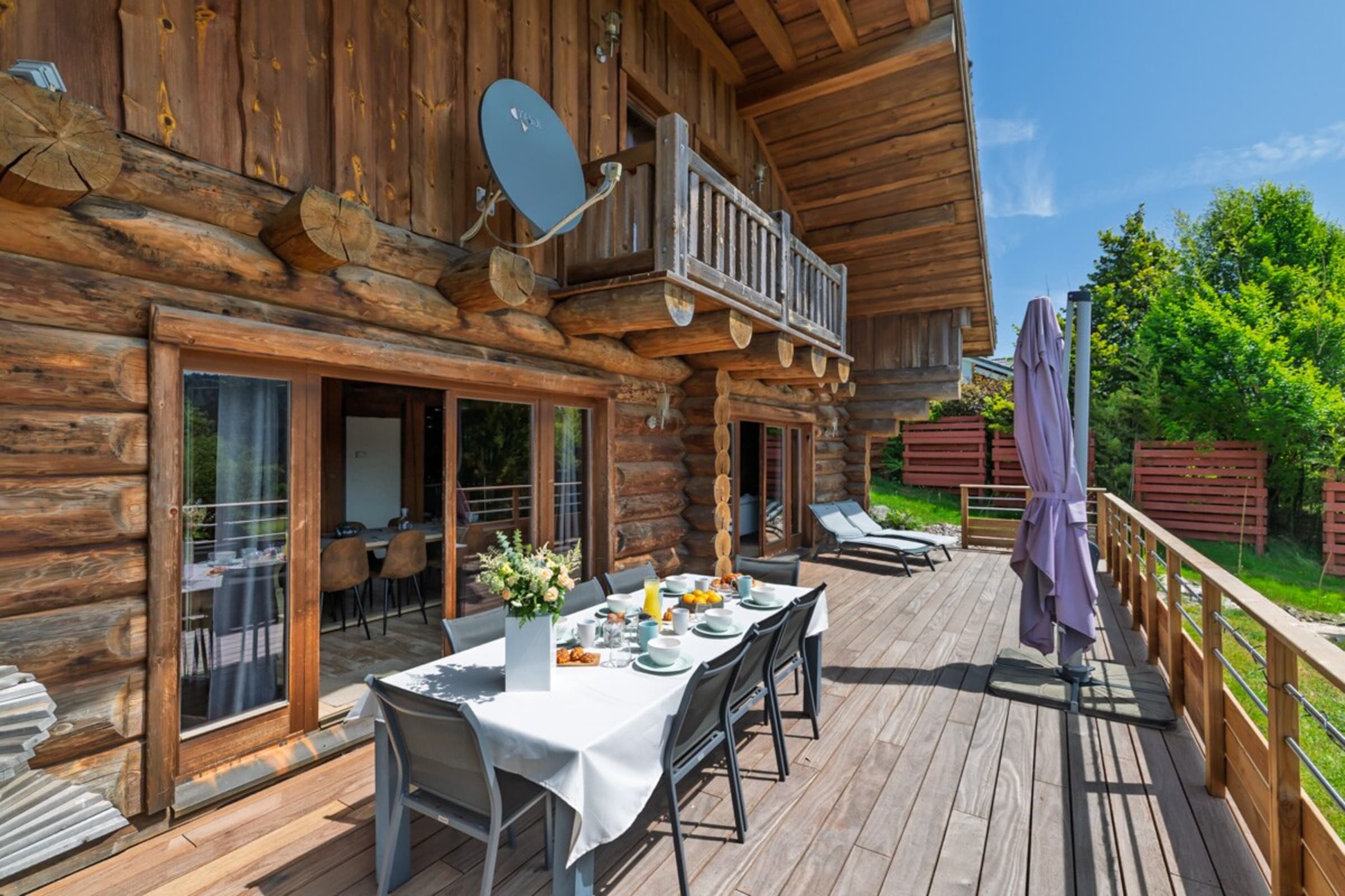 Terrasse exposée sud-ouest de 35 m² avec barbecue, grande table, transats et parasol