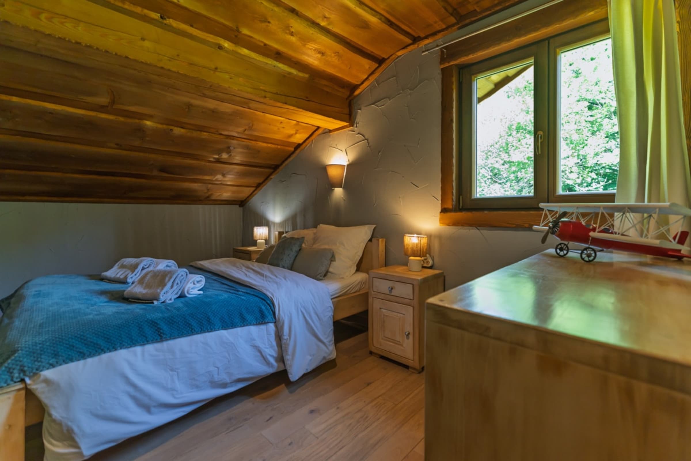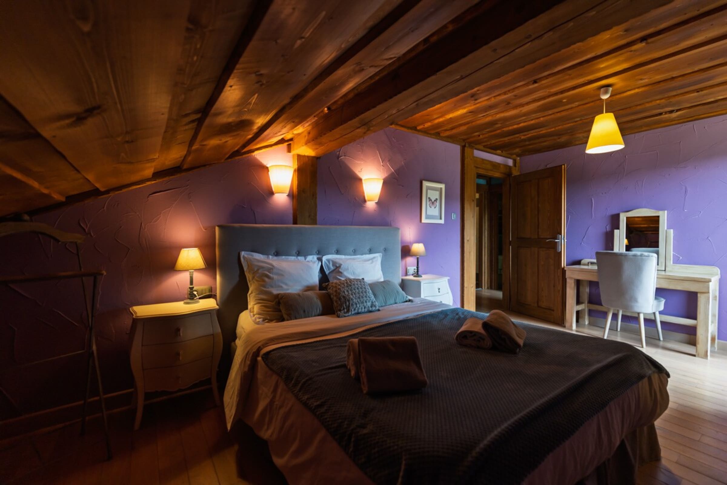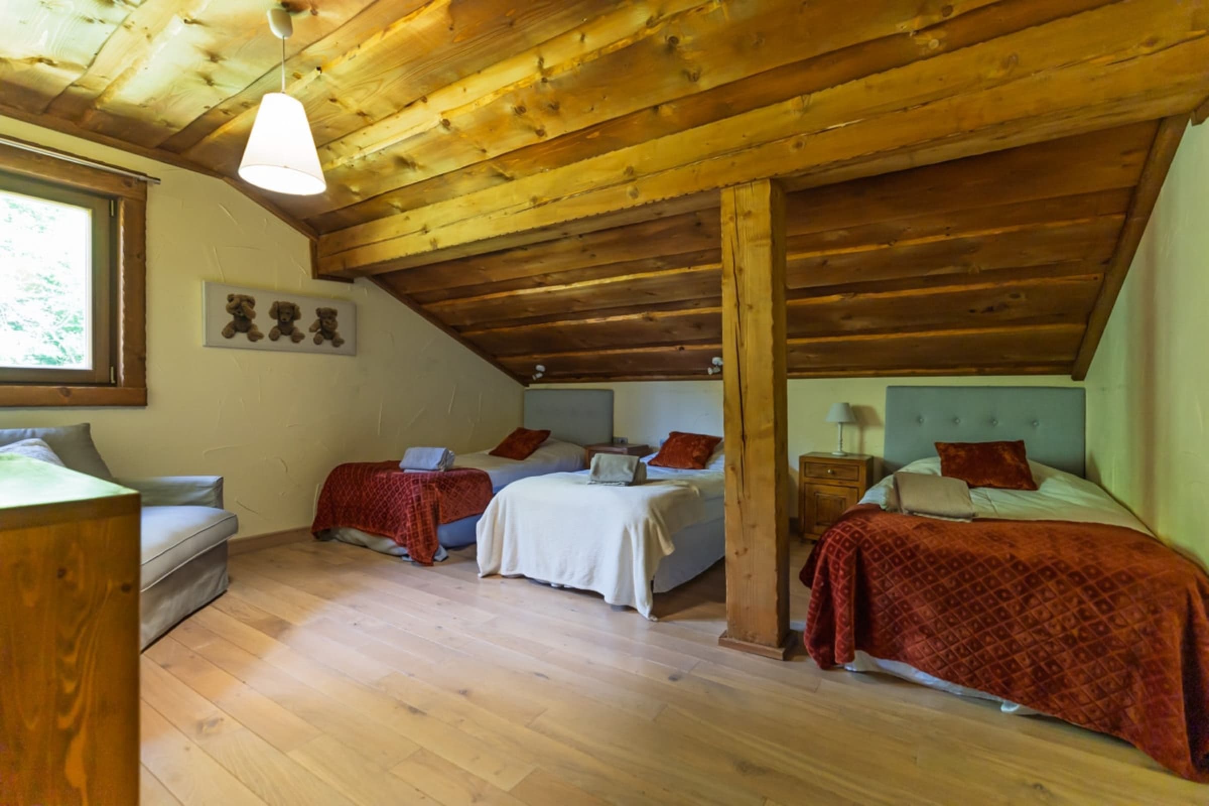 Le chalet dispose de 4 chambres confortables (3 lits doubles et 3 lits simples), ainsi que de 2 salles de bain (baignoire et douche), d’un WC indépendant et d’un second WC intégré à une salle de bain.