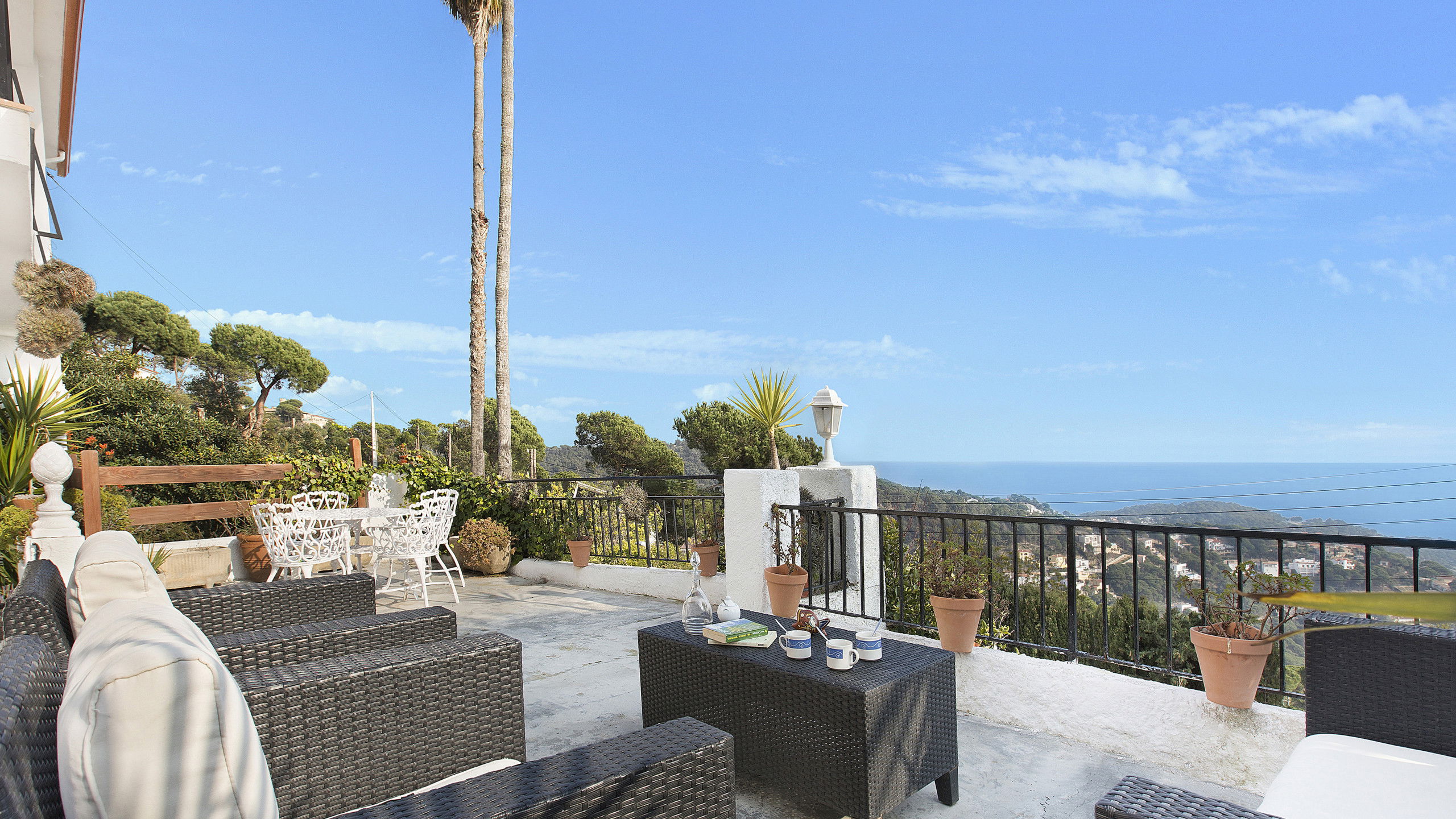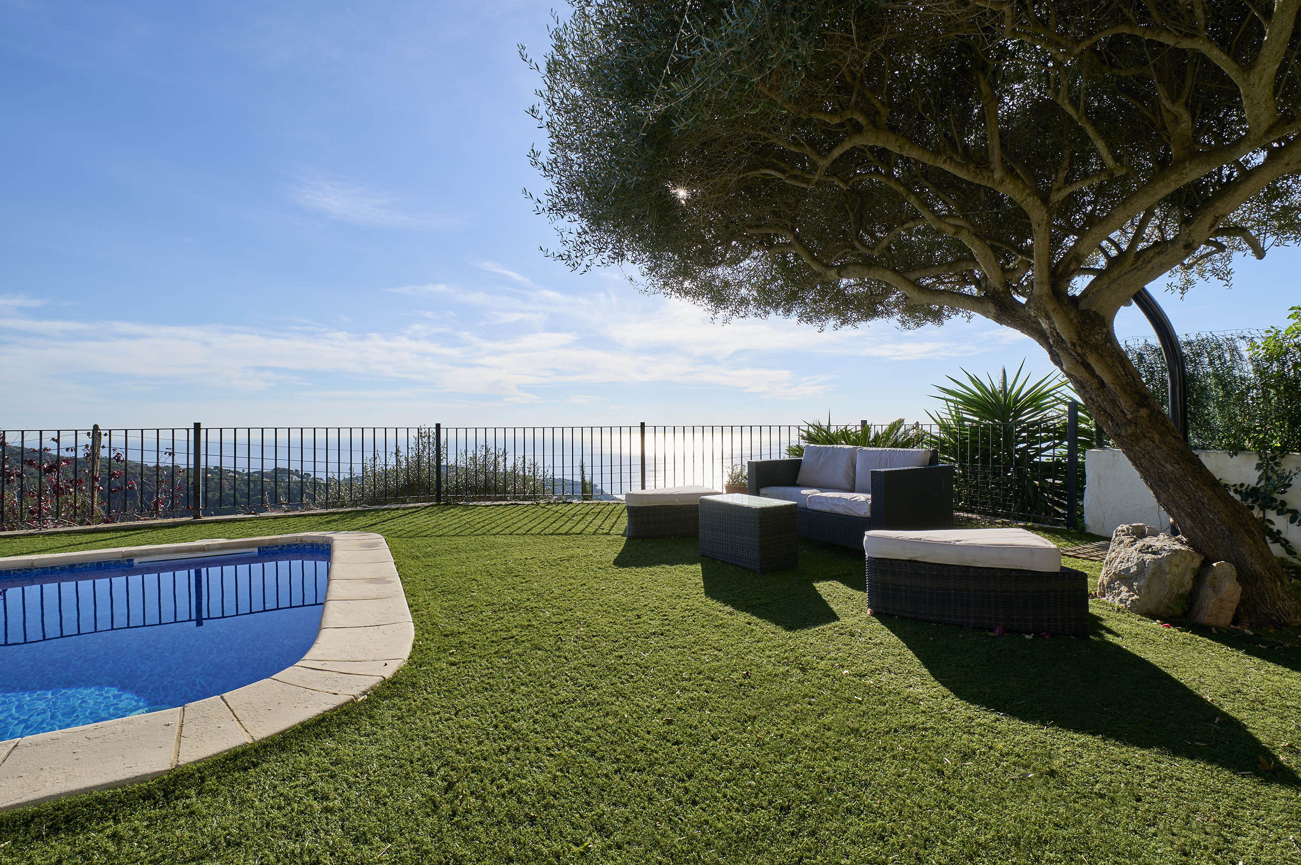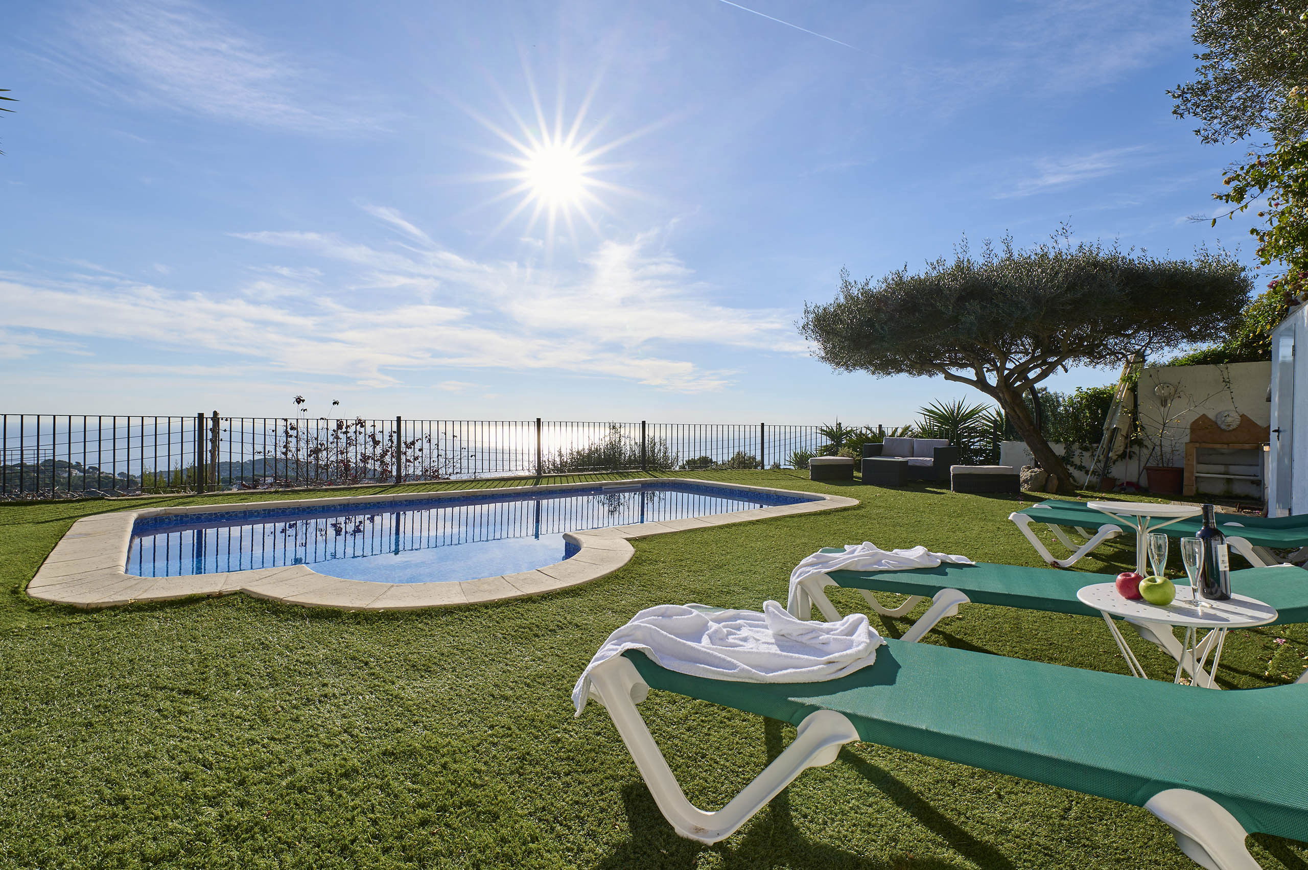 Espace extérieur avec piscine privée (7 x 3,5m) avec une vue magnifique sur la mer et les montagnes, barbecue intégré et une grande terrasse où vous pourrez prendre le petit déjeuner et les repas, ainsi qu'un espace détente pour profiter de la vue.