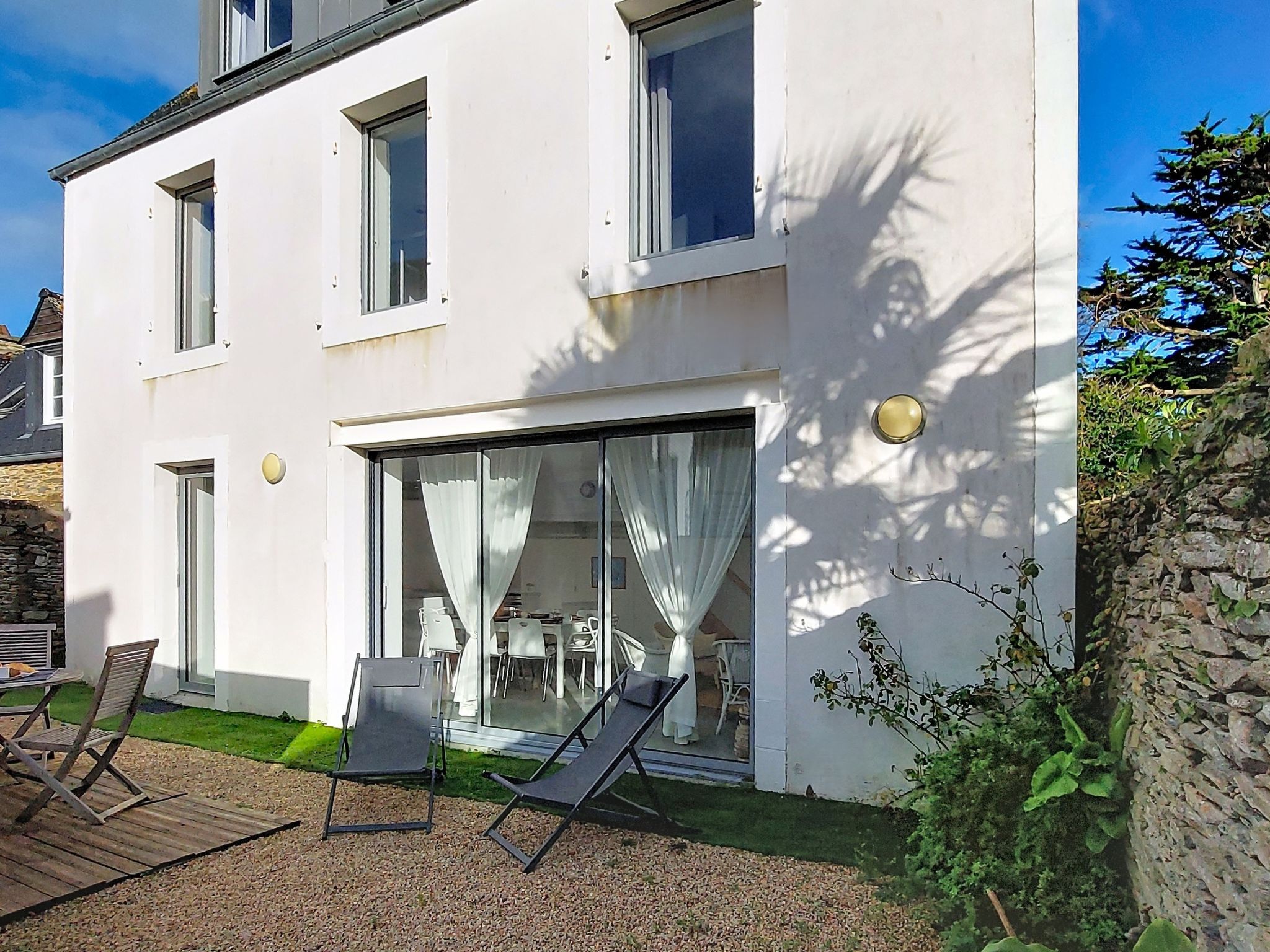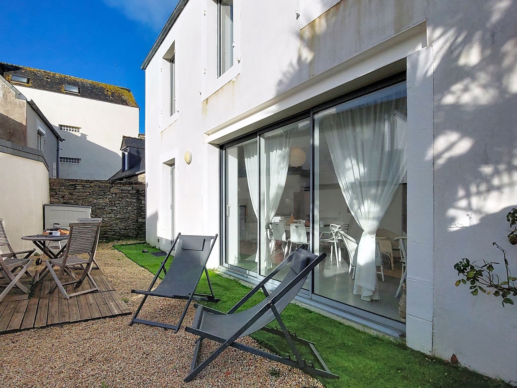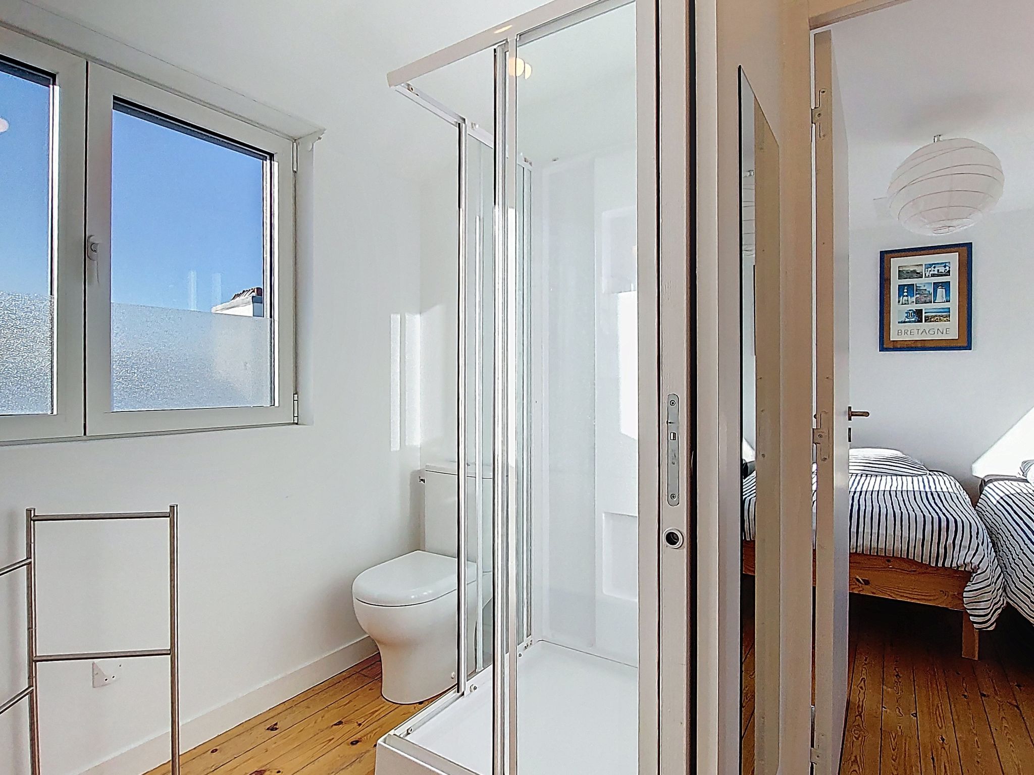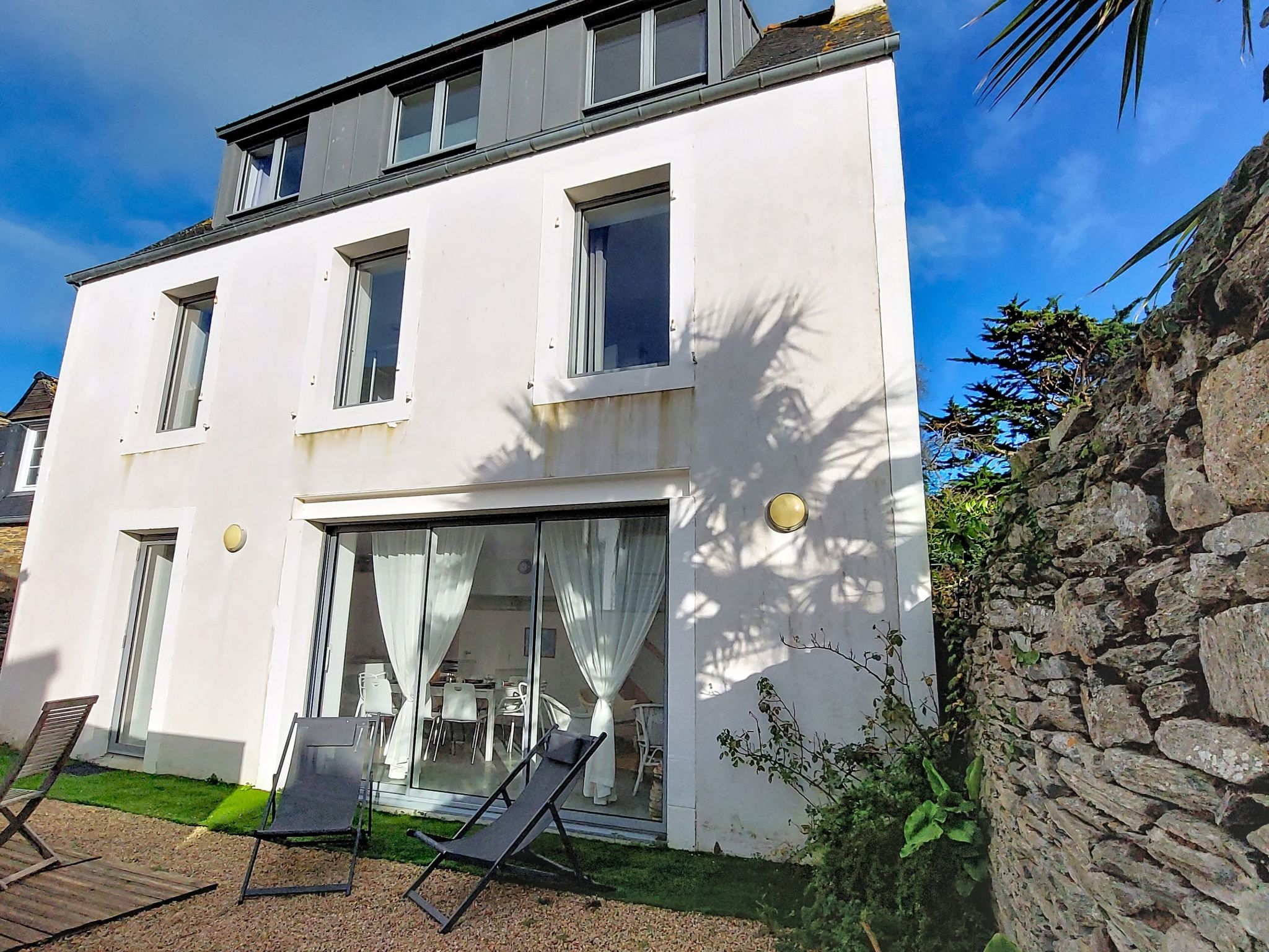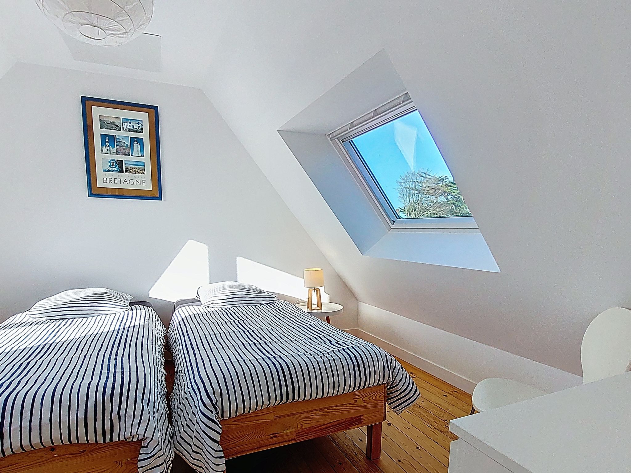 "Ker Soizik", maison 5 pièces 100 m2 sur 3 niveaux. Clair, aménagement agréable et de bon goût: séjour/salle à manger 40 m2, ouvert. Sortie sur la terrasse, orientée sud. Coin cuisine (four, lave-vaisselle, 4 plaques à induction, grille-pain, bouilloire électrique, micro-ondes, congélateur, cafetière électrique, Capsules pour machine à café (Nespresso) (NON INCLUSES)). WC séparé. À l'étage supérieur: 2 chambres 12 m2, chaque chambre avec: 2 grands-lits (140 cm, longueur 190 cm). Douche/WC. 2ème étage: 2 chambres 12 m2, chaque chambre avec: 2 lits (80 cm, longueur 190 cm). Douche/WC. Chauffage électrique. Petite terrasse 10 m2. Meubles de terrasse, barbecue (portable), chaises longues (2), réduit. Vue partielle sur la mer. A disposition: lave-linge, fer à repasser, chaise haute pour enfant, lit bébé jusqu'à 2 ans, sèche-cheveux. Internet (Connexion WIFI, gratuit). Veuillez noter: maison non-fumeur. Maximum 1 animal/ chien de petite taille autorisé. Détecteur de fumée. Annonce d'un particulier (art 155, IV du CGI).