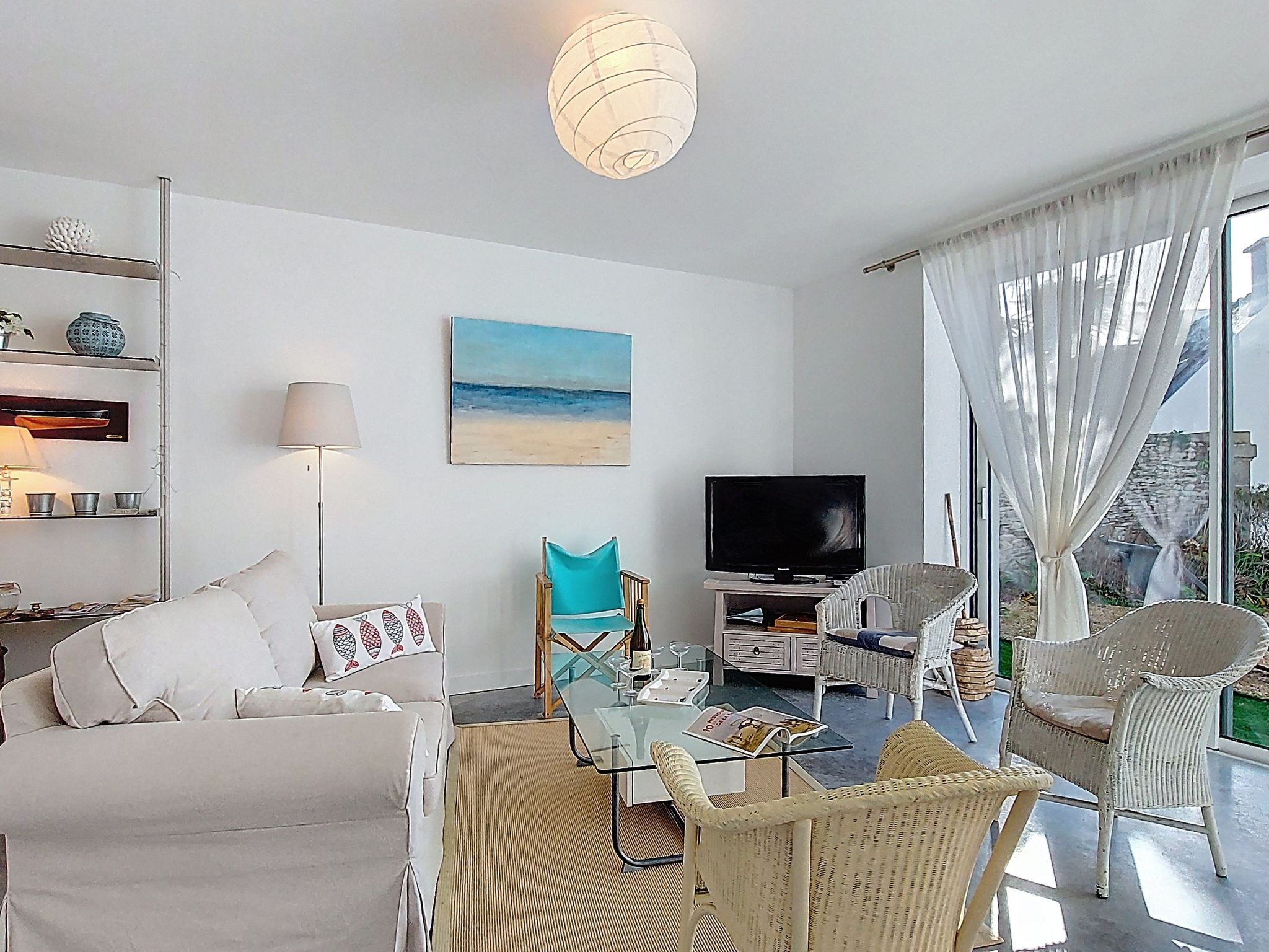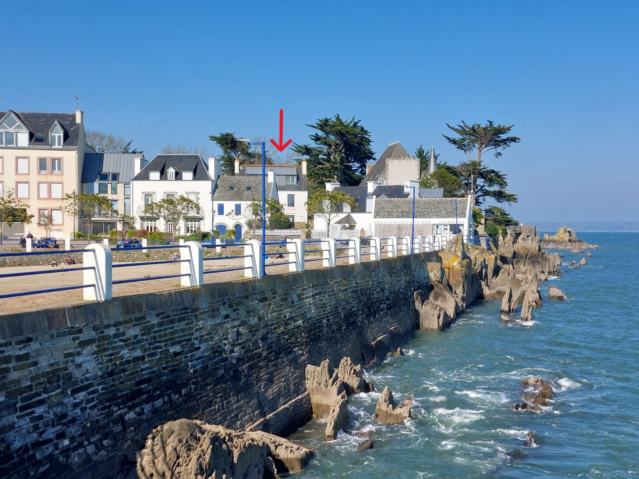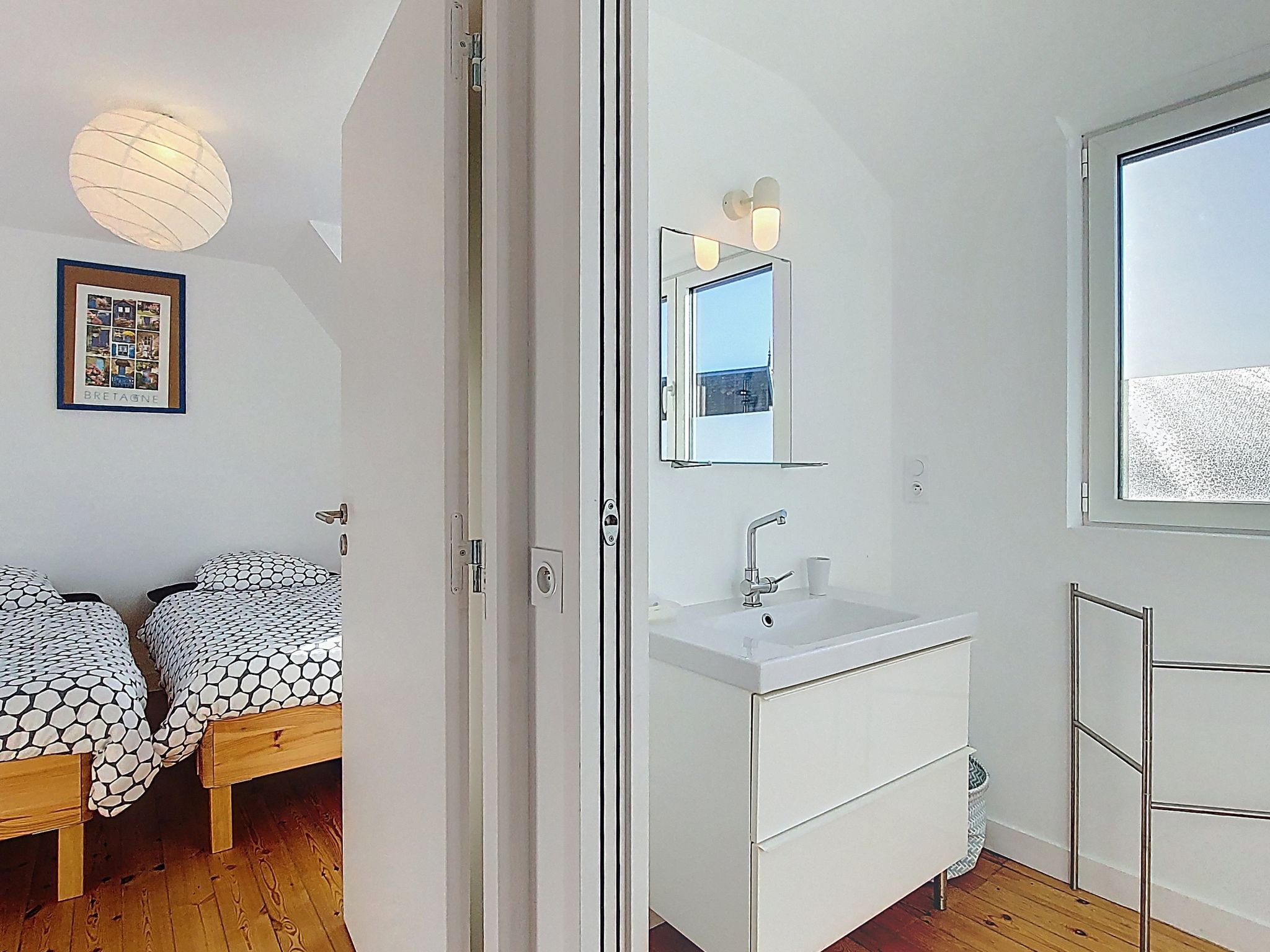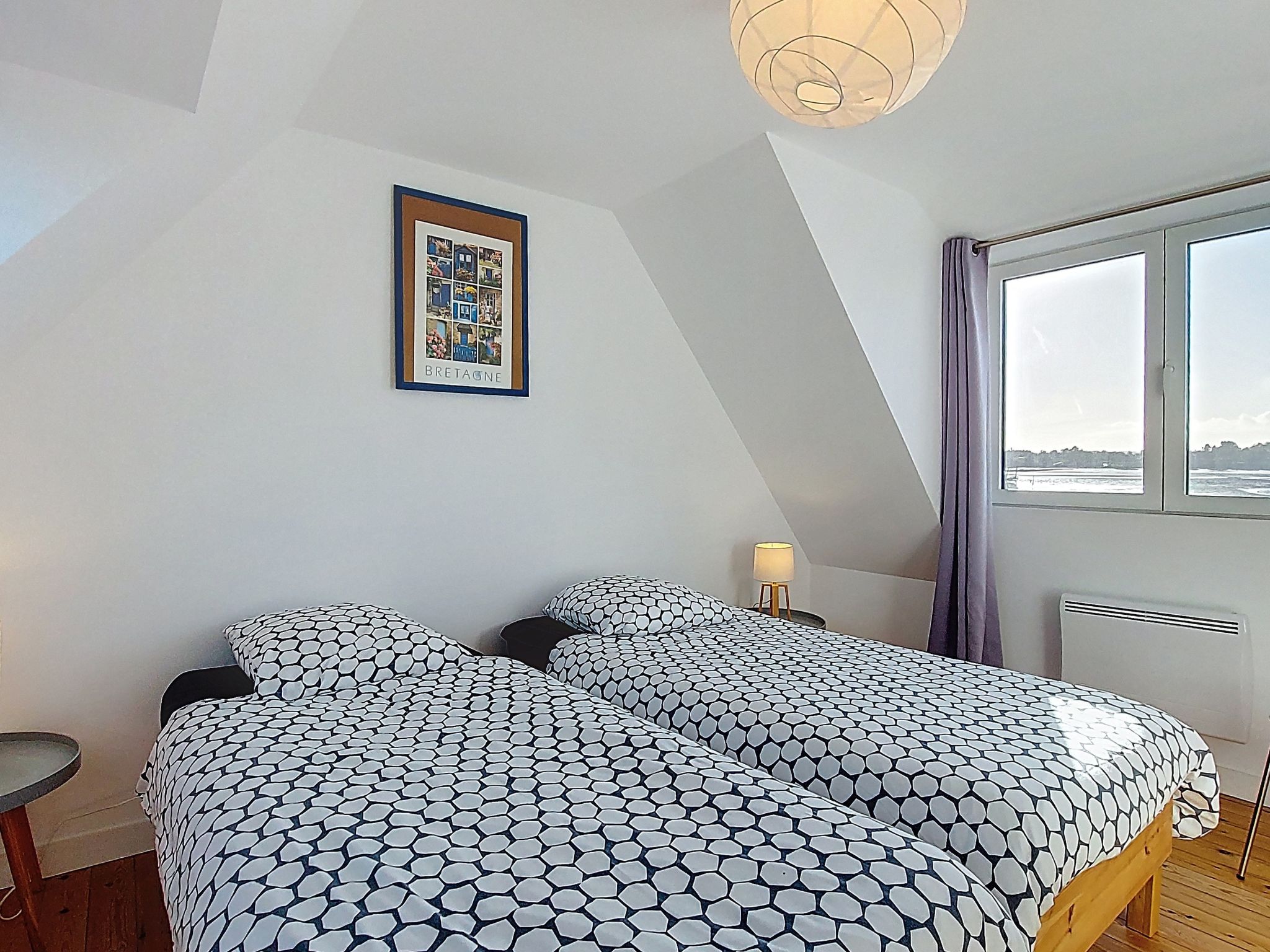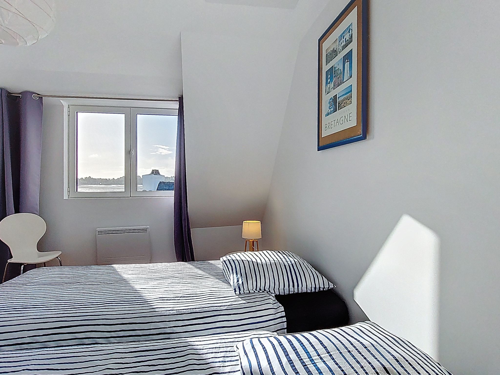 "Ker Soizik", maison 5 pièces 100 m2 sur 3 niveaux. Clair, aménagement agréable et de bon goût: séjour/salle à manger 40 m2, ouvert. Sortie sur la terrasse, orientée sud. Coin cuisine (four, lave-vaisselle, 4 plaques à induction, grille-pain, bouilloire électrique, micro-ondes, congélateur, cafetière électrique, Capsules pour machine à café (Nespresso) (NON INCLUSES)). WC séparé. À l'étage supérieur: 2 chambres 12 m2, chaque chambre avec: 2 grands-lits (140 cm, longueur 190 cm). Douche/WC. 2ème étage: 2 chambres 12 m2, chaque chambre avec: 2 lits (80 cm, longueur 190 cm). Douche/WC. Chauffage électrique. Petite terrasse 10 m2. Meubles de terrasse, barbecue (portable), chaises longues (2), réduit. Vue partielle sur la mer. A disposition: lave-linge, fer à repasser, chaise haute pour enfant, lit bébé jusqu'à 2 ans, sèche-cheveux. Internet (Connexion WIFI, gratuit). Veuillez noter: maison non-fumeur. Maximum 1 animal/ chien de petite taille autorisé. Détecteur de fumée. Annonce d'un particulier (art 155, IV du CGI).