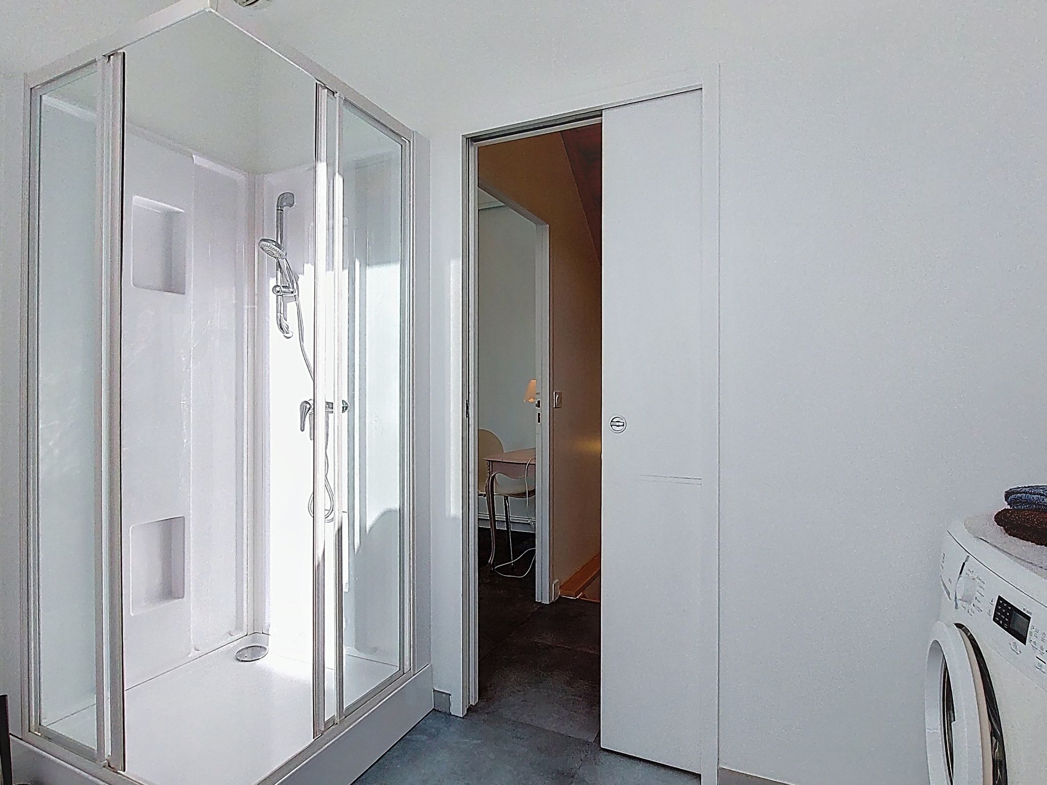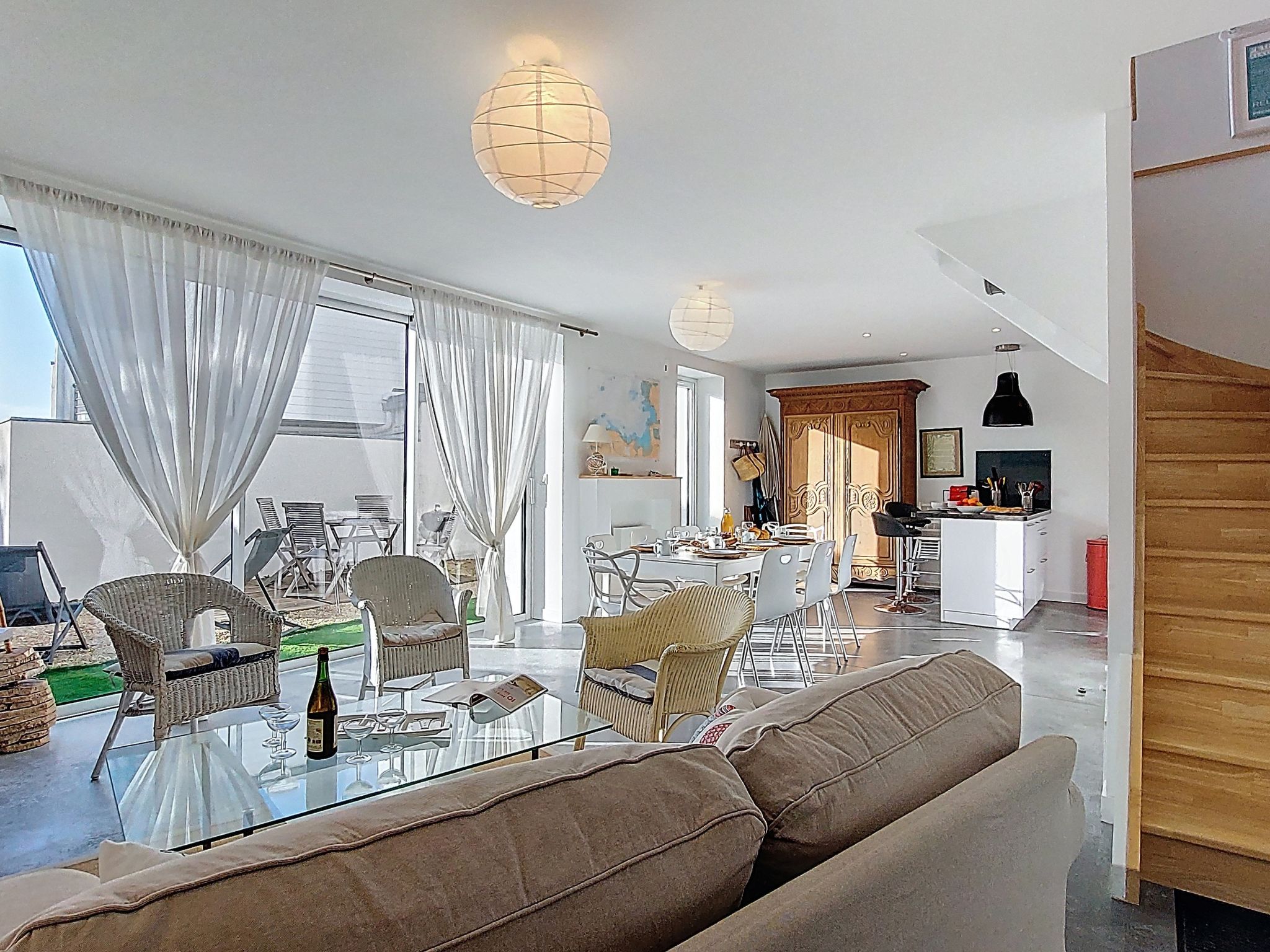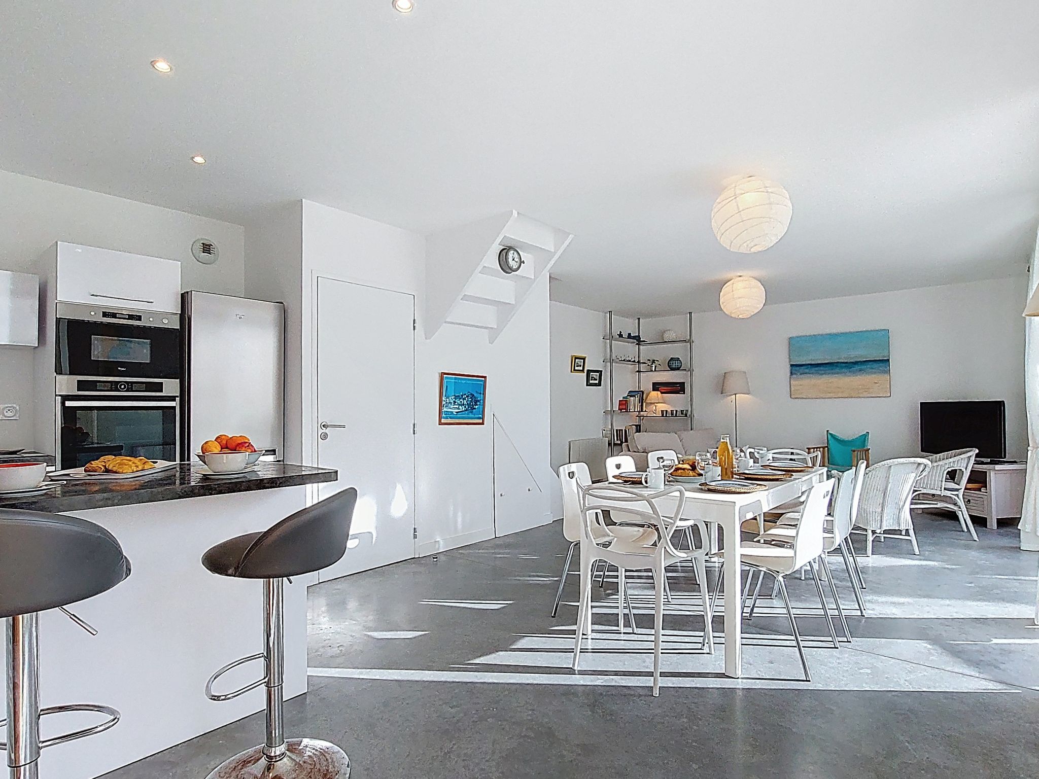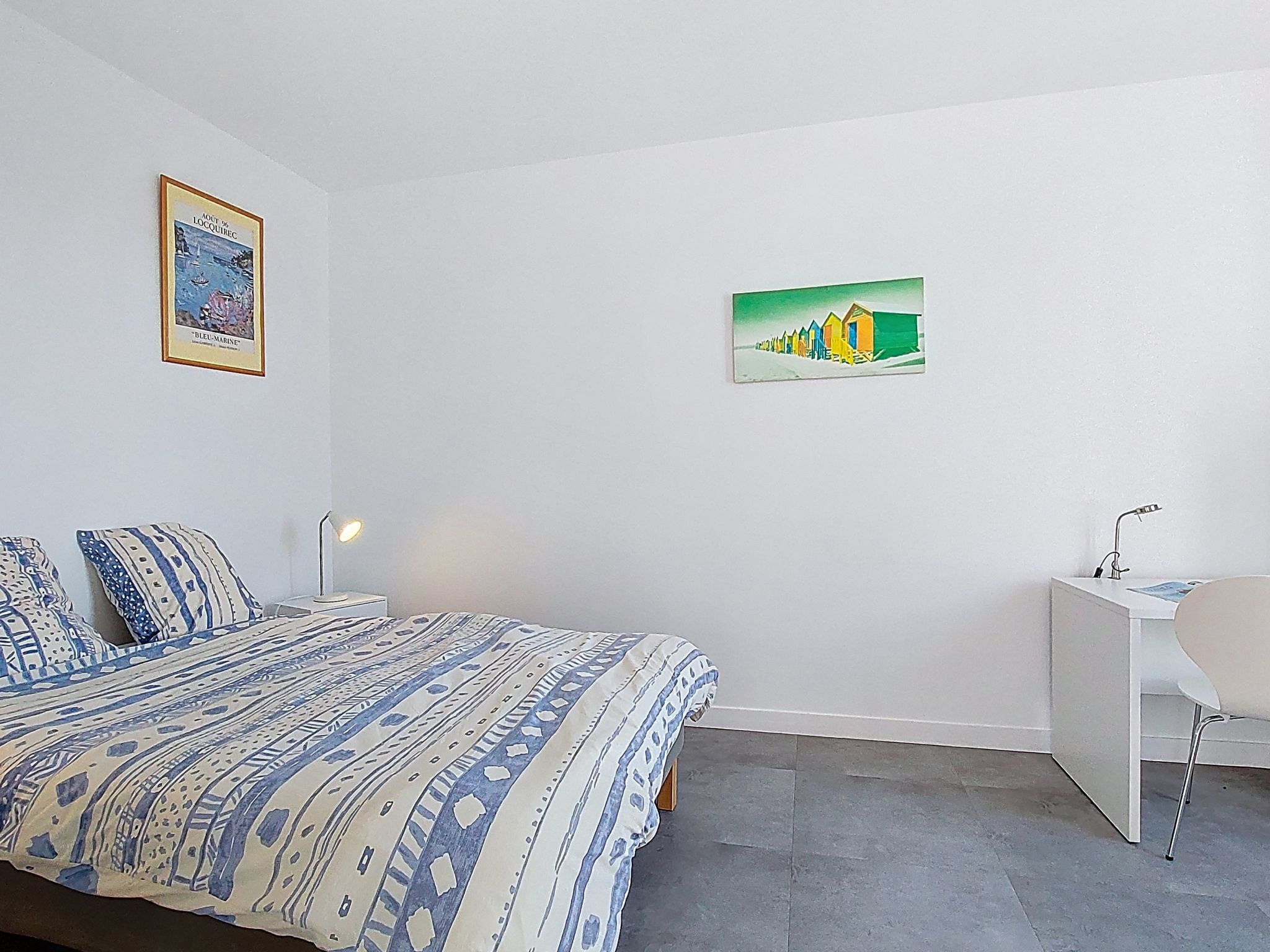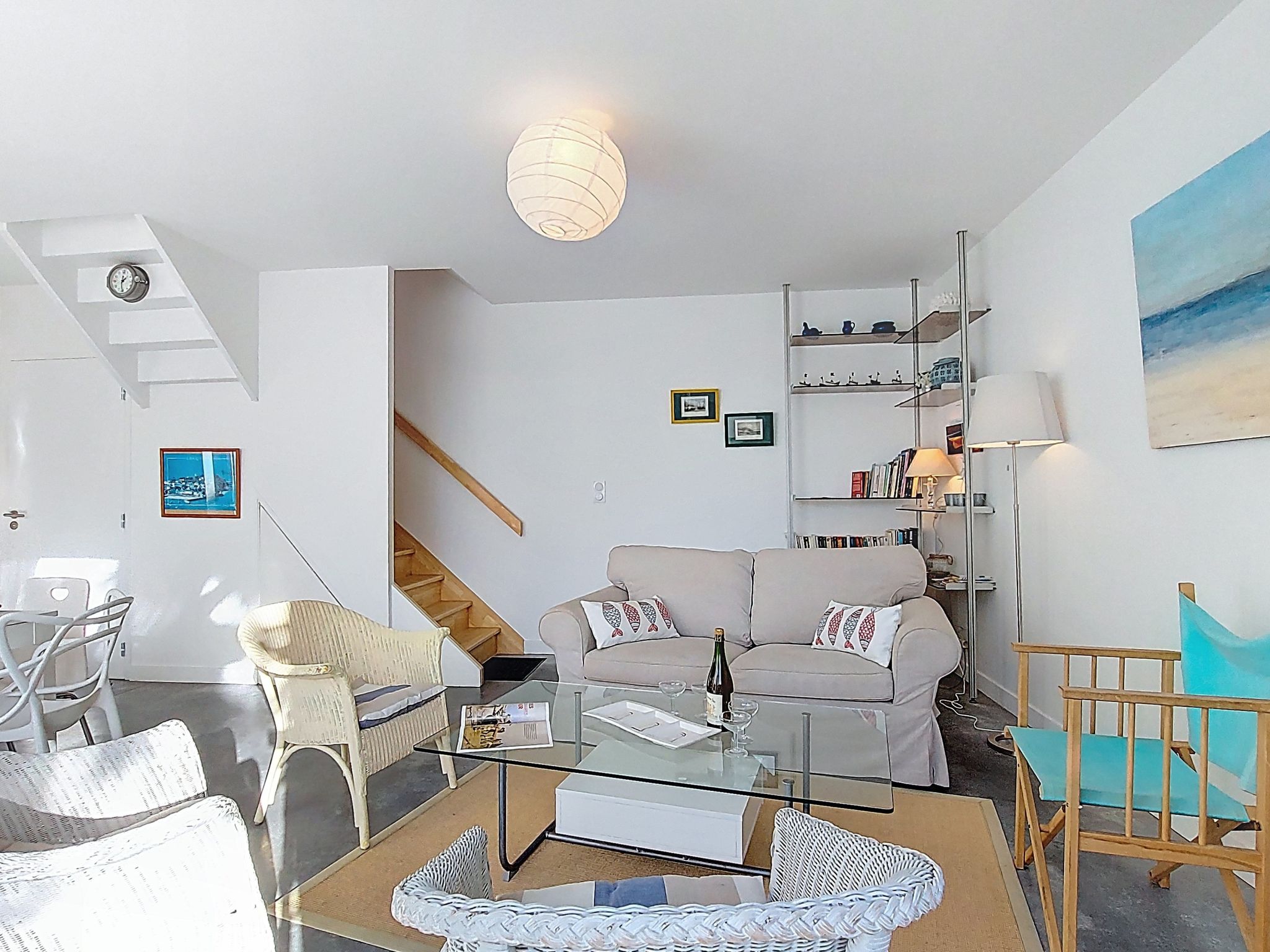 "Ker Soizik", maison 5 pièces 100 m2 sur 3 niveaux. Clair, aménagement agréable et de bon goût: séjour/salle à manger 40 m2, ouvert. Sortie sur la terrasse, orientée sud. Coin cuisine (four, lave-vaisselle, 4 plaques à induction, grille-pain, bouilloire électrique, micro-ondes, congélateur, cafetière électrique, Capsules pour machine à café (Nespresso) (NON INCLUSES)). WC séparé. À l'étage supérieur: 2 chambres 12 m2, chaque chambre avec: 2 grands-lits (140 cm, longueur 190 cm). Douche/WC. 2ème étage: 2 chambres 12 m2, chaque chambre avec: 2 lits (80 cm, longueur 190 cm). Douche/WC. Chauffage électrique. Petite terrasse 10 m2. Meubles de terrasse, barbecue (portable), chaises longues (2), réduit. Vue partielle sur la mer. A disposition: lave-linge, fer à repasser, chaise haute pour enfant, lit bébé jusqu'à 2 ans, sèche-cheveux. Internet (Connexion WIFI, gratuit). Veuillez noter: maison non-fumeur. Maximum 1 animal/ chien de petite taille autorisé. Détecteur de fumée. Annonce d'un particulier (art 155, IV du CGI).