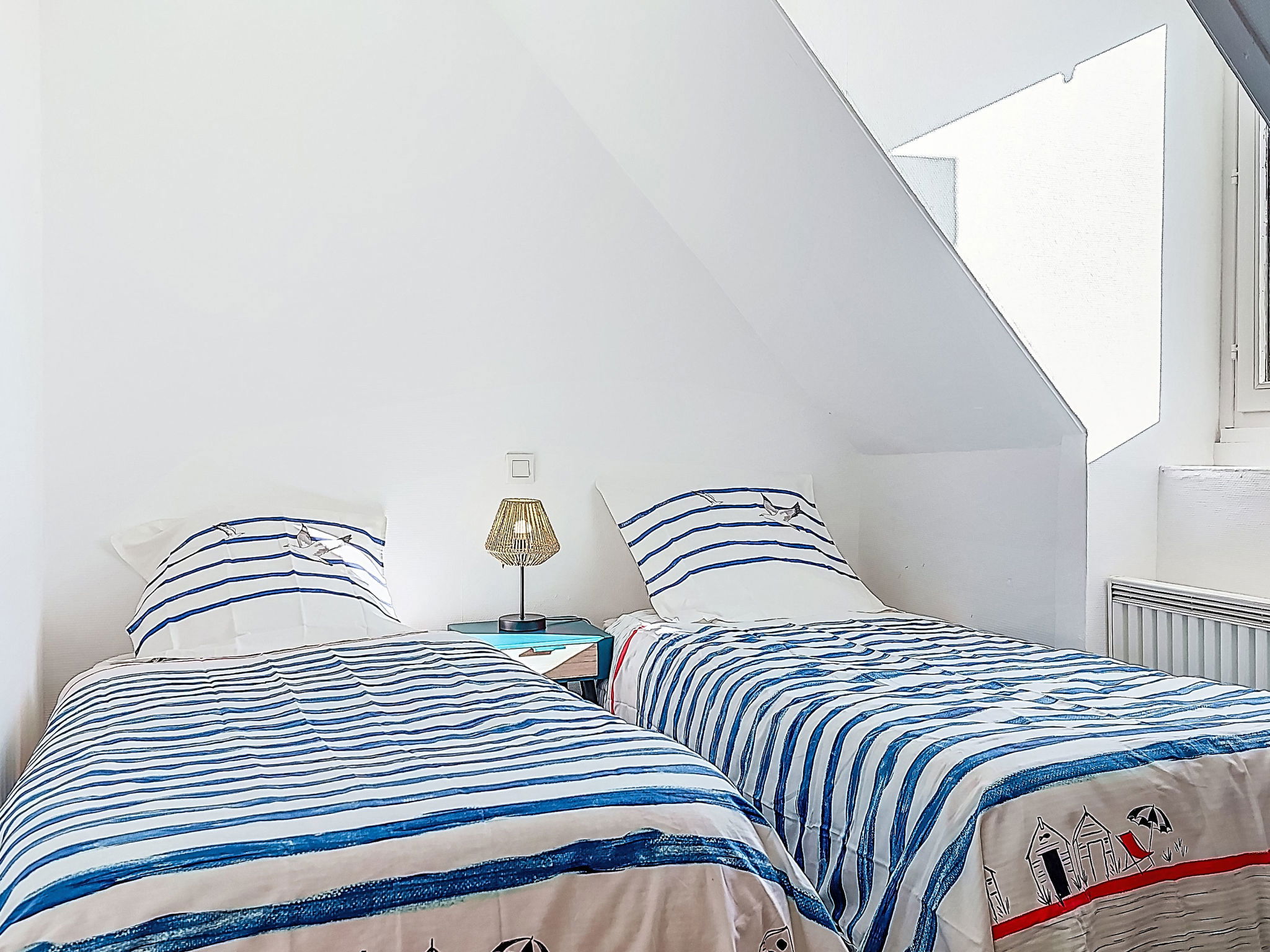 "Ty Côte", maison 3 pièces 65 m2 sur 2 niveaux. Clair, rénovée en 2025, aménagement agréable et de bon goût: séjour/salle à manger 25 m2, ouvert avec TV (écran plat). Sortie sur la terrasse. Grande cuisine ouverte 15 m2 (four, lave-vaisselle, 3 plaques à induction, bouilloire électrique, micro-ondes, congélateur, cafetière électrique, Capsules pour machine à café (Dolce Gusto) (NON INCLUSES)). Douche, WC séparé. À l'étage supérieur: 2 chambres 10 m2, mansardées, chaque chambre avec: 2 lits (80 cm, longueur 200 cm). Douche/WC. Chauffage électrique. Grande terrasse 25 m2, situation sud. Meubles de terrasse, barbecue (portable), chaises longues (2). Vue sur la mer. A disposition: lave-linge, sèche-linge, sèche-cheveux. Internet (Connexion WIFI, gratuit). Veuillez noter: maison non-fumeur. Maximum 1 animal/ chien de petite taille autorisé. Détecteur de fumée. Annonce d'un particulier (art 155, IV du CGI).