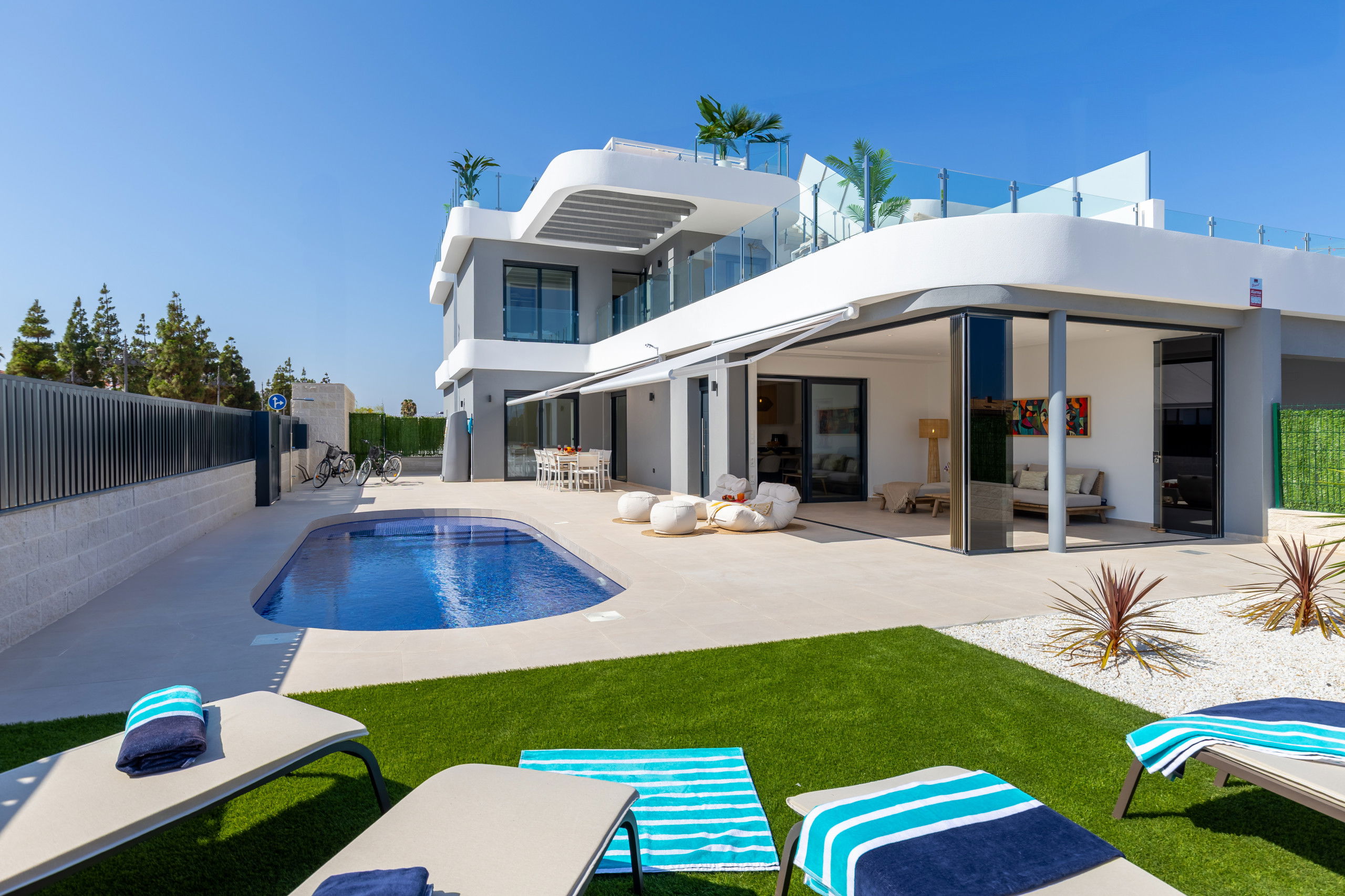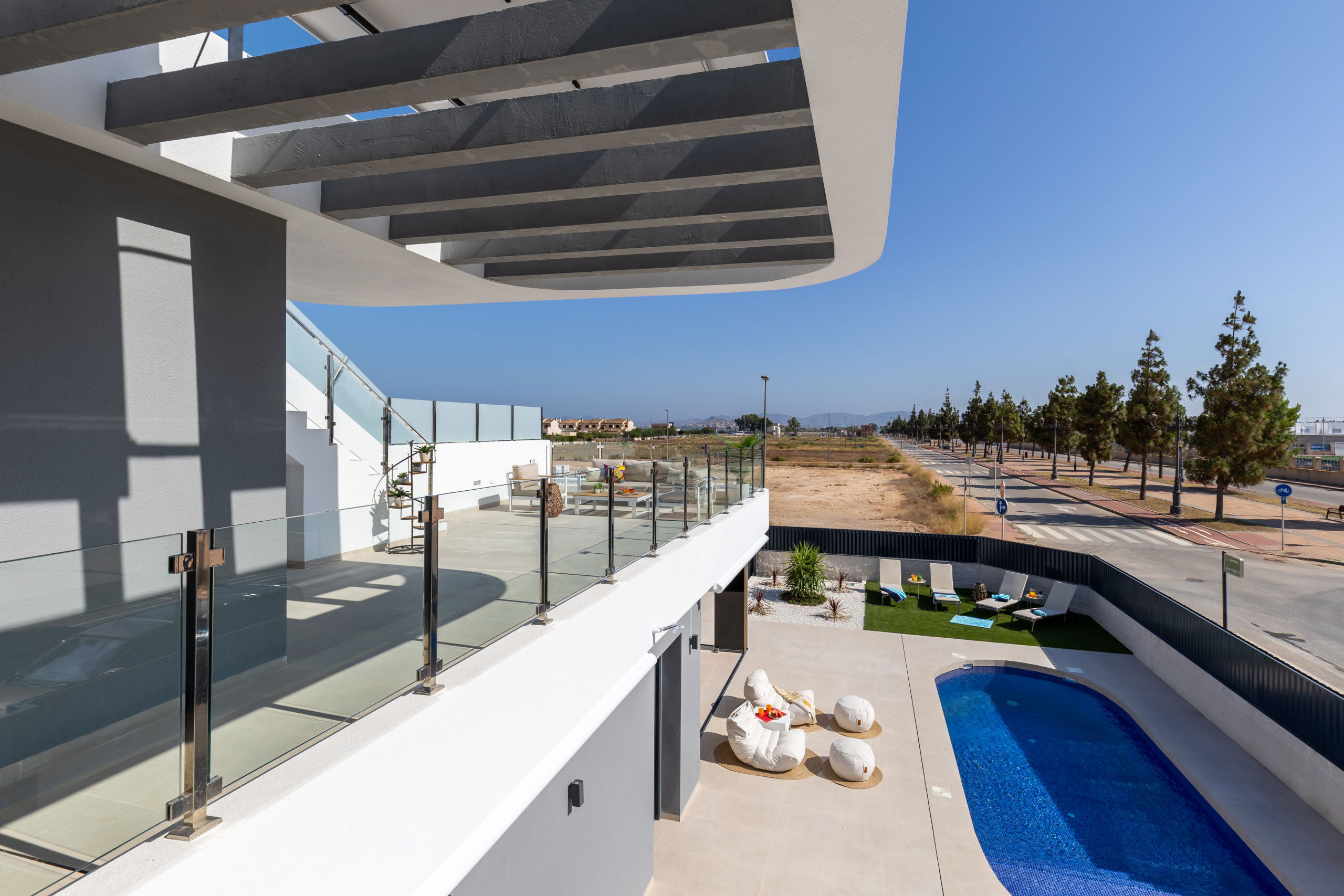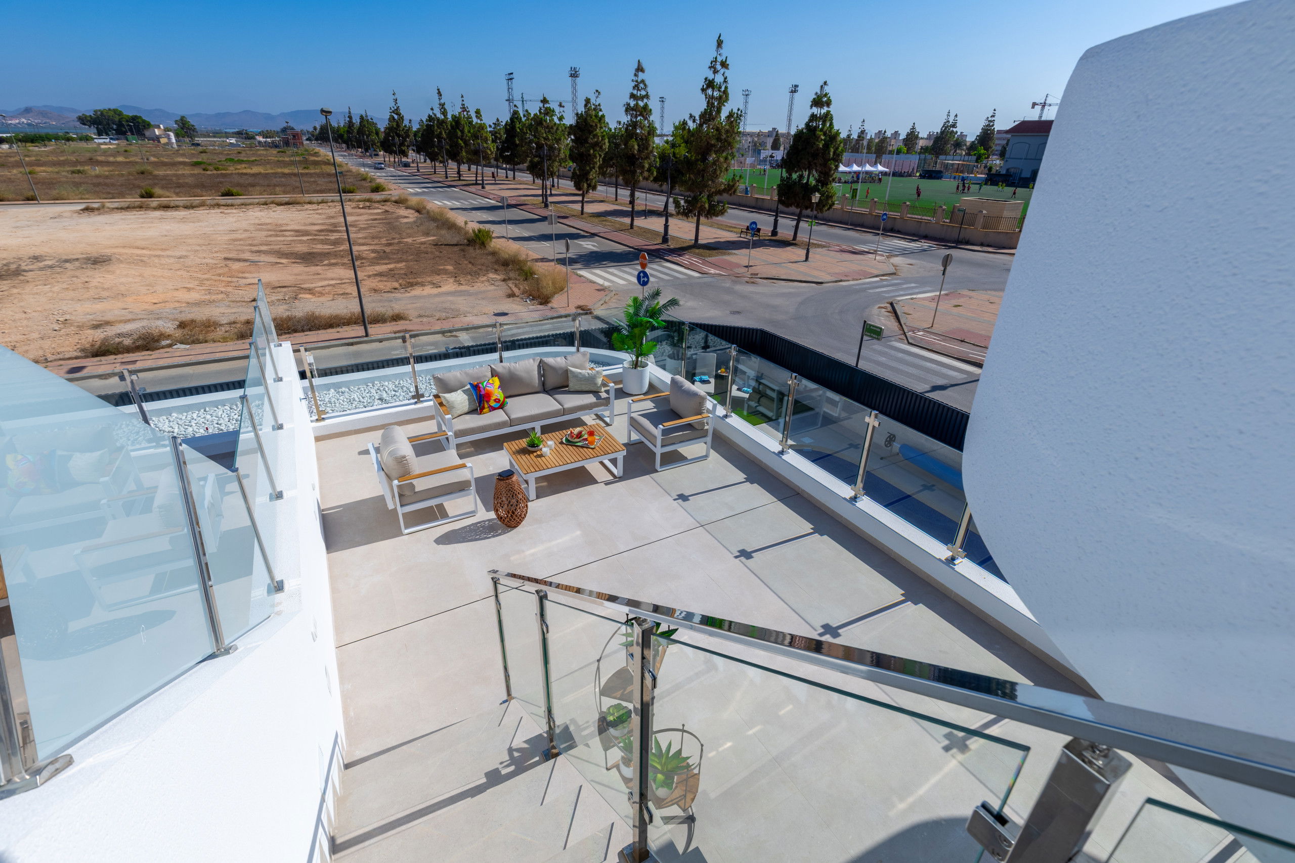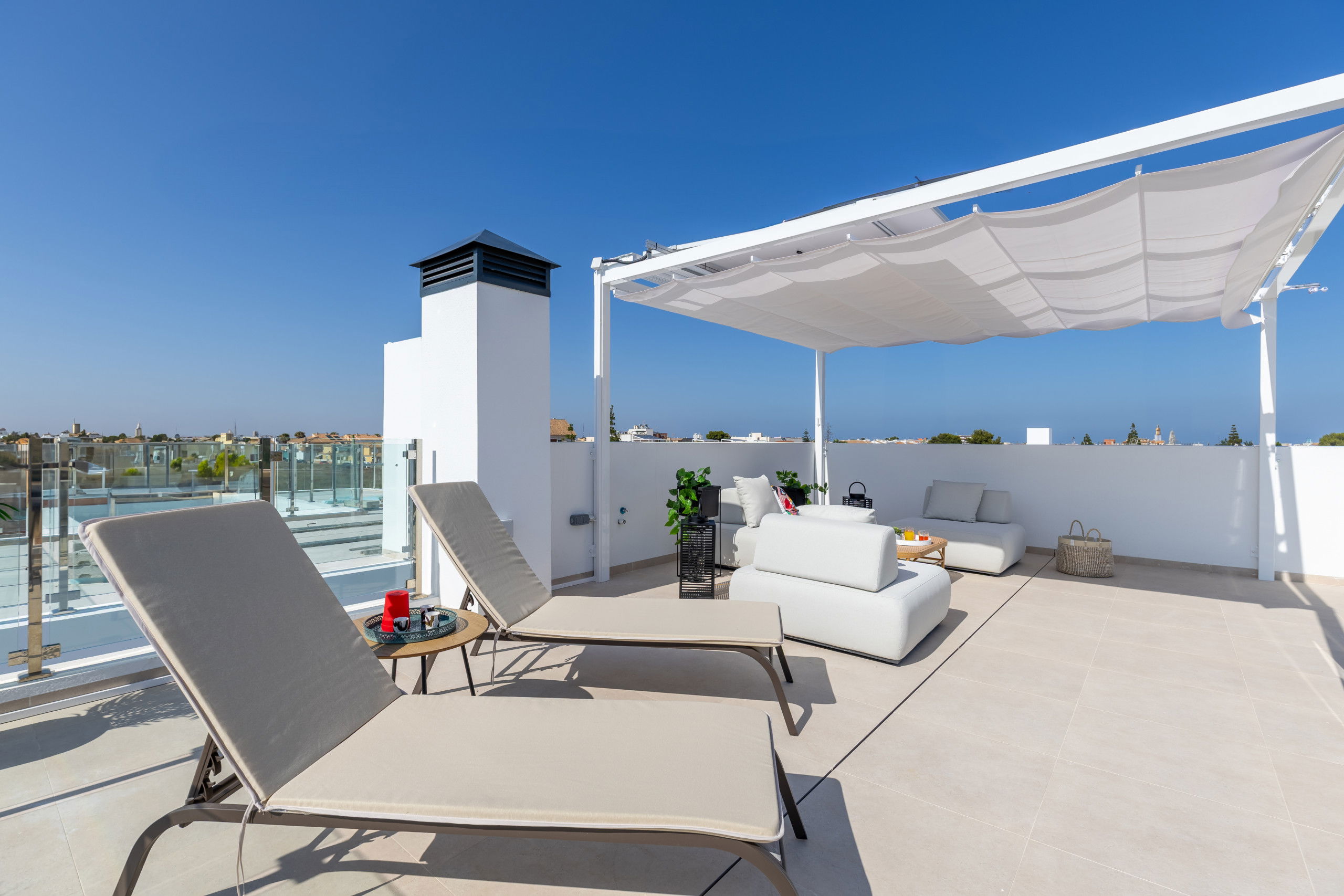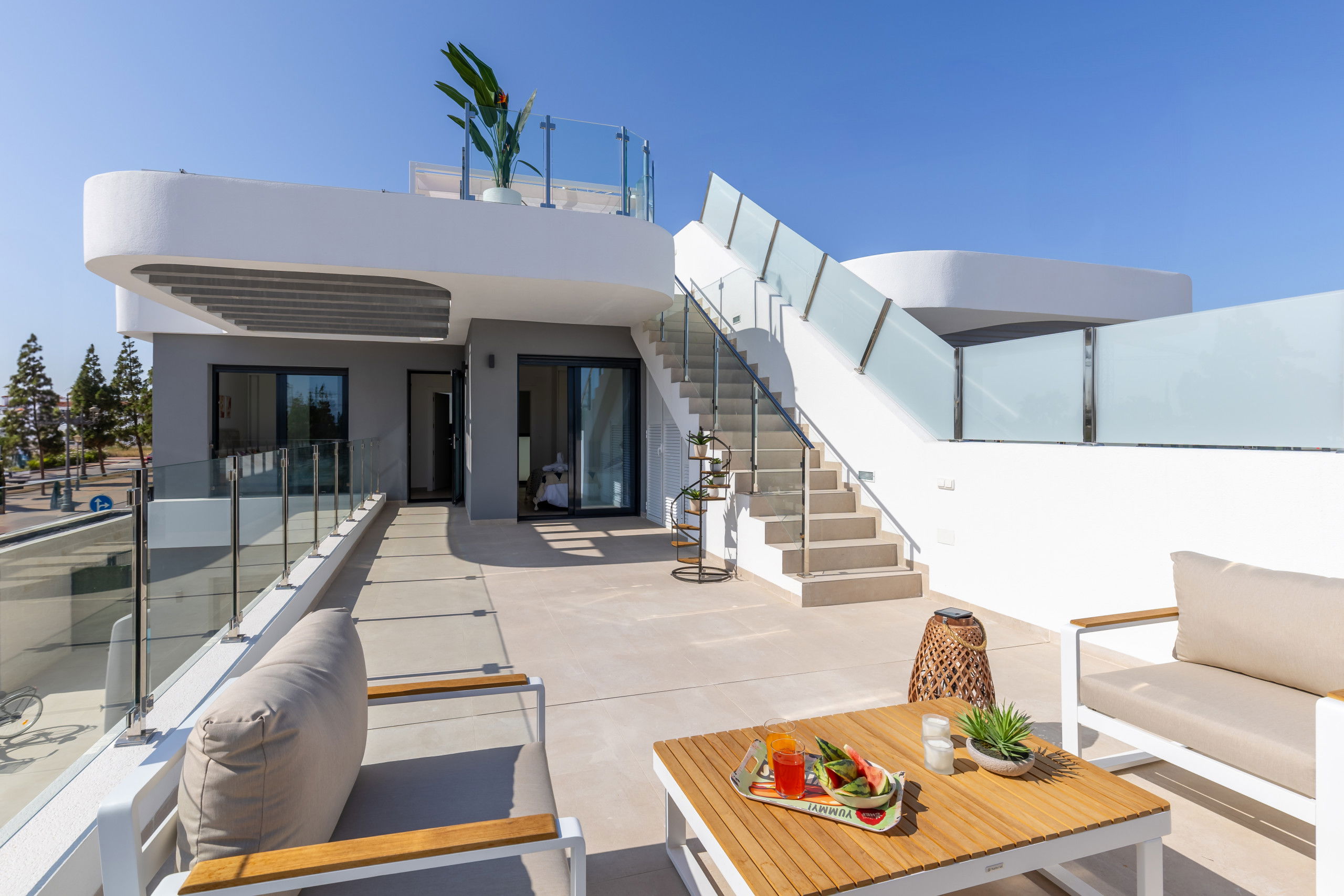 Les 3 terrasses spacieuses sont idéales pour profiter du bon temps et des réunions en plein air, zone de salle à manger sur la terrasse, zone de chaises longues, zone de canapés sur la terrasse du premier étage et les magnifiques vues du solarium avec zone de canapés pour se détendre lors des soirées d'été, complétées par deux salons qui offrent des espaces parfaits pour se reposer ou recevoir des invités.