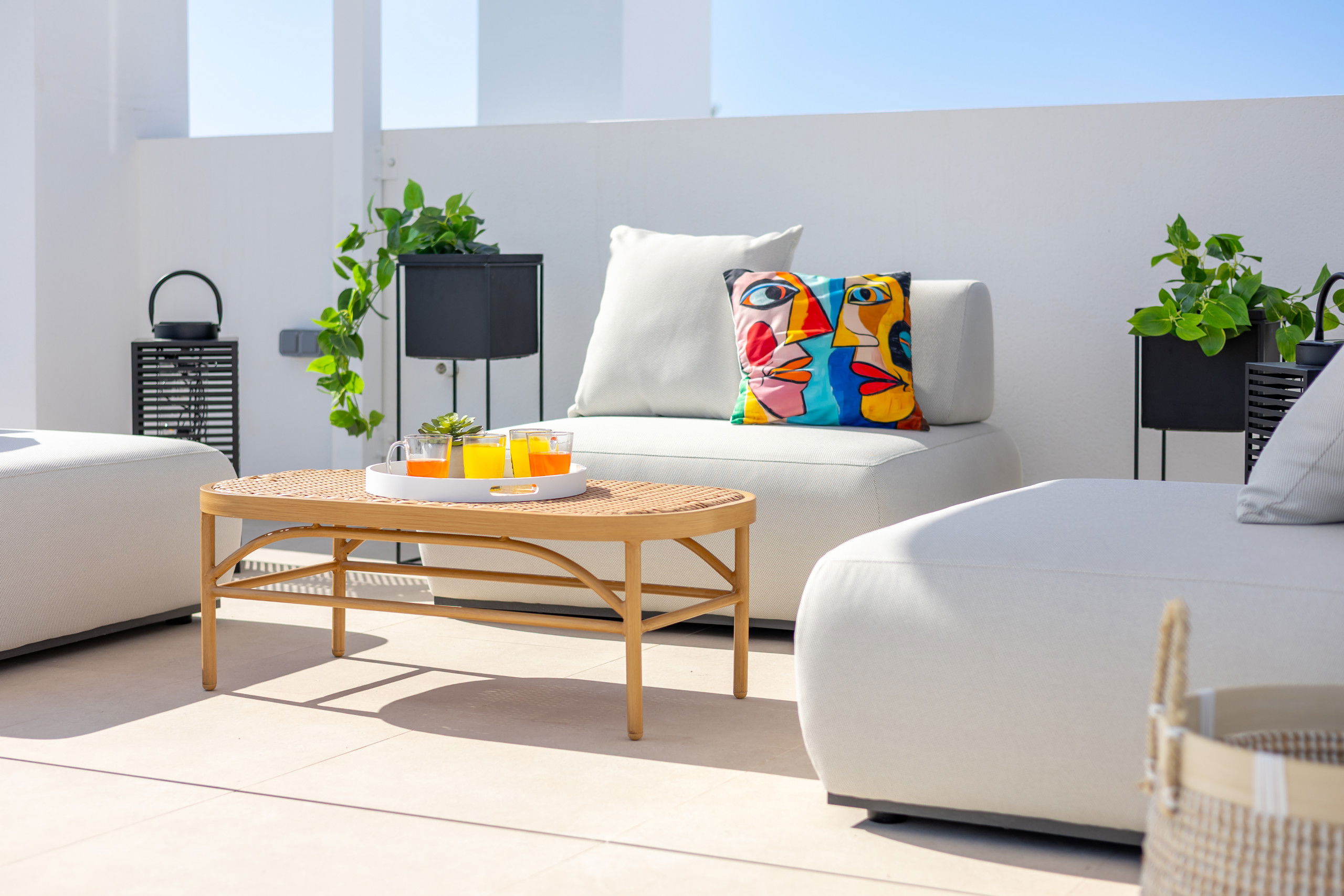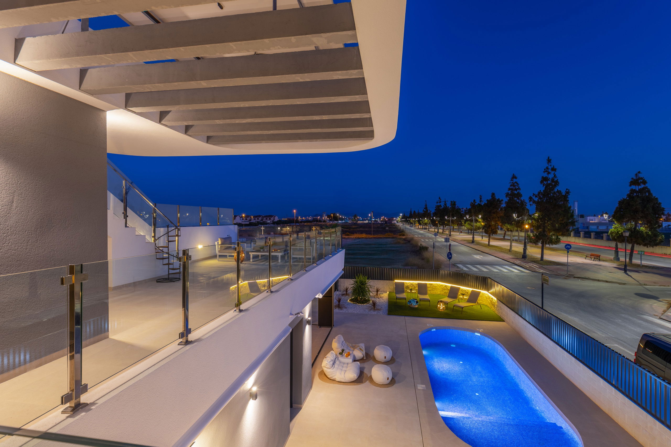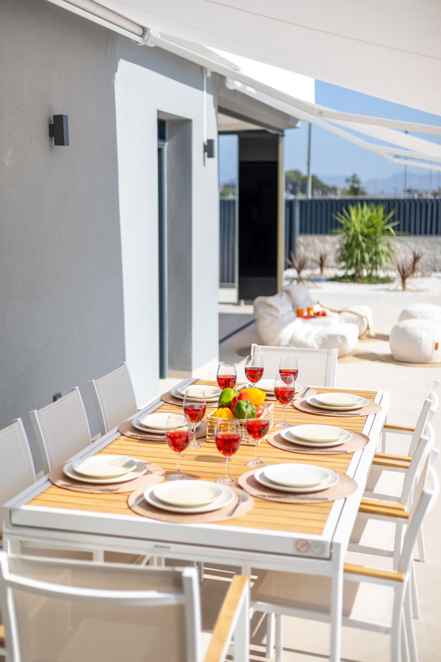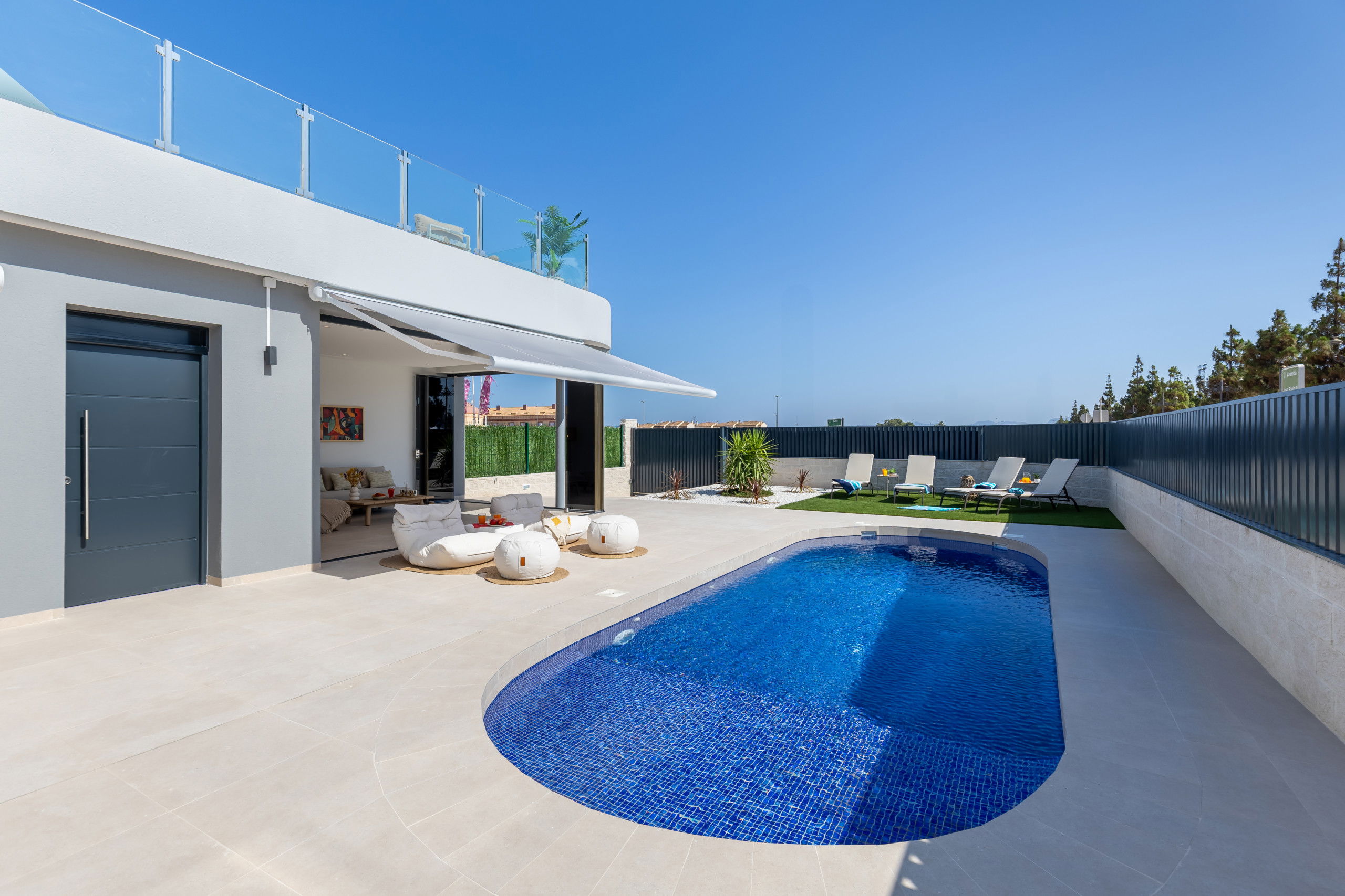 Les 3 terrasses spacieuses sont idéales pour profiter du bon temps et des réunions en plein air, zone de salle à manger sur la terrasse, zone de chaises longues, zone de canapés sur la terrasse du premier étage et les magnifiques vues du solarium avec zone de canapés pour se détendre lors des soirées d'été, complétées par deux salons qui offrent des espaces parfaits pour se reposer ou recevoir des invités.
