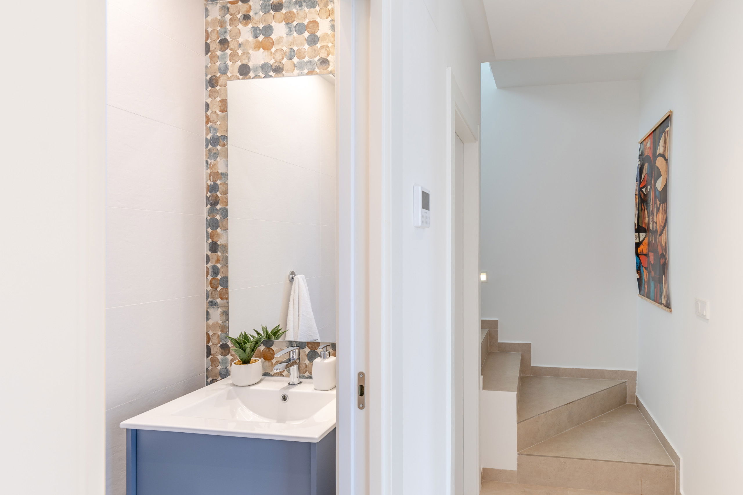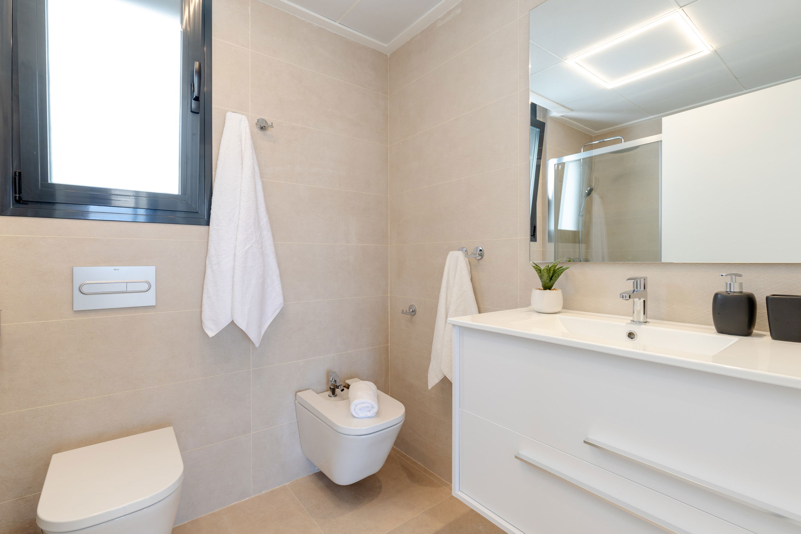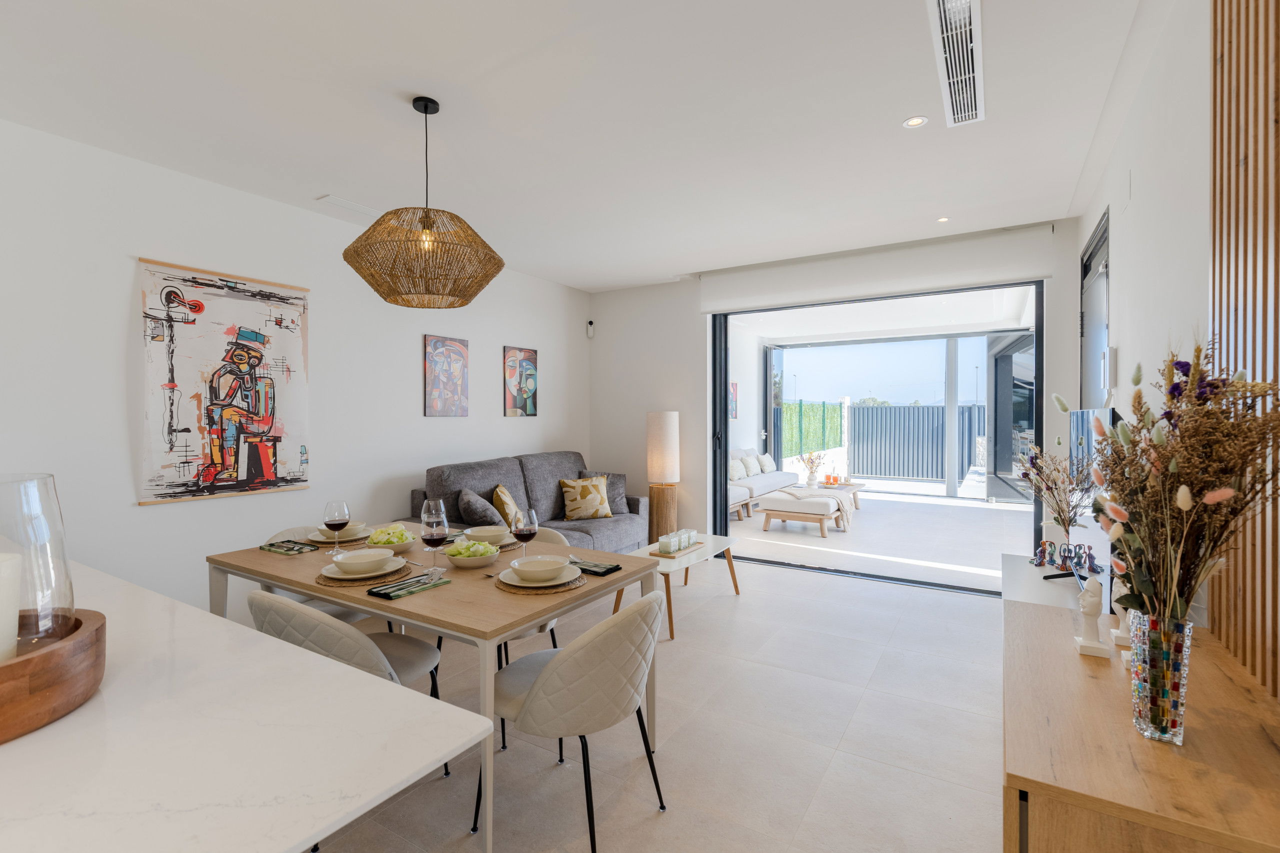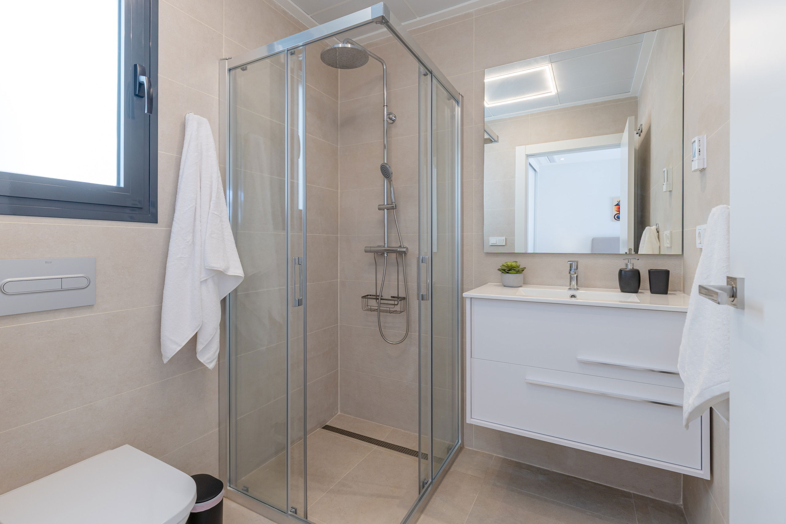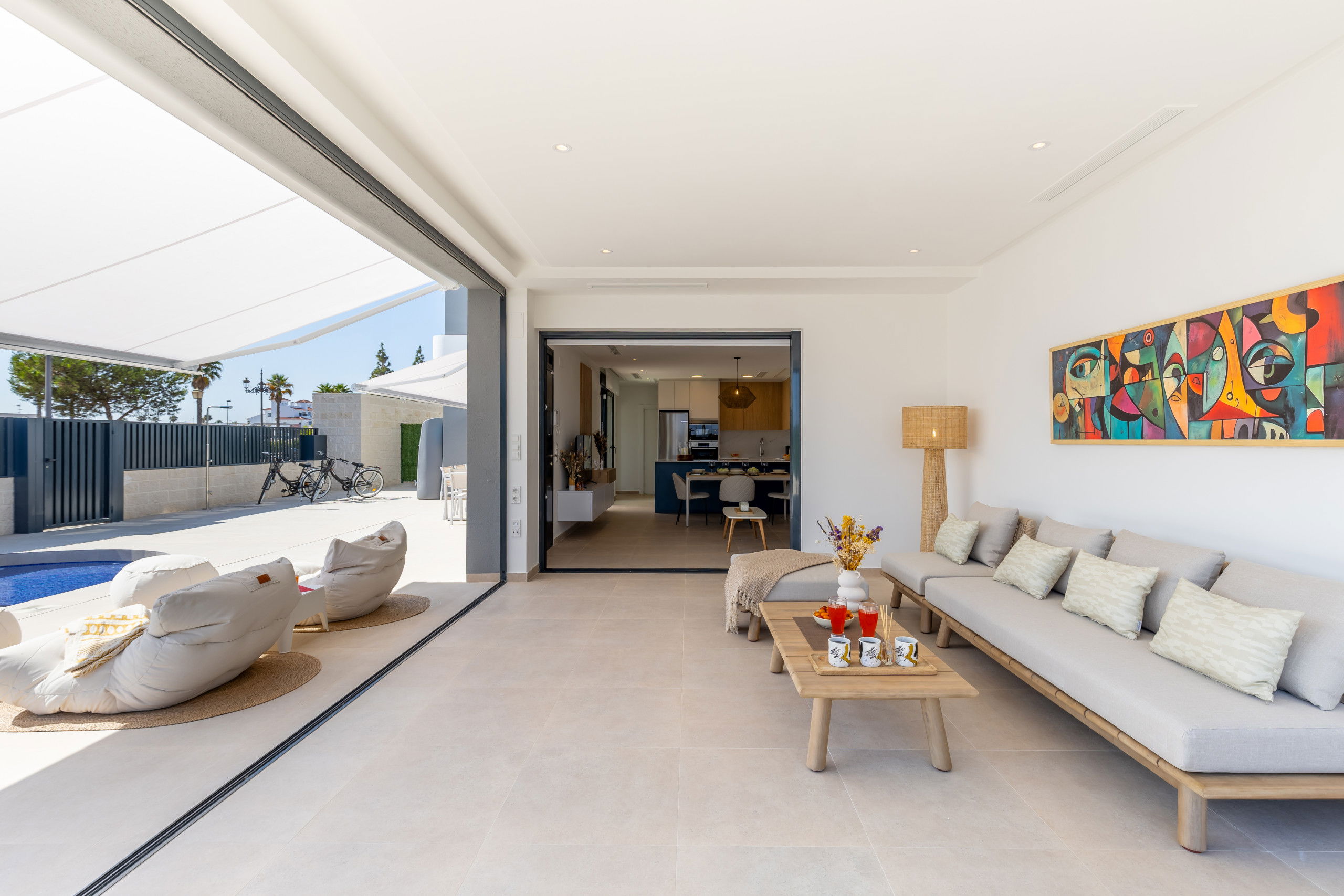 Les 3 terrasses spacieuses sont idéales pour profiter du bon temps et des réunions en plein air, zone de salle à manger sur la terrasse, zone de chaises longues, zone de canapés sur la terrasse du premier étage et les magnifiques vues du solarium avec zone de canapés pour se détendre lors des soirées d'été, complétées par deux salons qui offrent des espaces parfaits pour se reposer ou recevoir des invités.