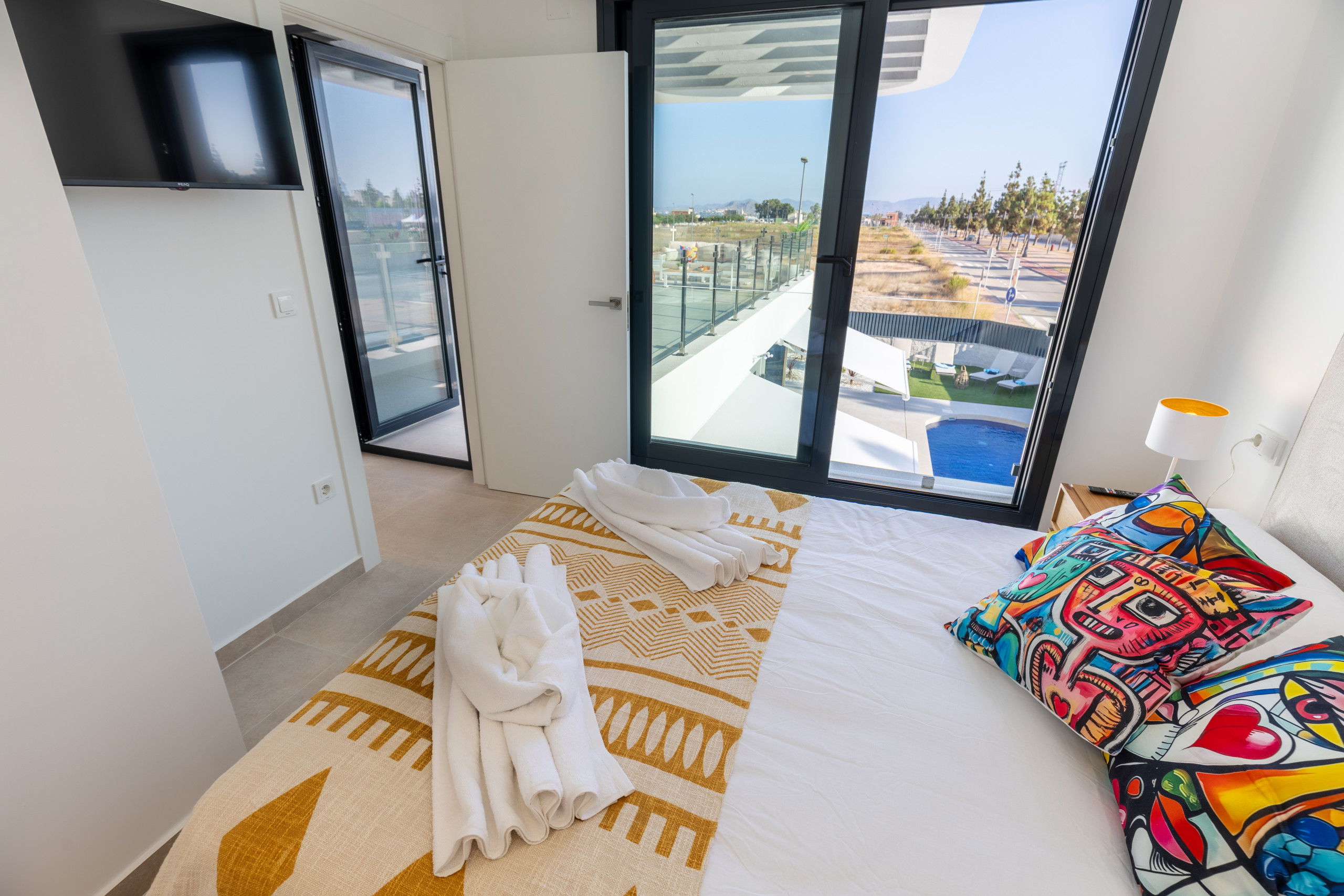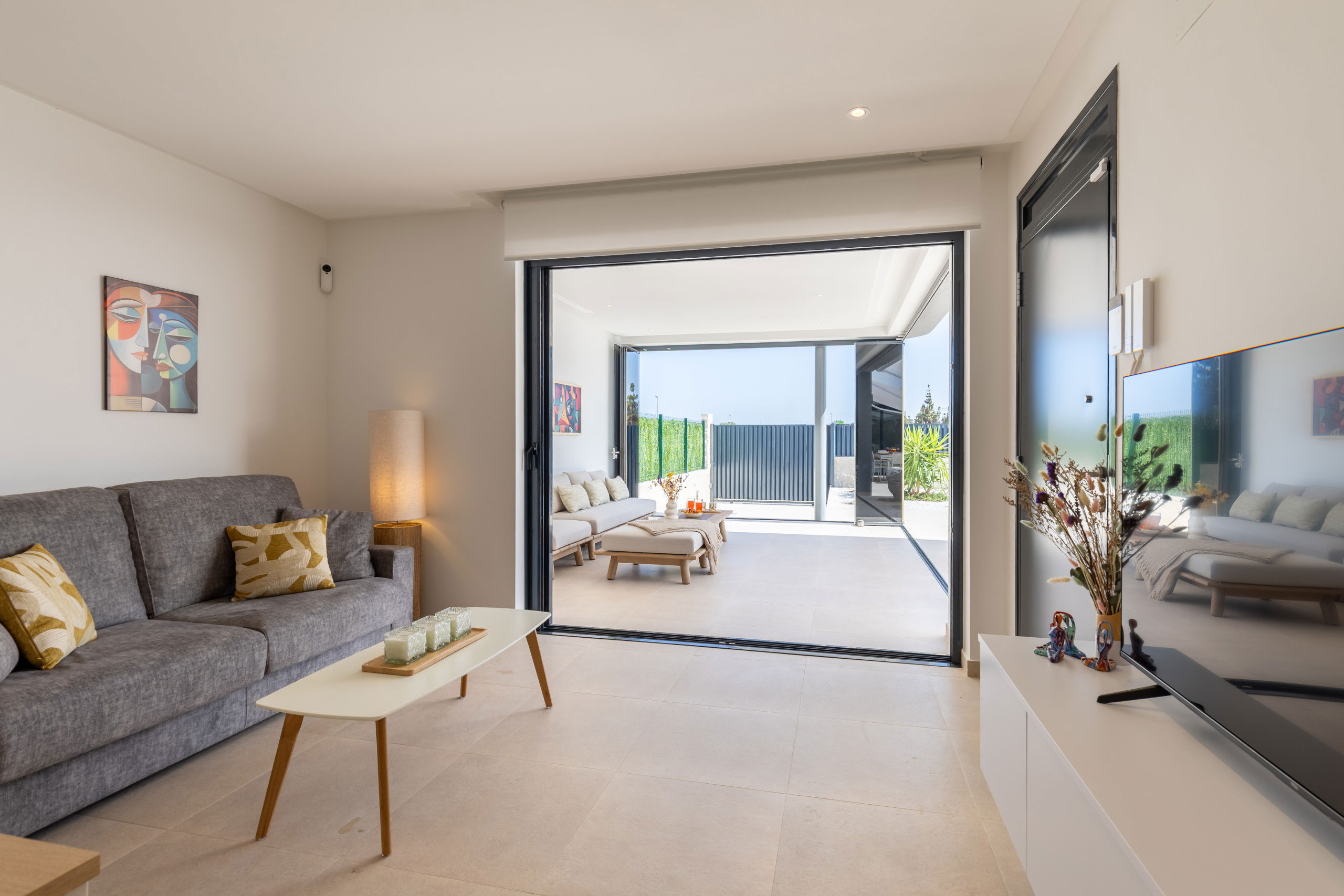 Son intérieur offre trois chambres spacieuses, deux salles de bains et un toilette supplémentaire, tous équipés de téléviseurs dans chaque chambre pour un confort maximal. La propriété dispose de la climatisation dans toutes les pièces, assurant une température idéale à tout moment.