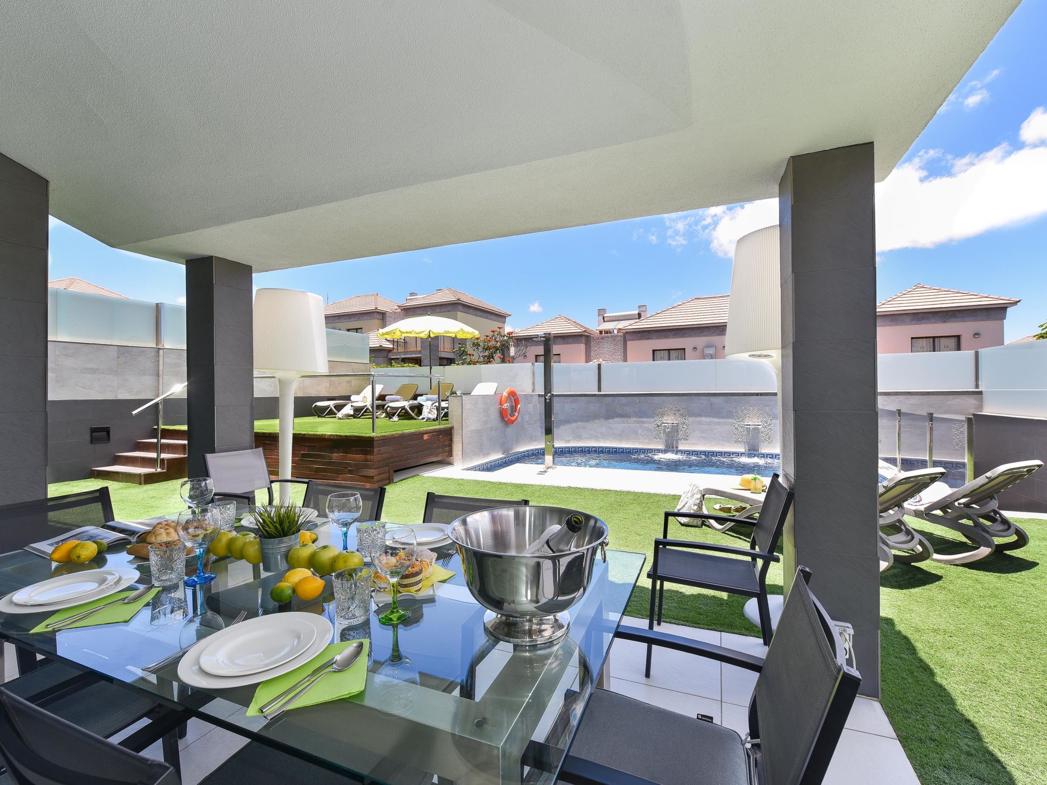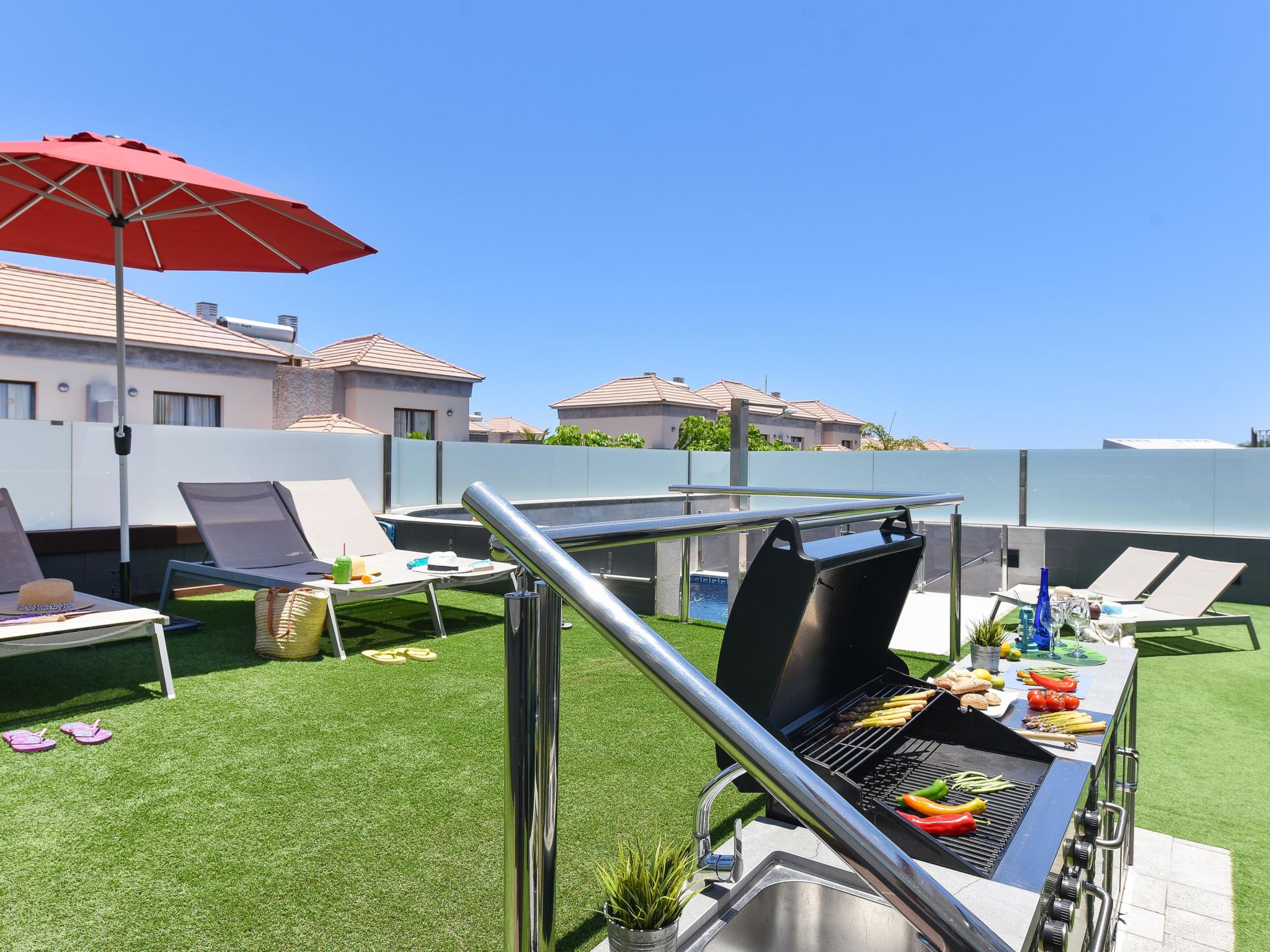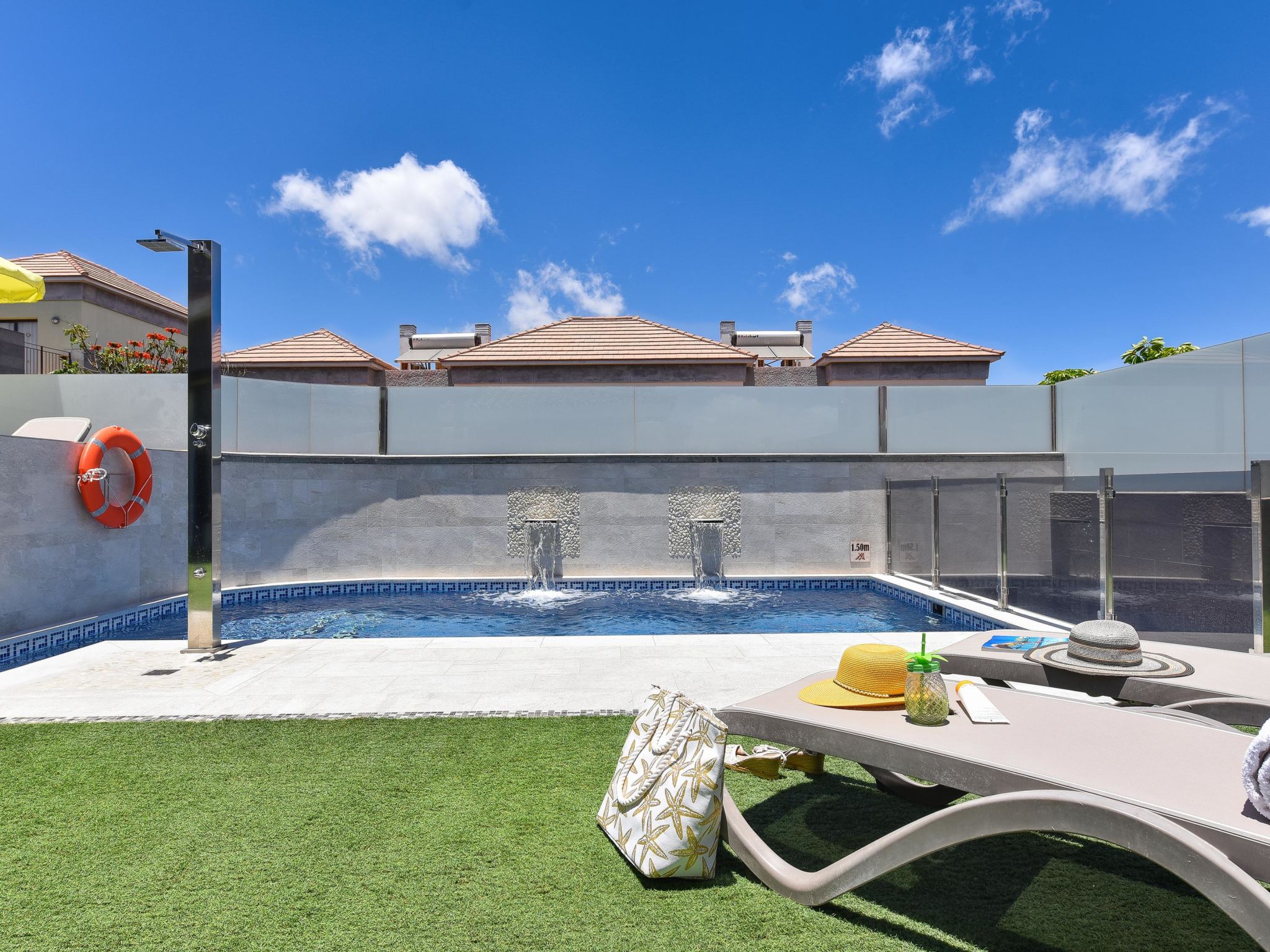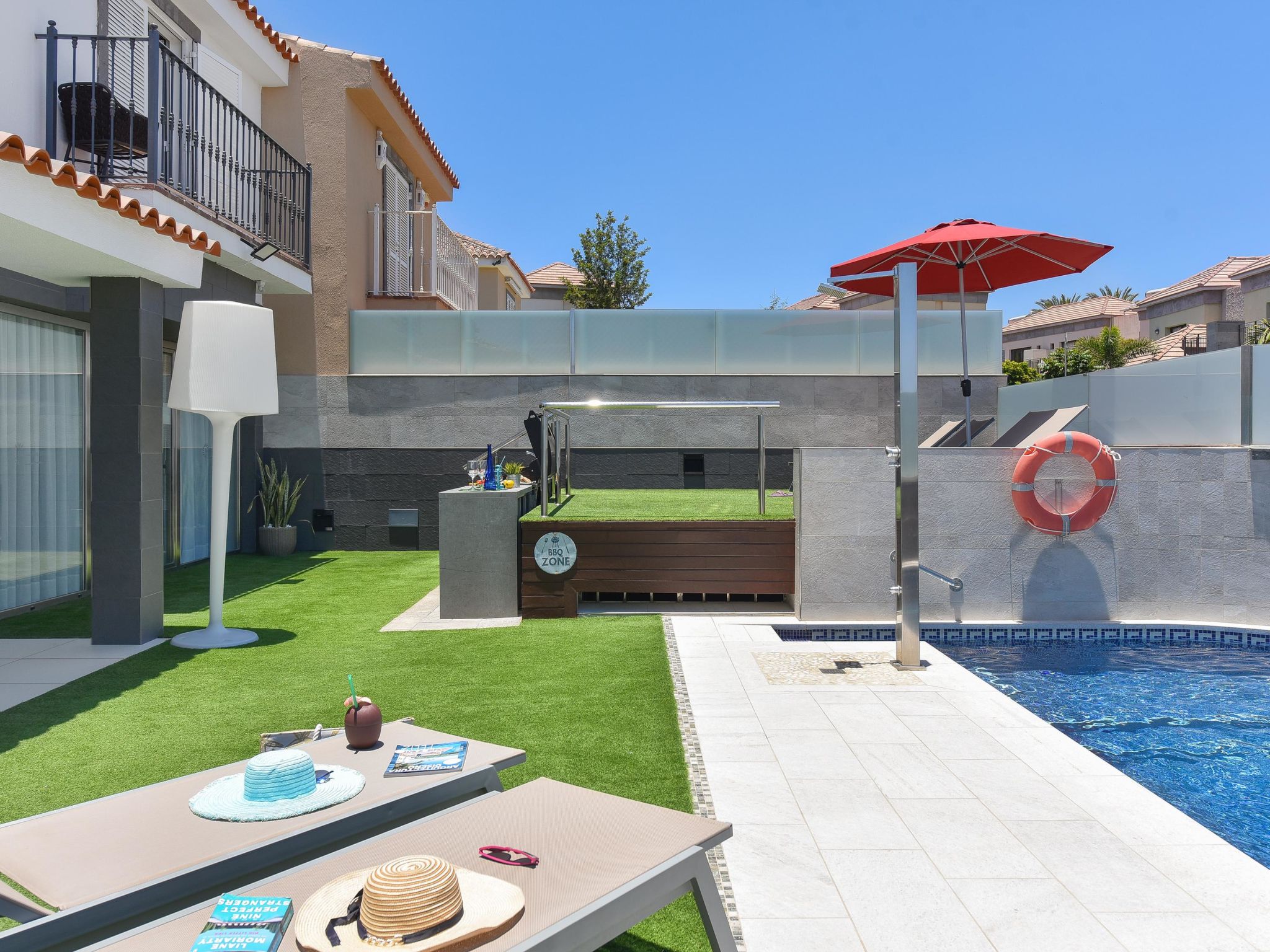 Maison individuelle moderne, luxueuse "Meloneras Hills 19". Au centre de Meloneras, en bordure de la localité Maspalomas, situation centrale, tranquille dans un quartier résidentiel, excellente situation: centrale mais tranquille. A usage privé: jardin (clôturé), piscine (4 x 2 m, profondeur 1 - profondeur 60 cm, disponibilité saisonnière: 01.Jan. - 31.Dec.). Douche extérieure, place de parking près de la maison. Magasins, magasin d'alimentation, supermarché 500 m, restaurant 100 m, arrêt de bus "Faro de Maspalomas" 1.2 km, plage de sable "300". Terrain de golf (18 trous) 2.4 km, tennis 500 m. Veuillez noter: voiture recommandée. Équipement pour bébés sur demande. Le propriétaire n'accepte pas les groupes de jeunes. Aéroport 33 km de la maison.