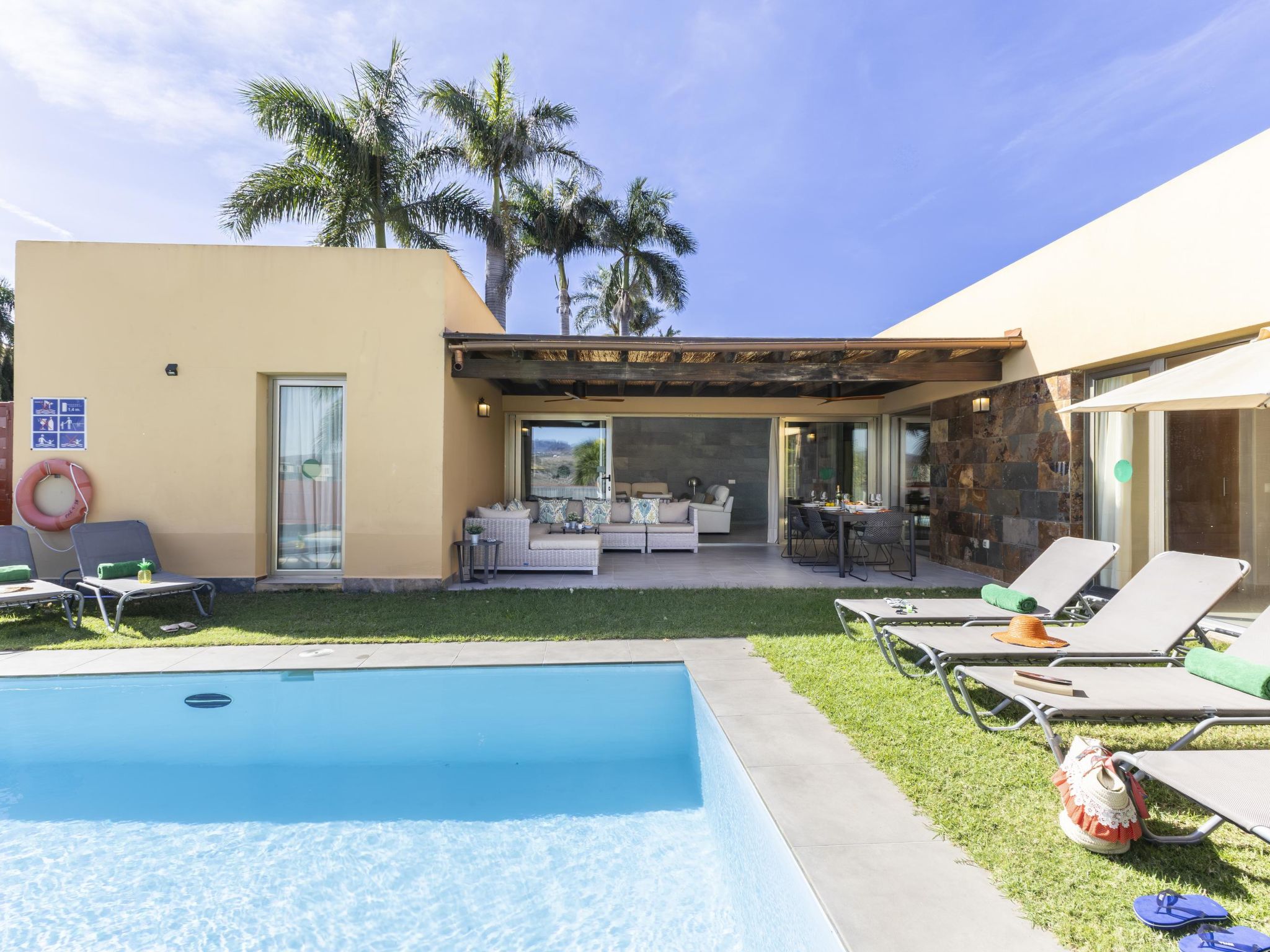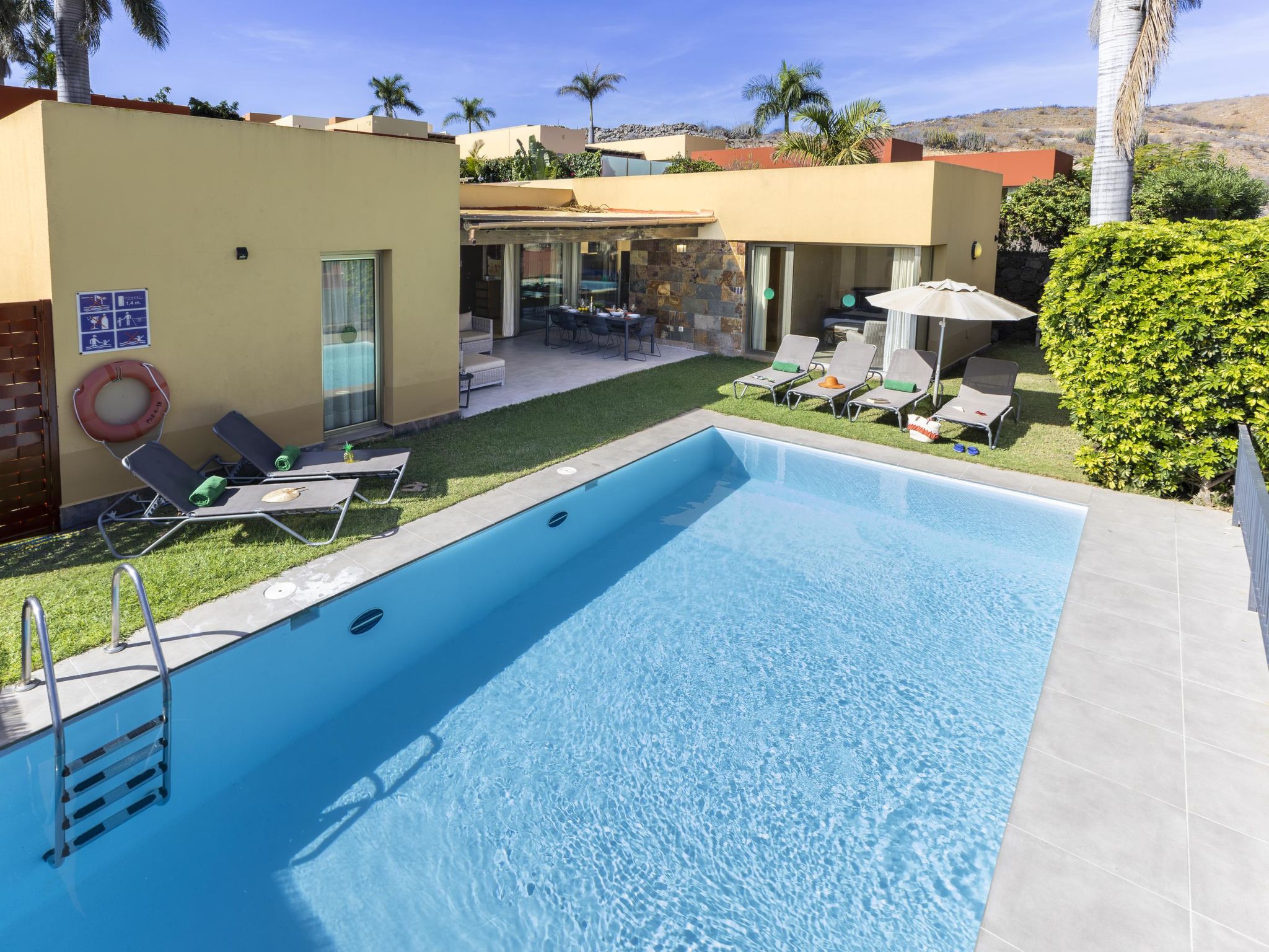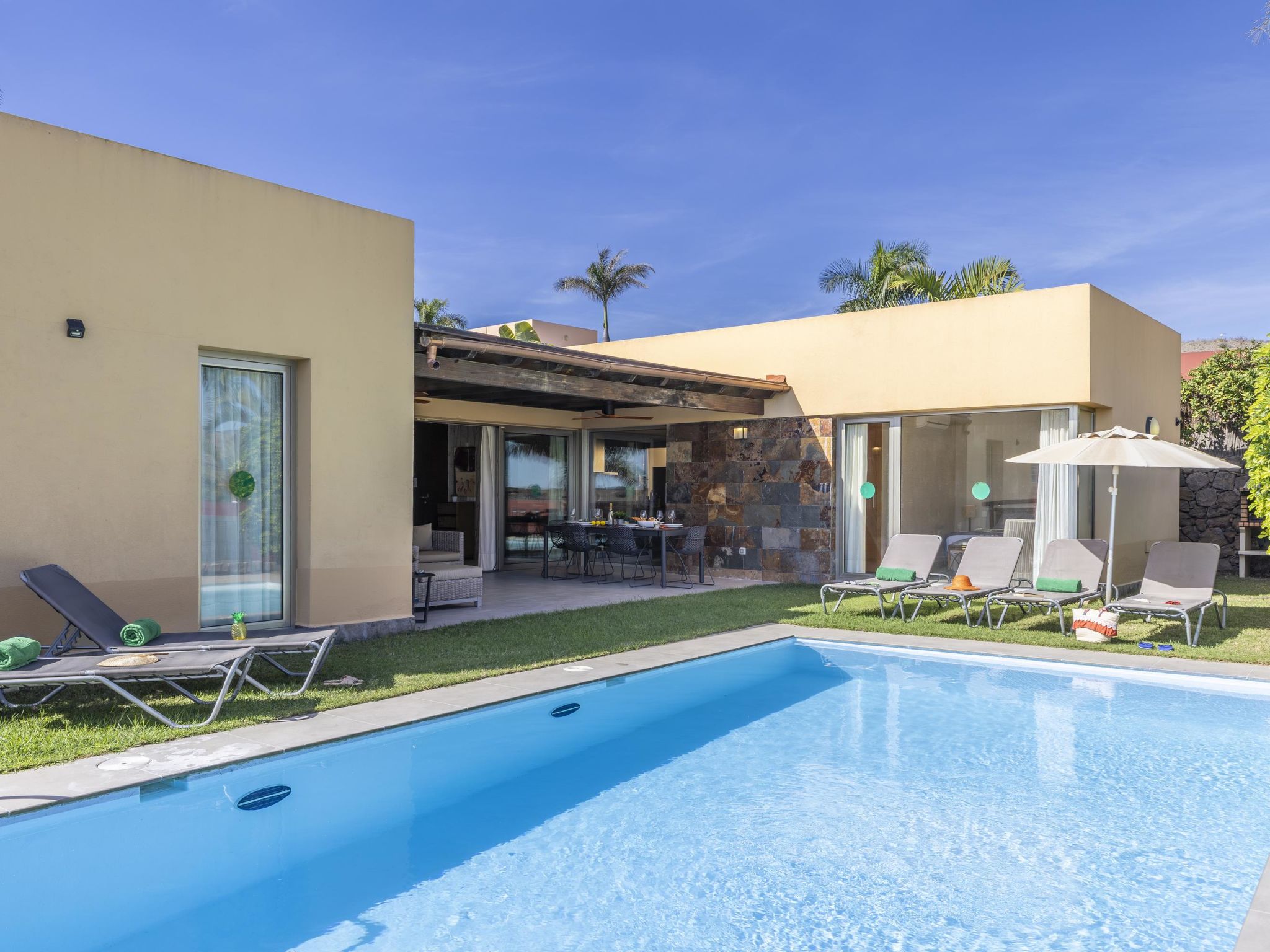 Villa moderne, confortable "Par4 Villa 18". Au centre de Salobre Golf Resort Maspalomas 5 km Meloneras 7 km, situation tranquille, ensoleillée, surélevée. A usage privé: terrain 380 m2 (clôturé), jardin 80 m2, pré, piscine (8 x 4 m, disponibilité saisonnière: 01.Jan. - 31.Dec.). Barbecue. Infrastructures de la Maison: lave-linge, sèche-linge. Magasins 4 km, supermarché 3 km, restaurant 200 m, arrêt de bus "Las Crucitas" 19 km, plage de sable "3000". Terrain de golf (18 trous) 50 m. Veuillez noter: voiture recommandée. Adapté(e) aux familles, indiqué pour séniors. Le propriétaire n'accepte pas les groupes de jeunes.