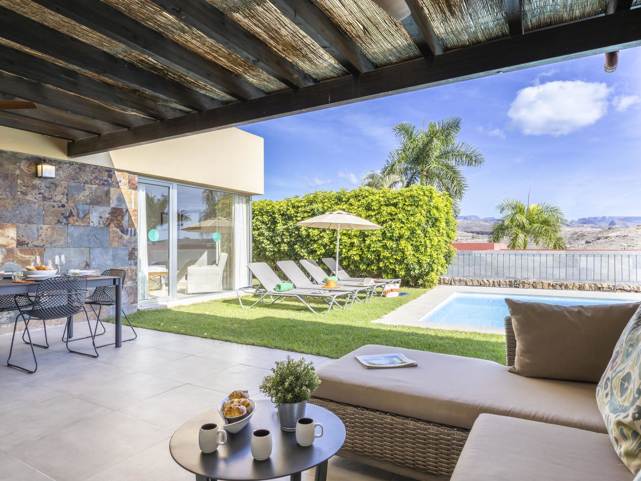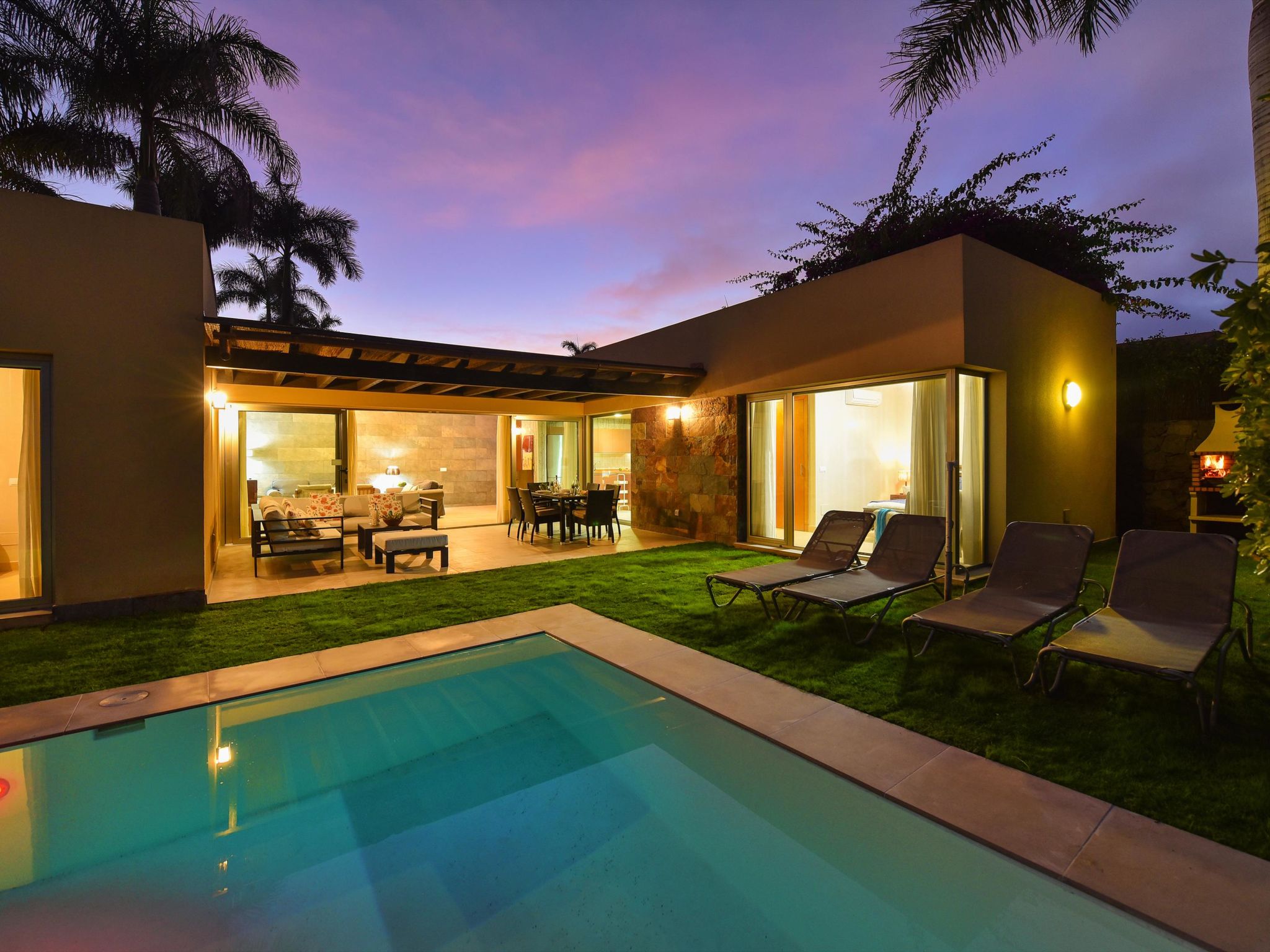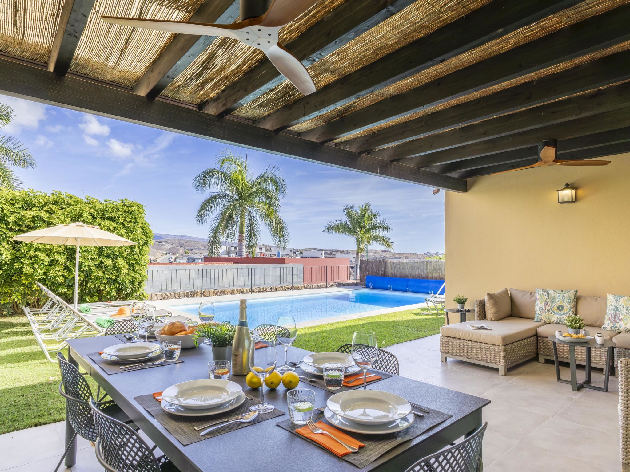 Villa moderne, confortable "Par4 Villa 18". Au centre de Salobre Golf Resort Maspalomas 5 km Meloneras 7 km, situation tranquille, ensoleillée, surélevée. A usage privé: terrain 380 m2 (clôturé), jardin 80 m2, pré, piscine (8 x 4 m, disponibilité saisonnière: 01.Jan. - 31.Dec.). Barbecue. Infrastructures de la Maison: lave-linge, sèche-linge. Magasins 4 km, supermarché 3 km, restaurant 200 m, arrêt de bus "Las Crucitas" 19 km, plage de sable "3000". Terrain de golf (18 trous) 50 m. Veuillez noter: voiture recommandée. Adapté(e) aux familles, indiqué pour séniors. Le propriétaire n'accepte pas les groupes de jeunes.
