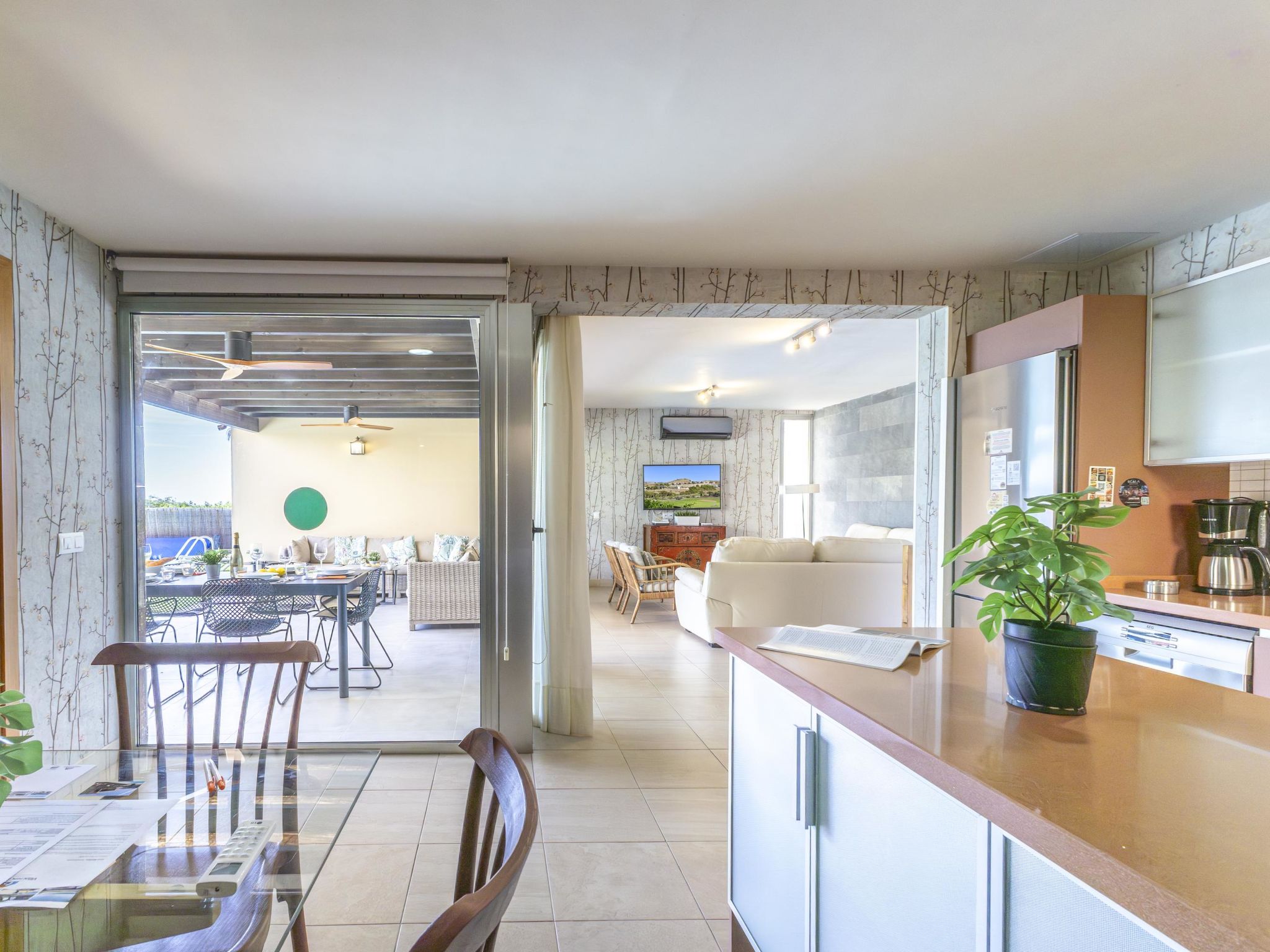 "Tipo 3 dormitorios", maison 4 pièces 115 m2. Aménagement confortable et agréable: séjour/salle à manger avec TV (satellite), Télévision numérique, DVD et air-conditionné. 1 chambre avec 1 grand-lit, douche/WC et air-conditionné. 2 chambres doubles, chaque chambre avec: 2 lits, douche/WC et air-conditionné. Cuisine ouverte (four, lave-vaisselle, 4 plaques vitrocéramiques, grille-pain, micro-ondes, congélateur) avec table pour les repas, air-conditionné. Sol en parquet. Vue sur la piscine. A disposition: lave-linge, sèche-linge, coffre-fort, fer à repasser, chaise haute pour enfant, lit bébé jusqu'à 2 ans, sèche-cheveux. Internet (Connexion WIFI). Adapté(e) aux familles. Maximum 1 animal/ chien autorisé. 2015/3662 // Reg. Nr.: ESFCTU0000350120004735990000000000000VV-35-1-00013127