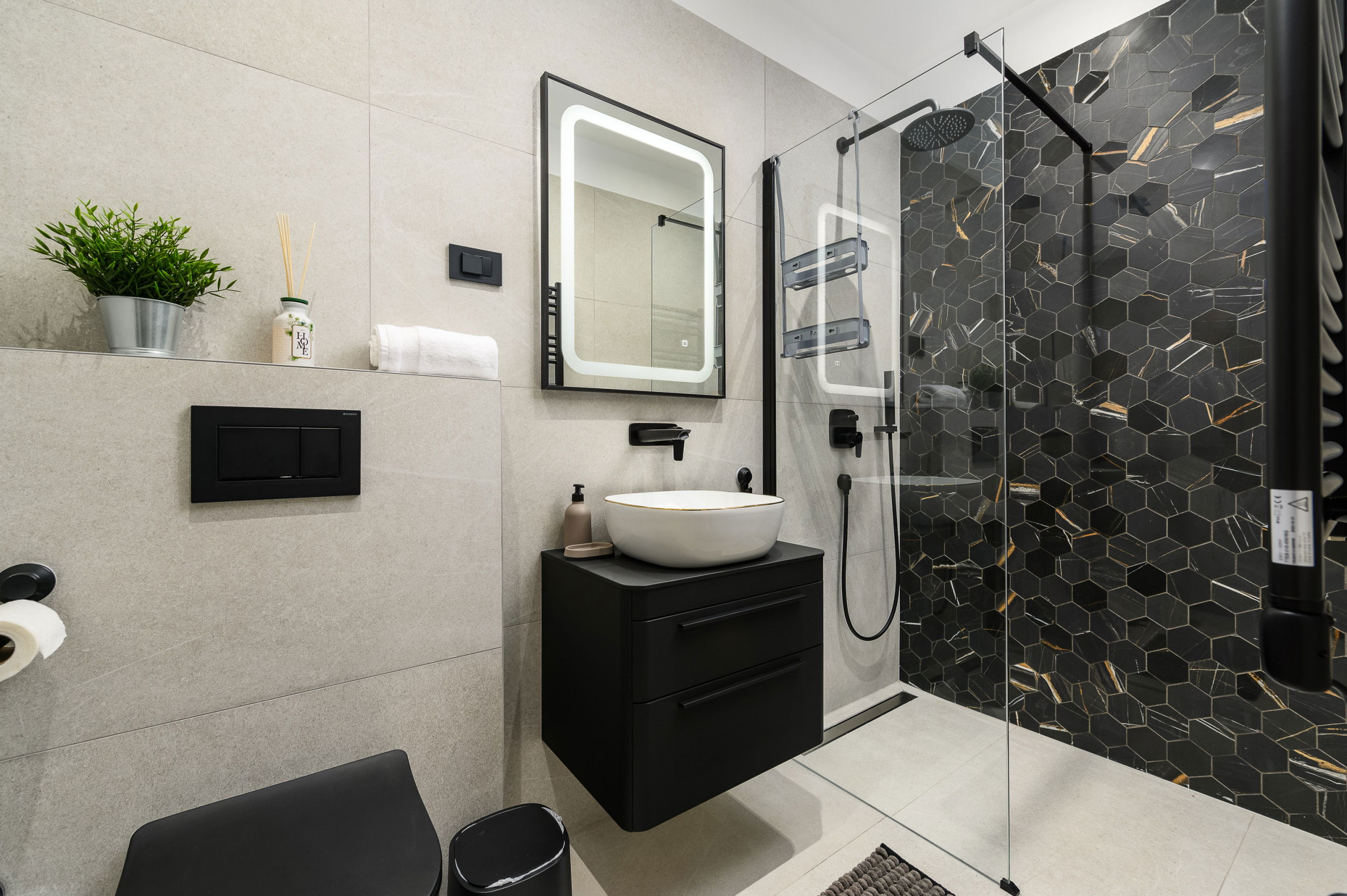 La cuisine américaine, à induction, est équipée avec réfrigérateur, micro-ondes, four, congélateur, lave-vaisselle, vaisselle/couverts, ustensiles/cuisine, cafetière, grille pain et bouilloire.