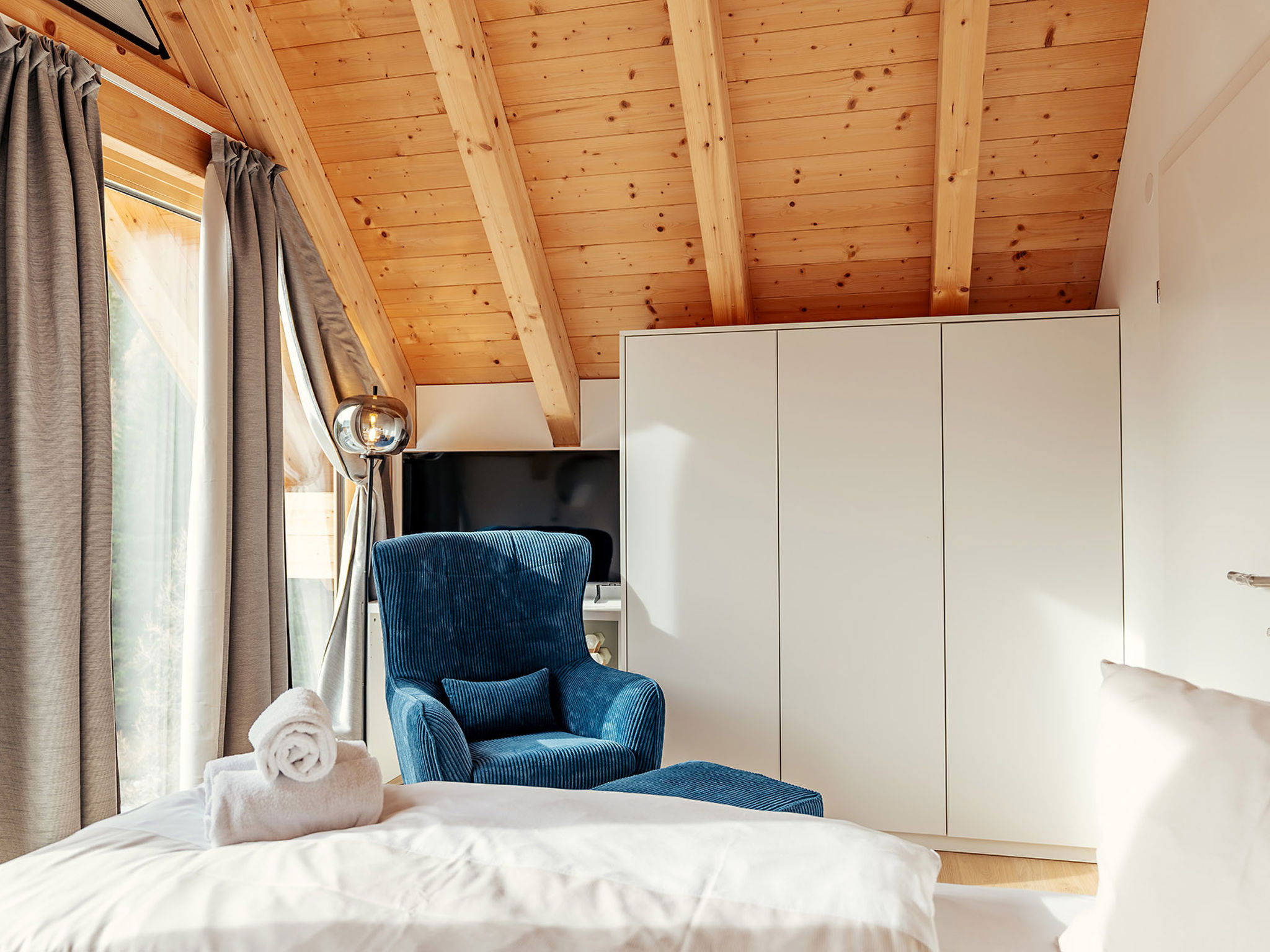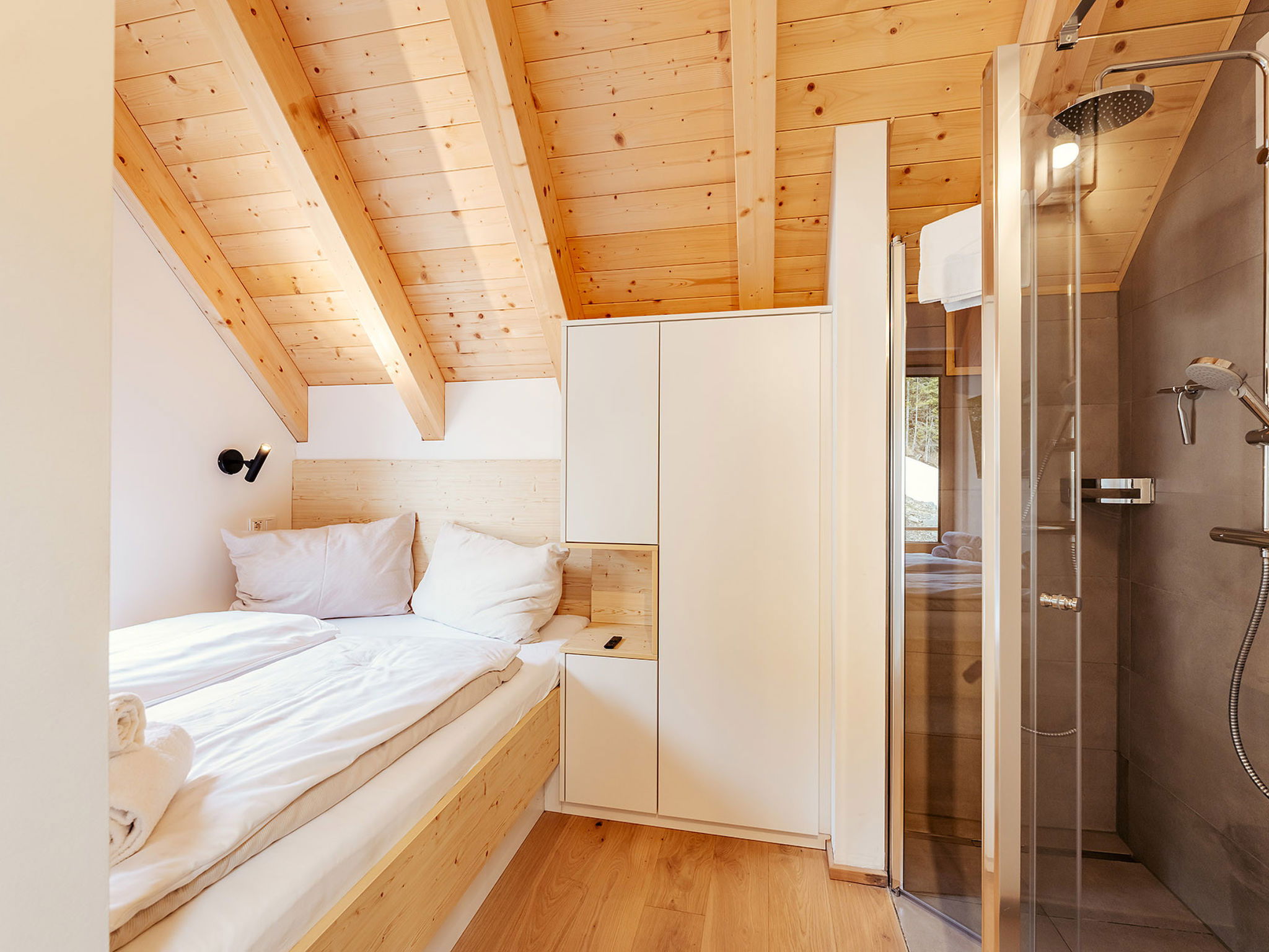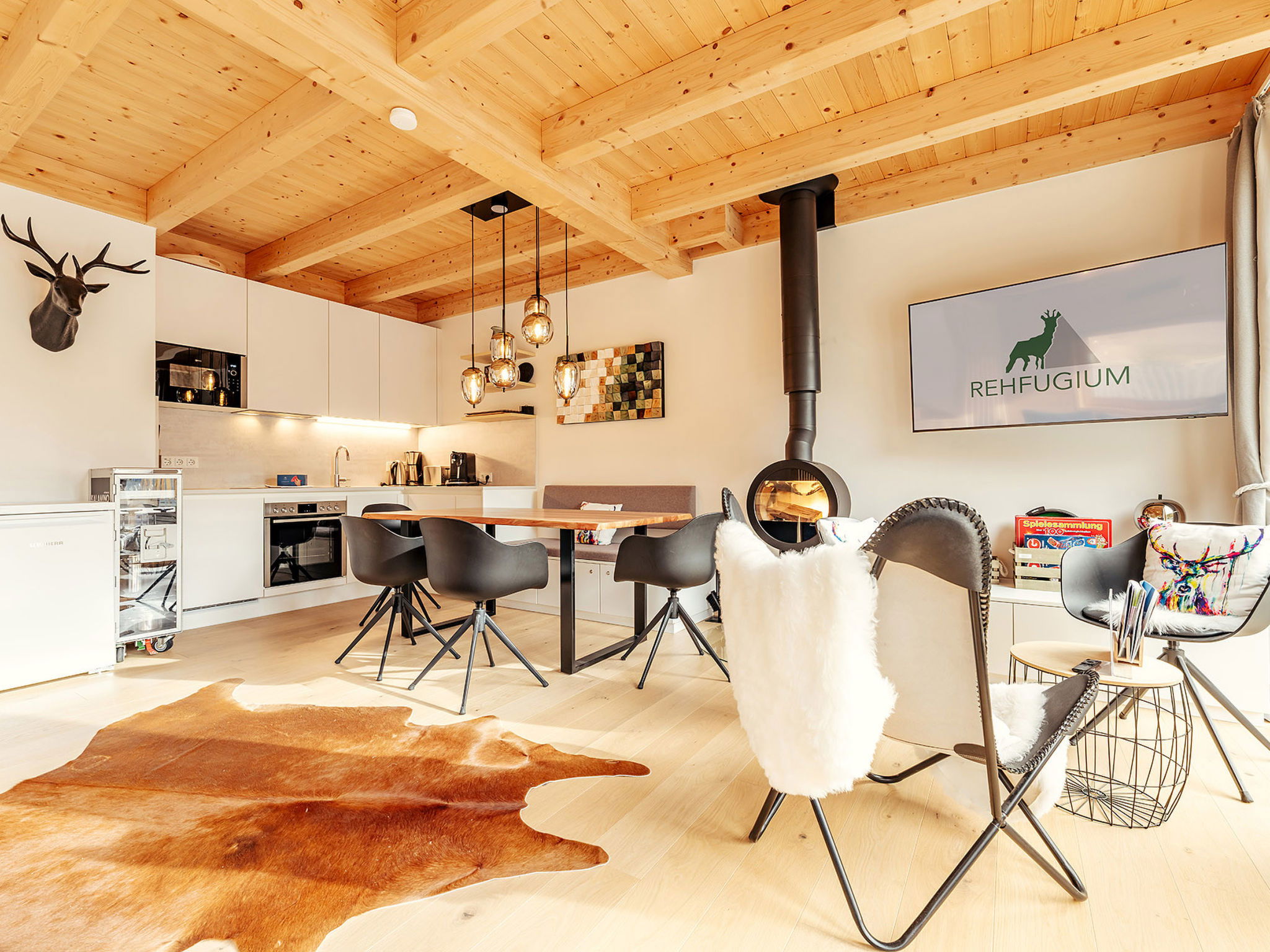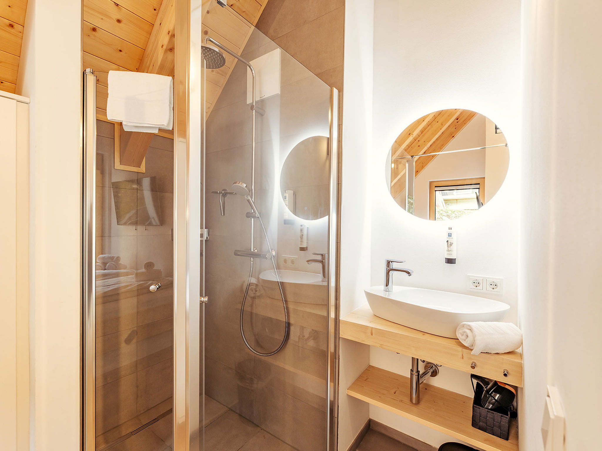 "Chalet Nr. 1 mit 2 Schlafzimmern und Sauna", maison 3 pièces 68 m2. Logement idéal pour 6 adultes. 1 chambre avec 1 lit double et TV. 1 chambre avec 1 lit double. Séjour avec 1 divan-lit et 1 lit gigogne. Cuisine, cuisine ouverte (lave-vaisselle, grille-pain, bouilloire électrique, micro-ondes, congélateur, cafetière électrique). 2 douches/WC, 2 WC séparés. Terrasse. A disposition: sauna. Veuillez noter: logement non-fumeur. Maximum 2 animaux/ chiens autorisés.
