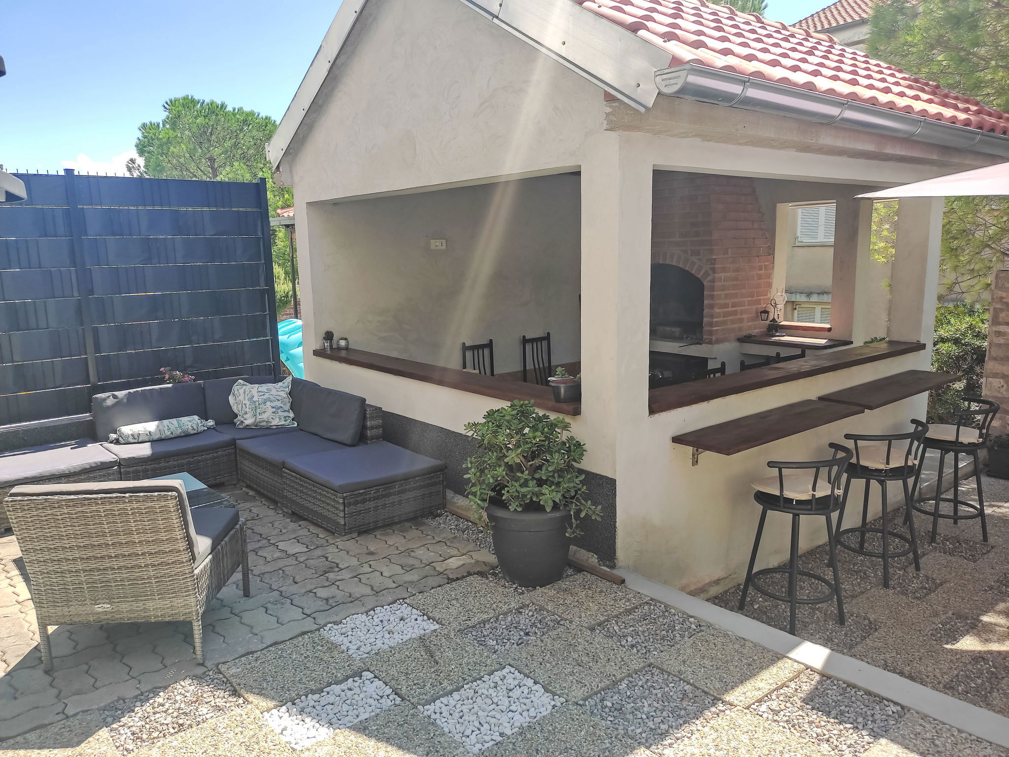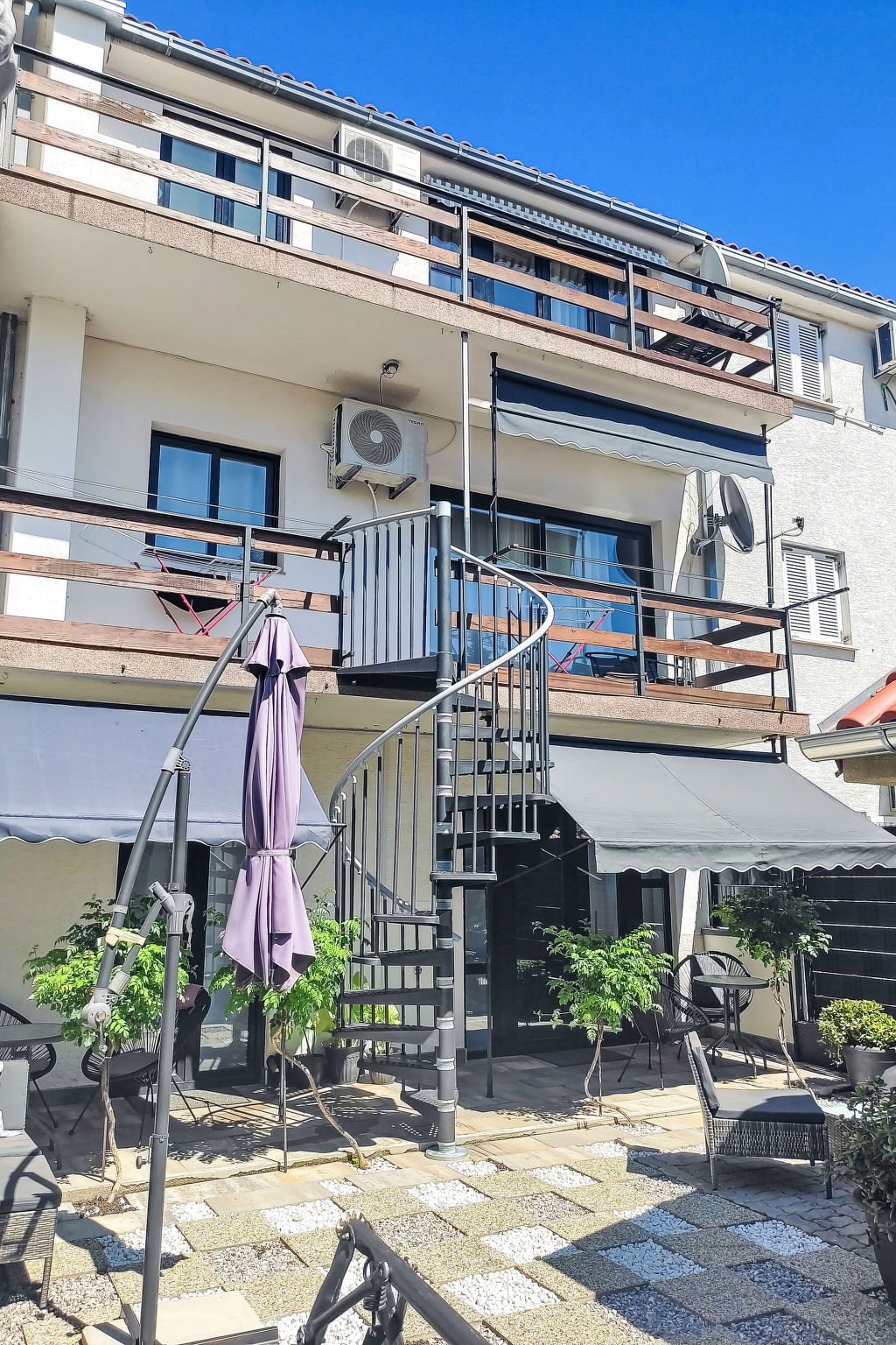 Novi Vinodolski: Immeuble "Deleut", de 3 étages. À 1 km du centre de Novi Vinodolski, à 1.8 km de la mer, à 1.8 km de la plage. En commun: terrain 400 m2 (clôturé). Terrasse (50 m2), barbecue, espace barbecue. Infrastructures de la Maison: accès internet, lave-linge. Place de parking près de la maison sur le terrain. Magasins, restaurant 800 m, arrêt de bus 1 km, plage de graviers 1.8 km. Veuillez noter: le propriétaire habite sur le même terrain.