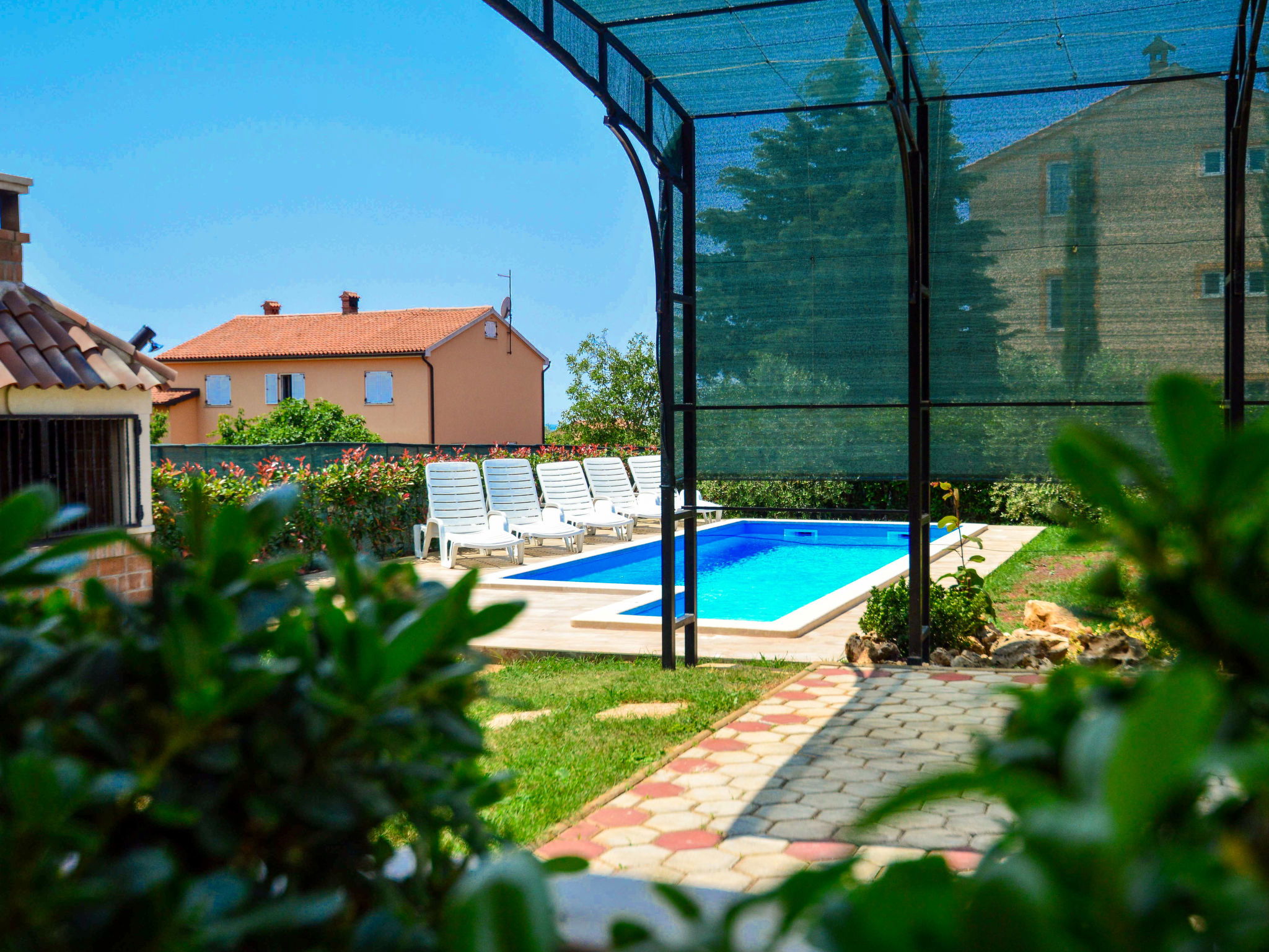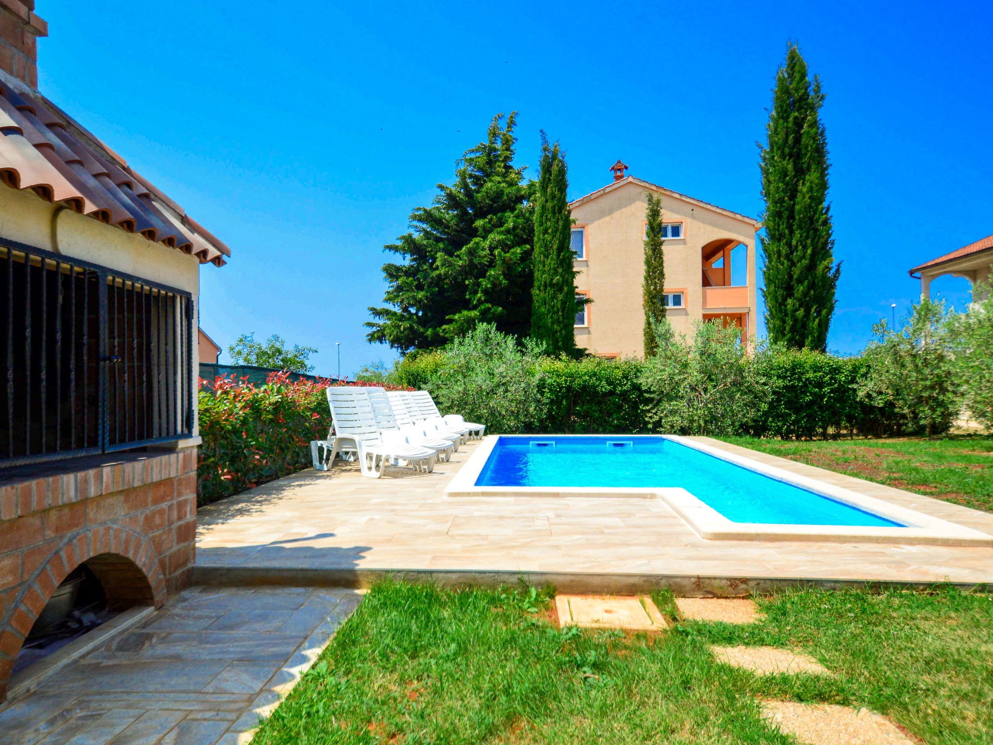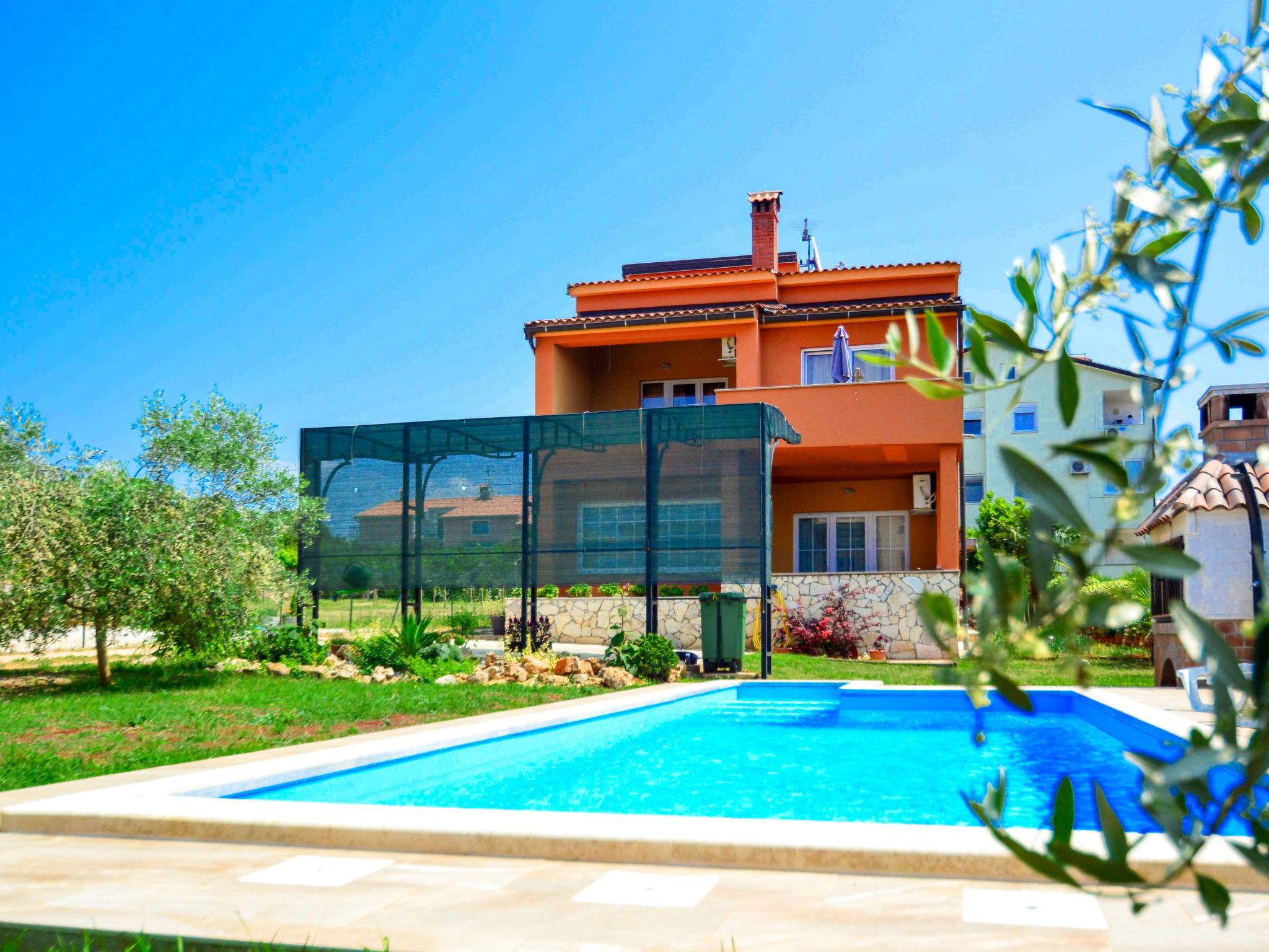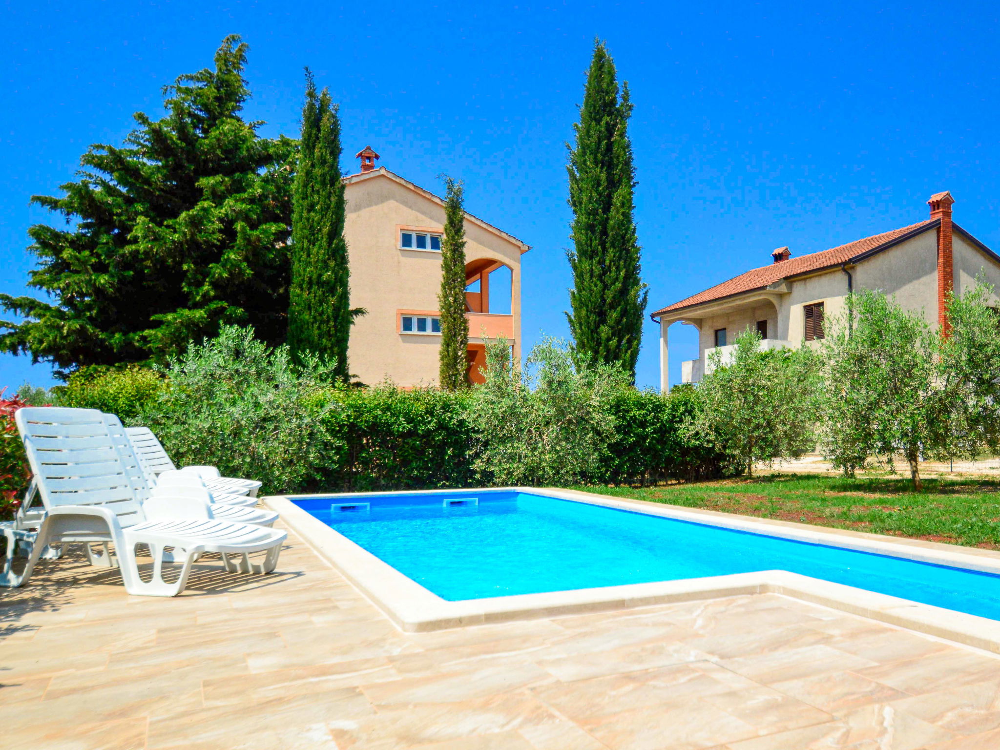 Maison jumelée "Marko", de 3 étages. À 2 km du centre de Novigrad, situation ensoleillée, à 2.5 km de la mer, à 2.5 km de la plage. A usage privé: terrain 400 m2, jardin avec plantes et arbres, piscine rectangulaire (21 m2, profondeur 140 cm, disponibilité saisonnière: 30.Avr. - 15.Oct.) avec marches intérieures. Douche extérieure, barbecue (balançoire). Infrastructures de la Maison: accès internet, lave-linge. Place de parking (pour 3 voitures) près de la maison sur le terrain. Supermarché 2 km, restaurant 2 km, arrêt de bus 2.3 km, plage de graviers 2.5 km, plage de rochers 2.5 km. Terrain de golf (18 trous) 25 km, tennis 2 km. Le propriétaire n'accepte pas les groupes de jeunes.