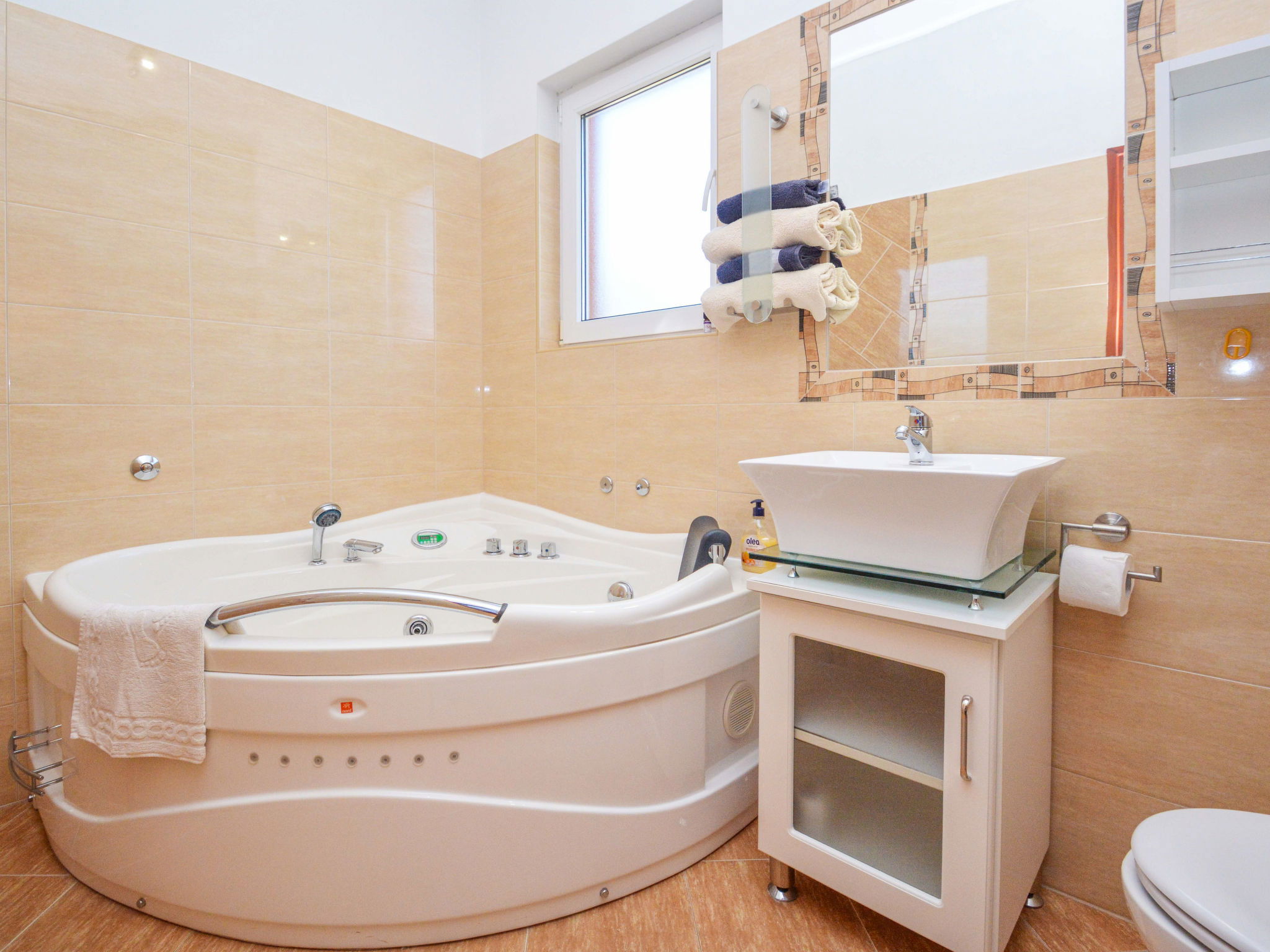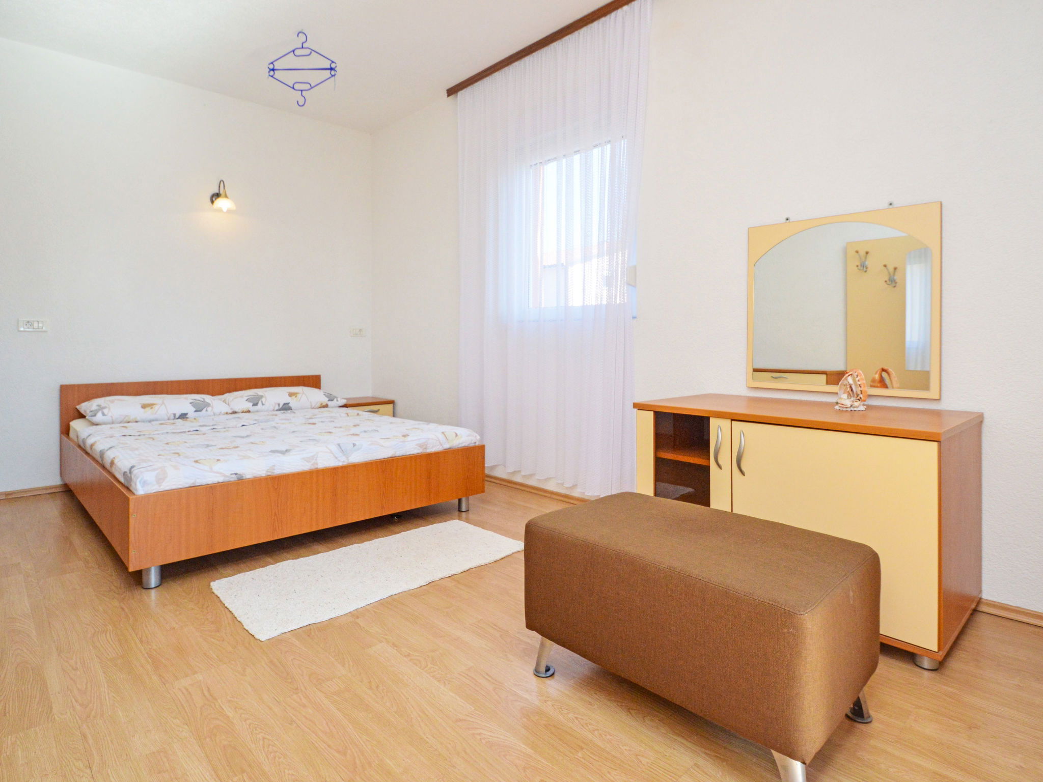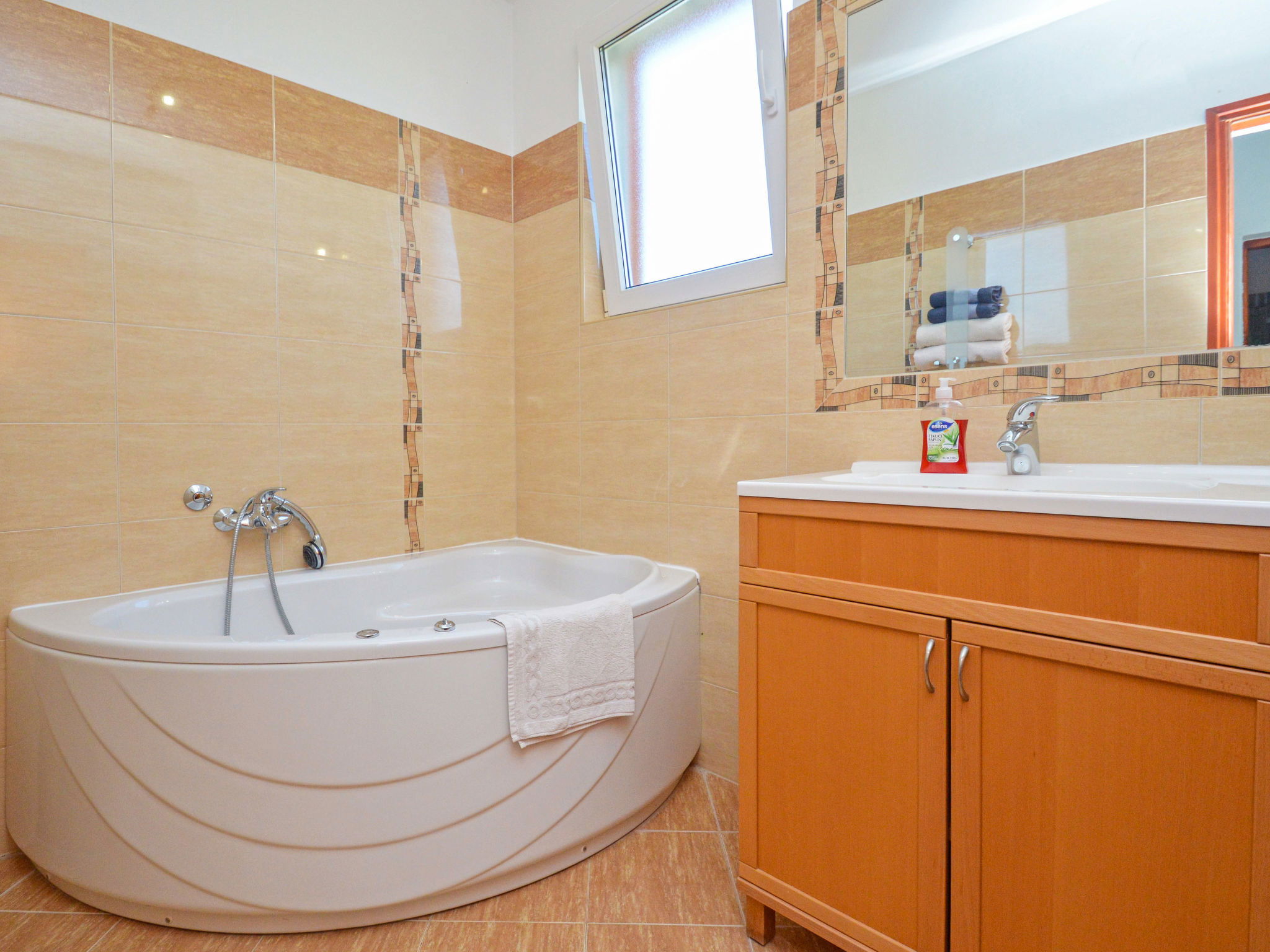 Maison jumelée 5 pièces 140 m2 sur 3 niveaux. Séjour/salle à manger avec cheminée (uniquement à titre de décoration), TV (satellite) et air-conditionné. Sortie sur la terrasse. Cuisine ouverte (four, lave-vaisselle, 4 plaques vitrocéramiques, micro-ondes, congélateur, cafetière électrique). Douche/WC. À l'étage supérieur: 1 chambre avec 1 grand-lit (160 cm, longueur 200 cm). 1 chambre avec 1 lit double (2 x 80 cm, longueur 200 cm), air-conditionné. Sortie sur la terrasse. 1 chambre avec 1 lit double (2 x 80 cm, longueur 200 cm). Sortie sur la terrasse. Bain/WC, balnéo. 2ème étage: 1 chambre avec 1 grand-lit (160 cm, longueur 200 cm). Bain/WC, balnéo. Chauffage à air chaud. Terrasse 11 m2, couverte, 2 terrasses 12 m2, couverte. Meubles de terrasse. Vue partielle sur la mer. A disposition: chaise haute pour enfant, lit bébé. Internet (Connexion WIFI, gratuit). Maximum 1 animal/ chien autorisé.