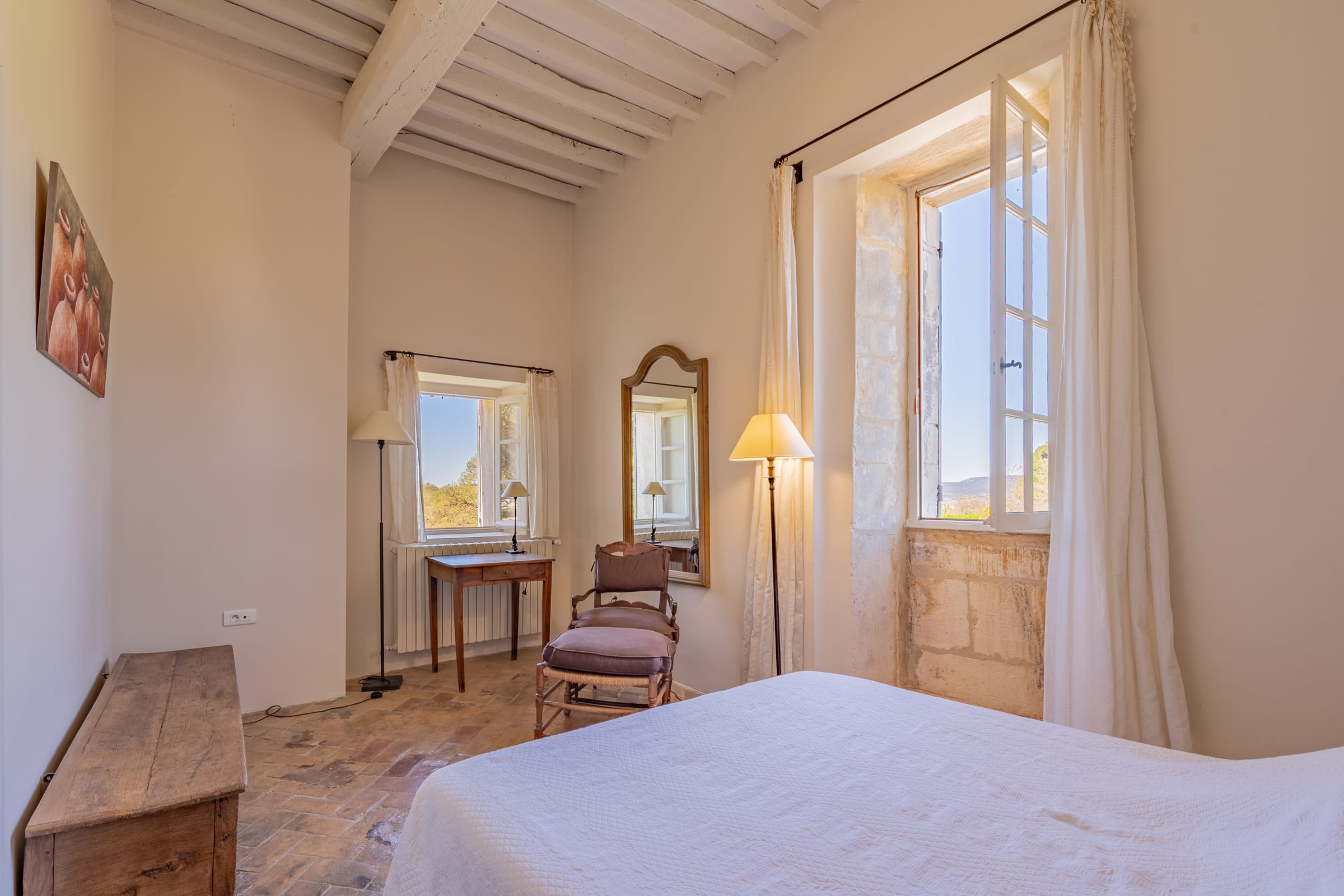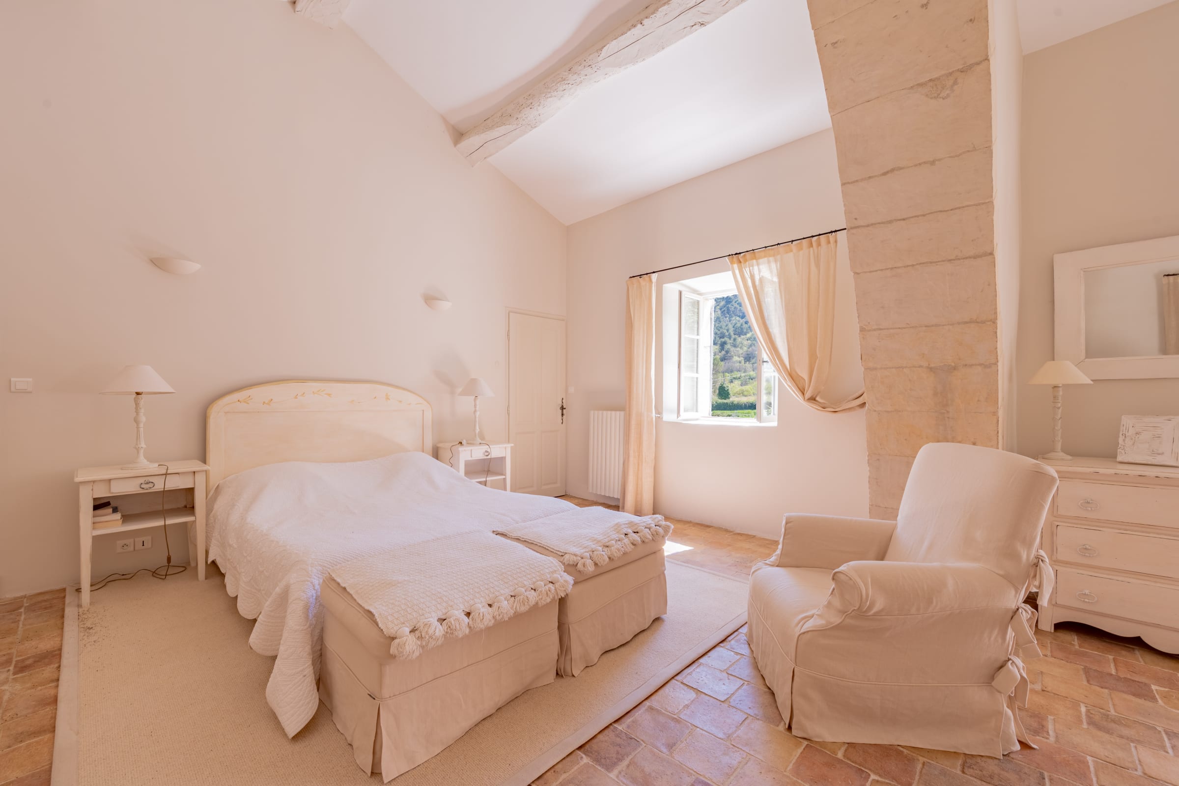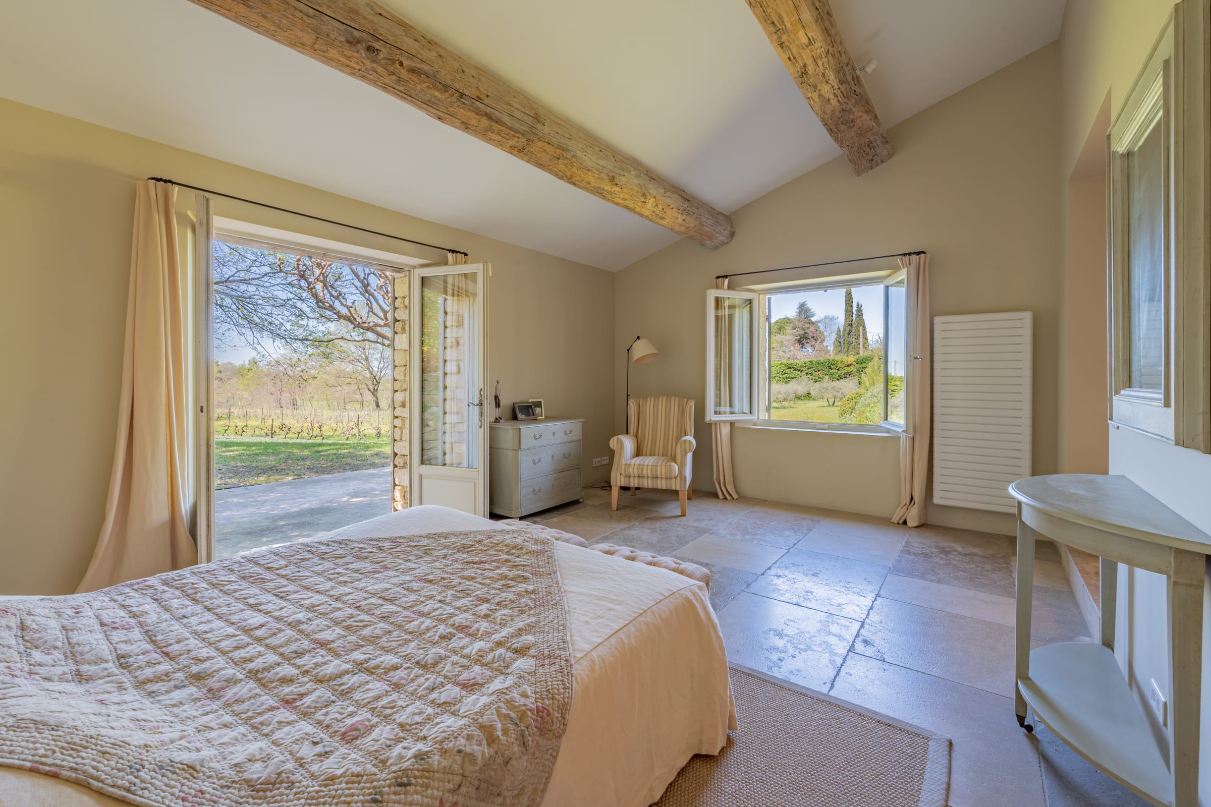 – Chambre 1 : lit 160 cm, placards, commode, fauteuil. Vue vignes et piscine