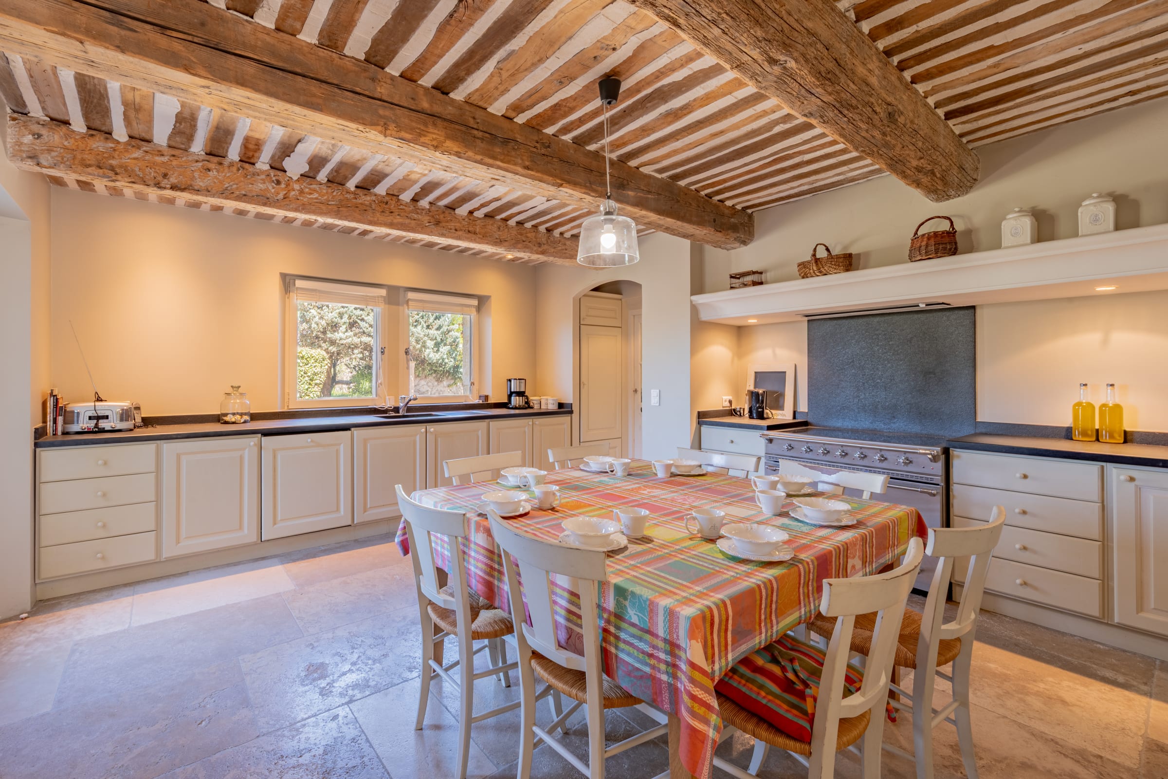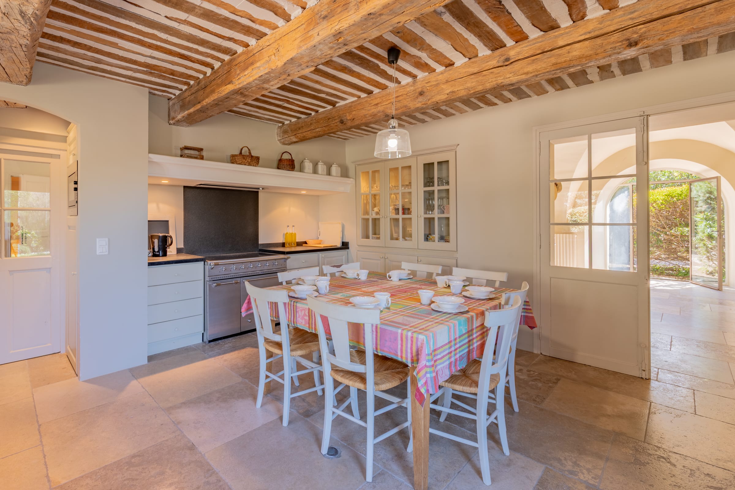 – Cuisine parfaitement équipée avec table pour 8 personnes - accès vers la terrasse extérieure côté piscine.