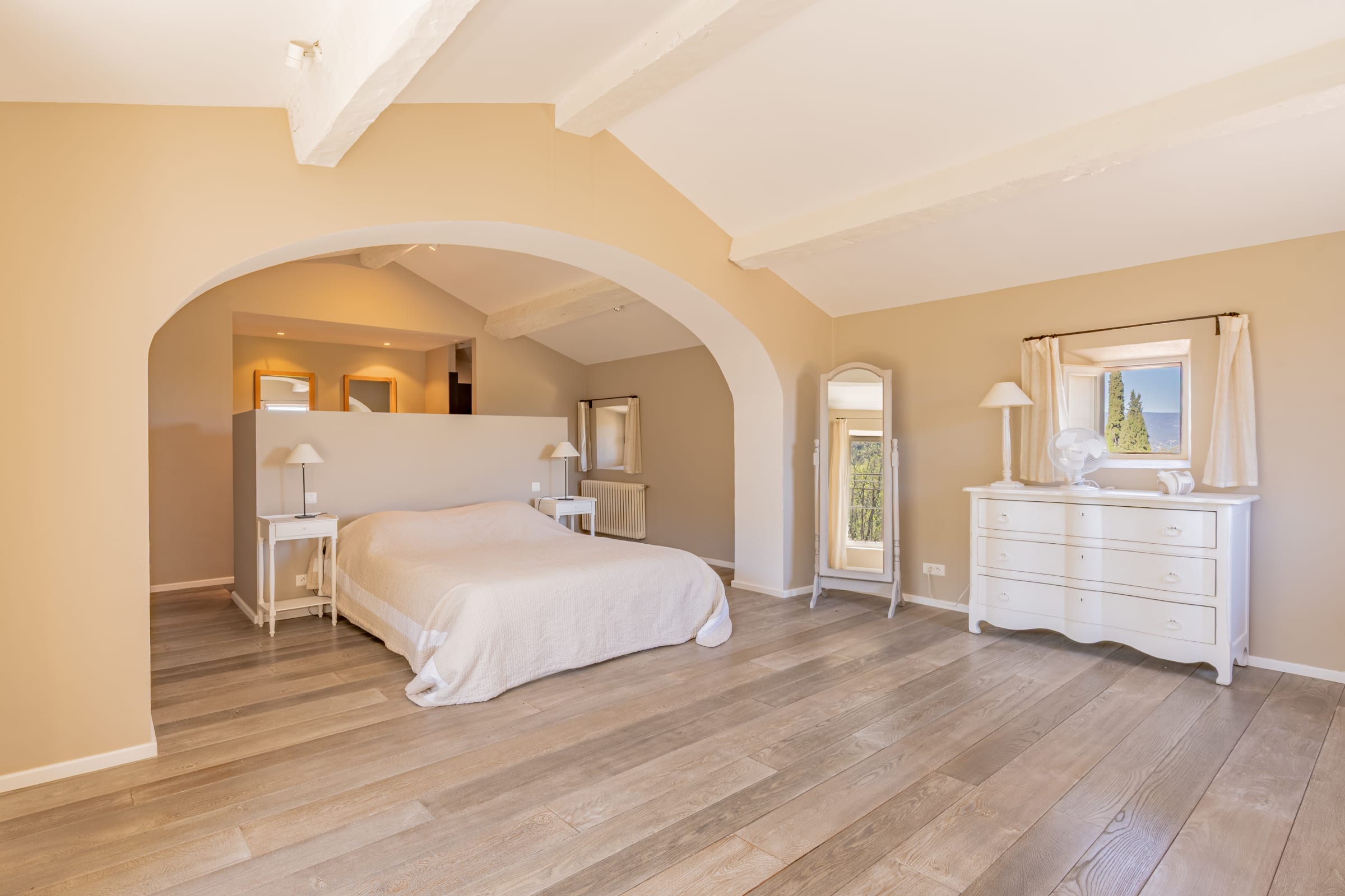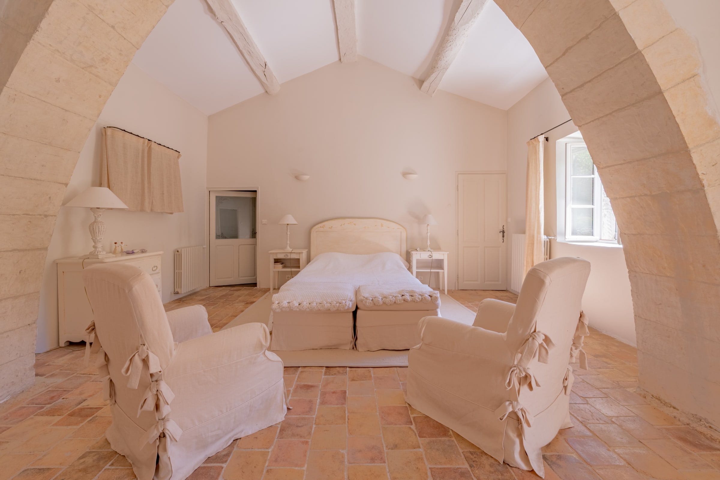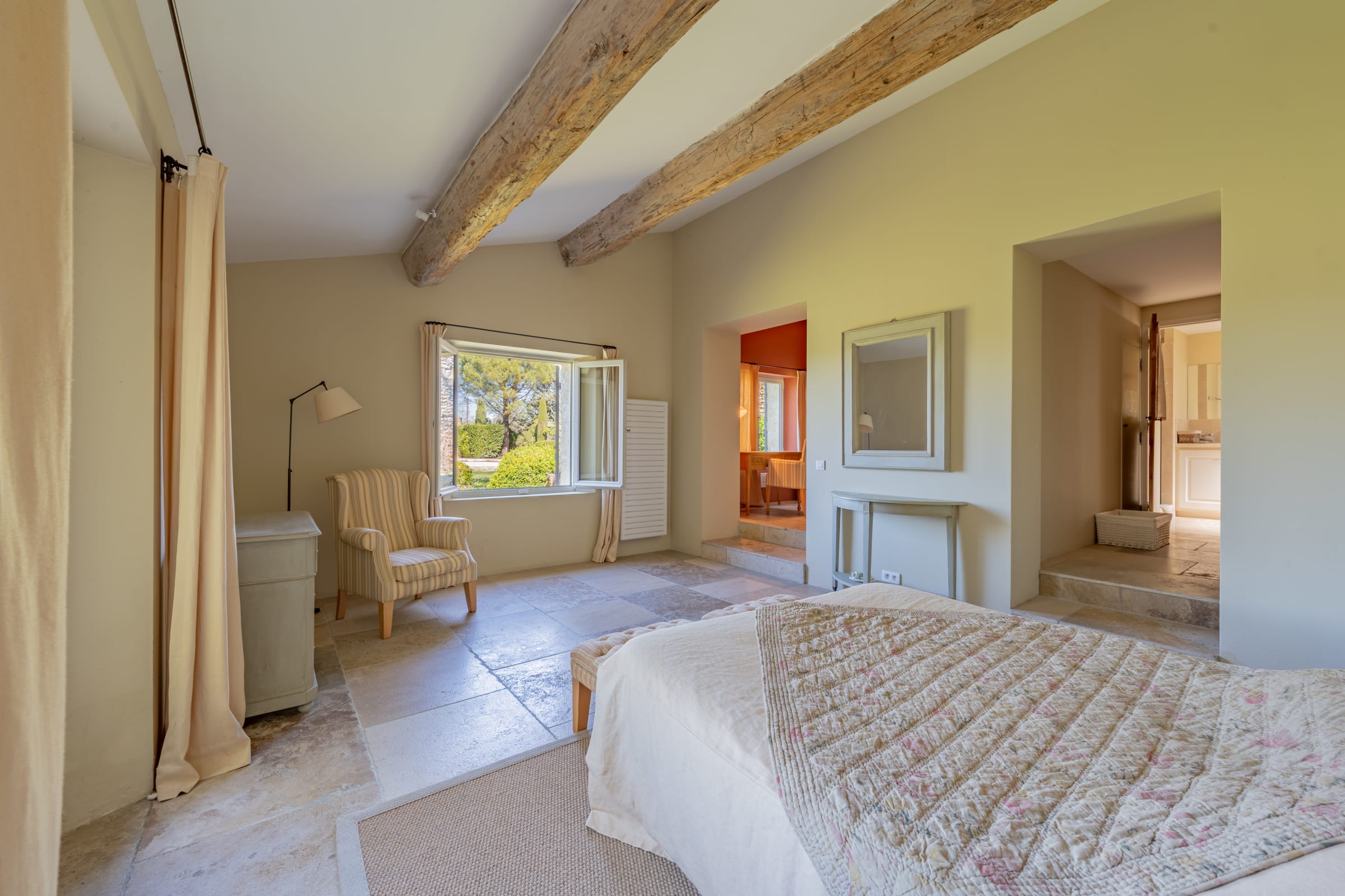 – Chambre 2 - master : lit 160 cm, commode, deux fauteuils - dressing (walk-in), salle de bain en suite (douche, 2 vasques, WC). Vue cour intérieure.