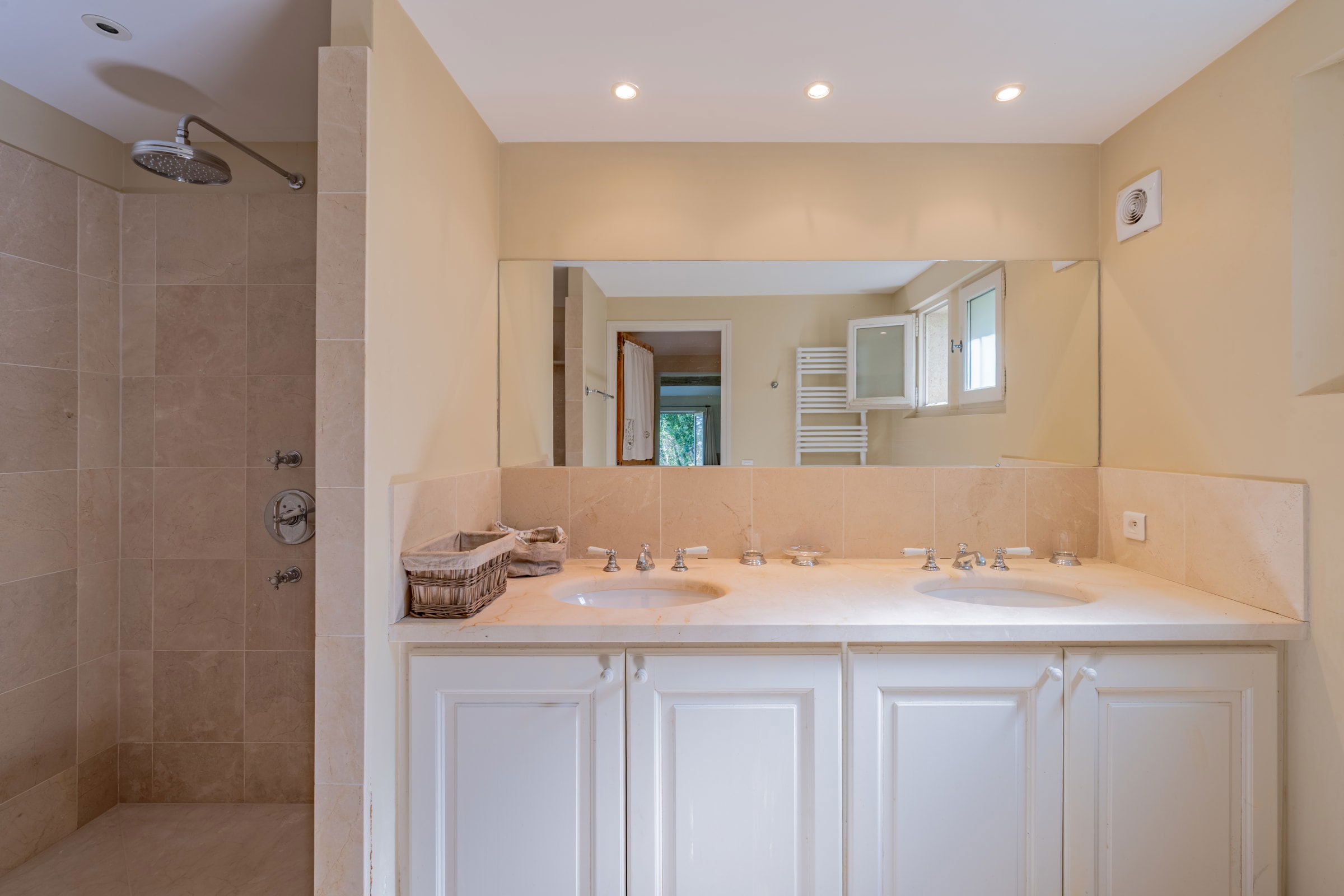 – Chambre 4 : lit 160x200 cm, placards, salle d'eau en suite (douche italienne, 2 vasques, sèche-serviettes) - vue vignes et piscine