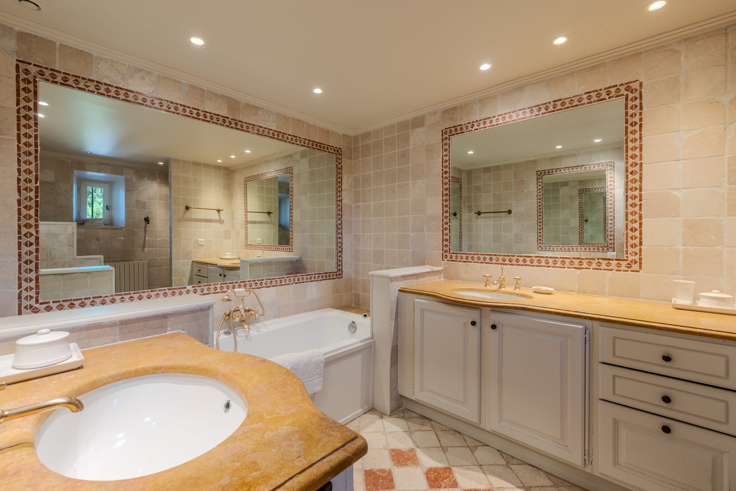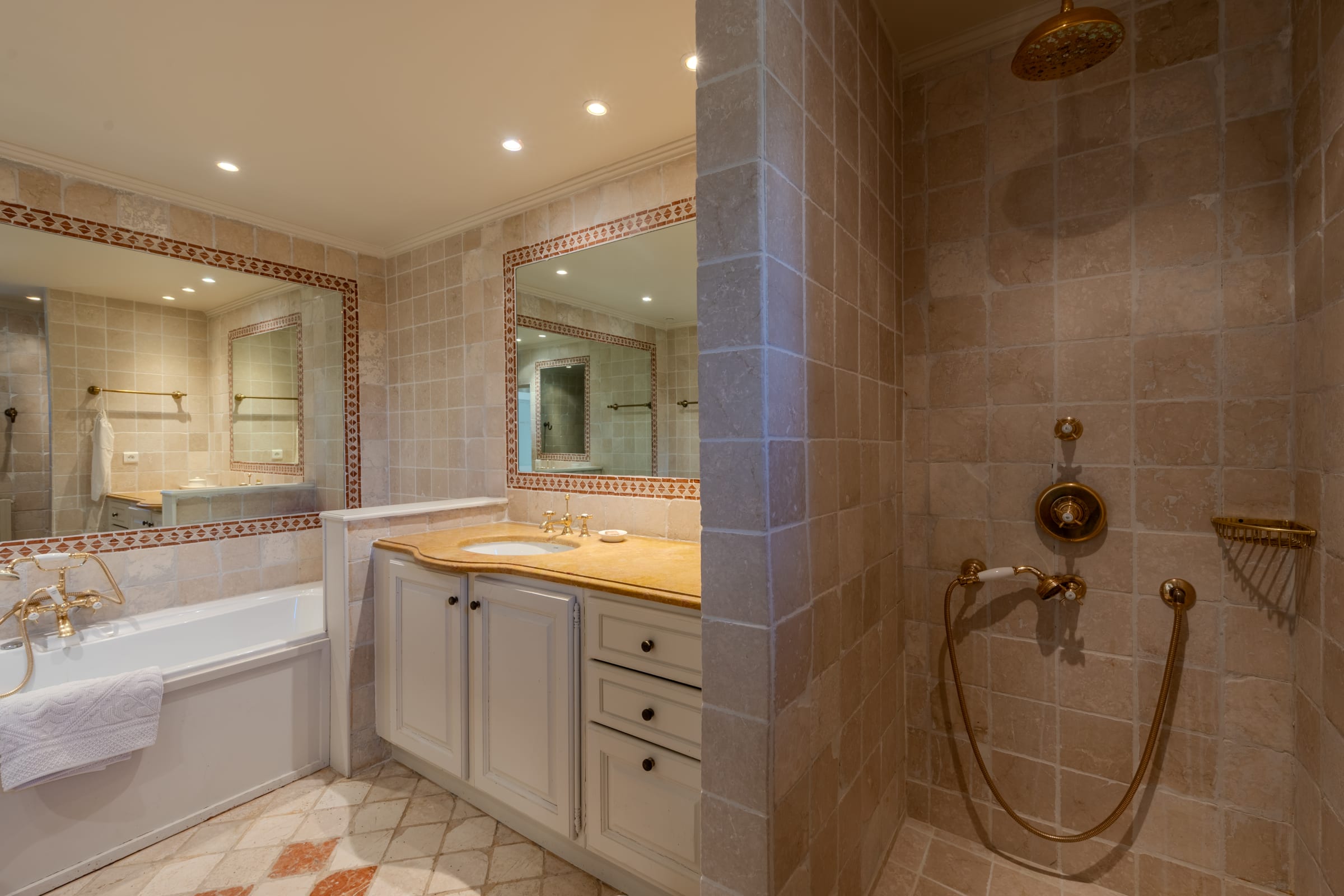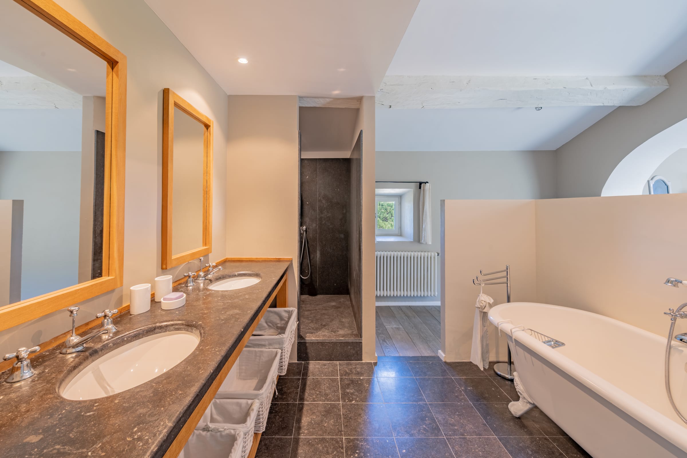 – Chambre 3 : lit 160 cm, commode, armoire, salle de bain en suite (baignoire, douche, 2 vasques, WC indépendants)