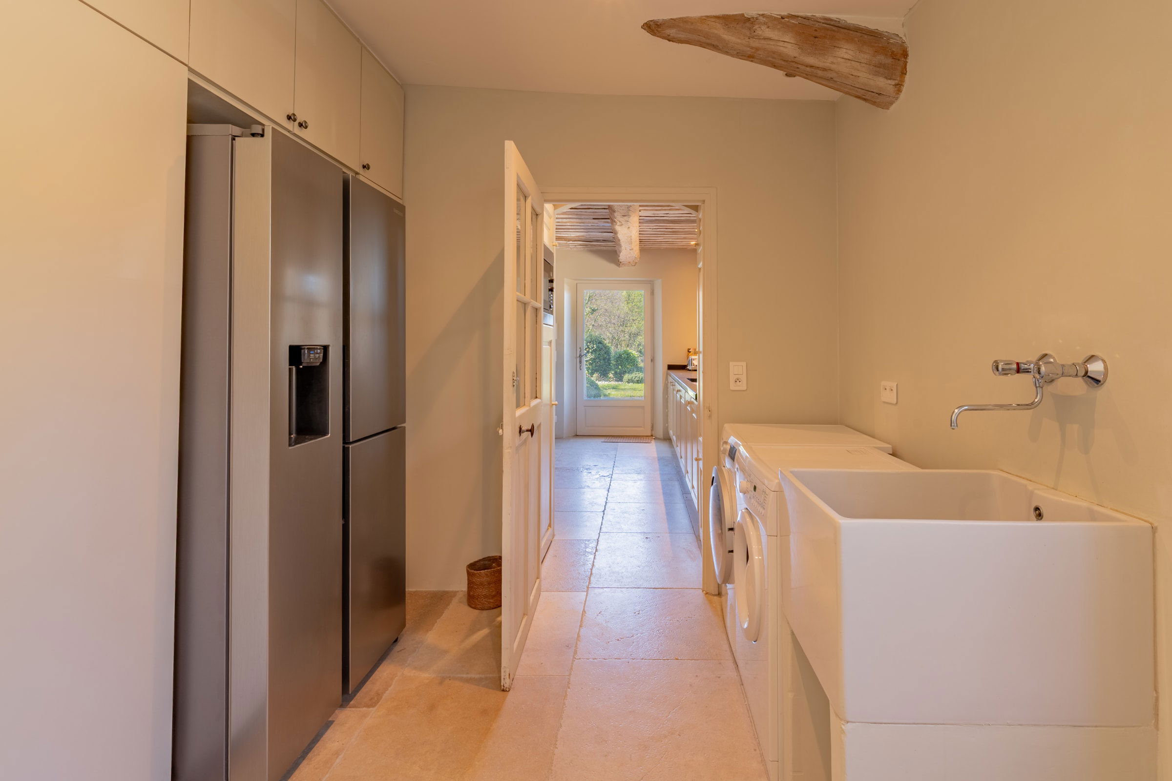 – Buanderie et arrière cuisine - accessible côté parking : Réfrigérateur américain, lave-linge, sèche-linge, évier