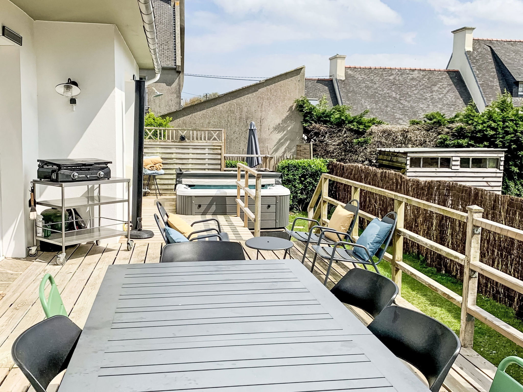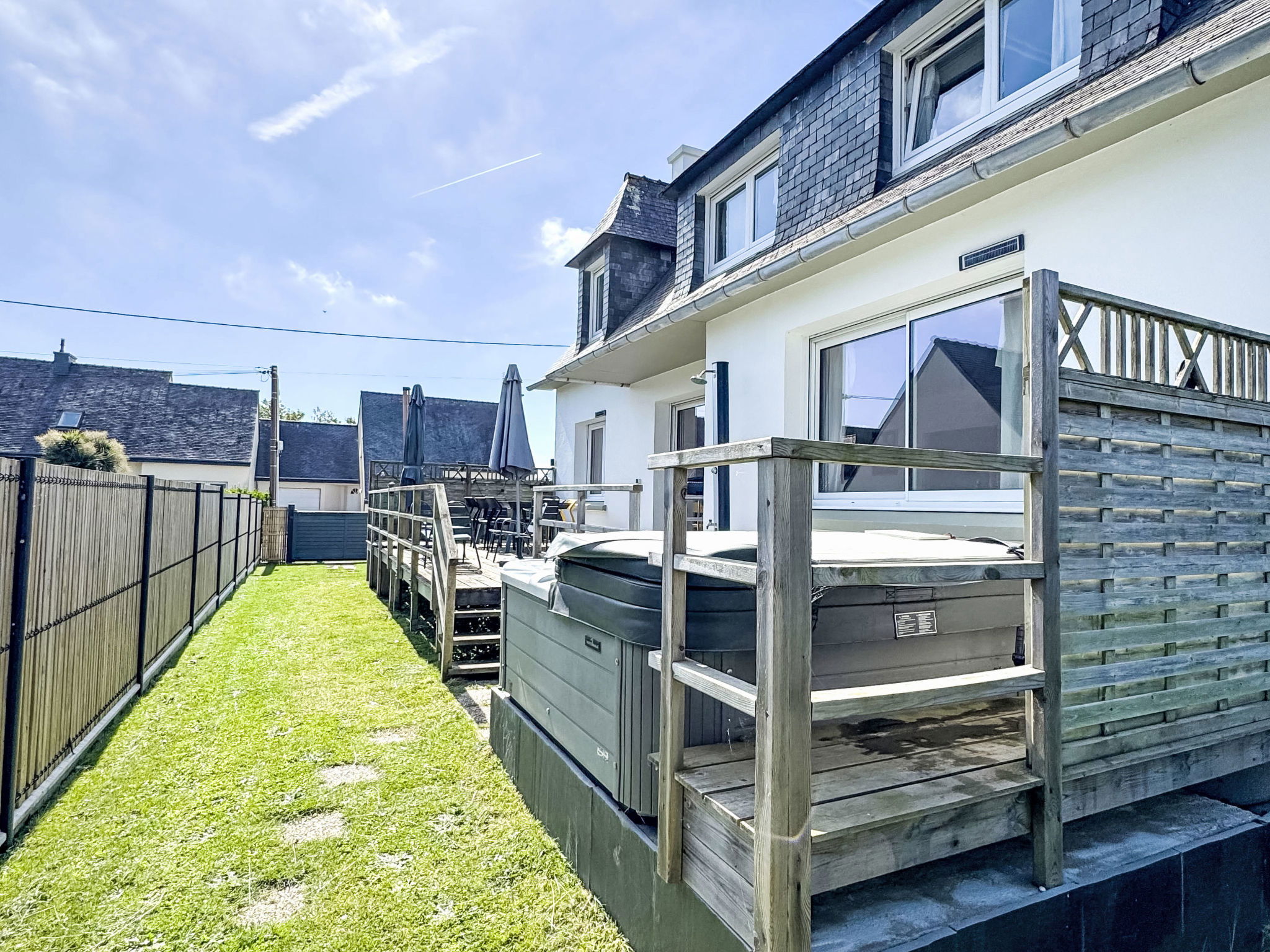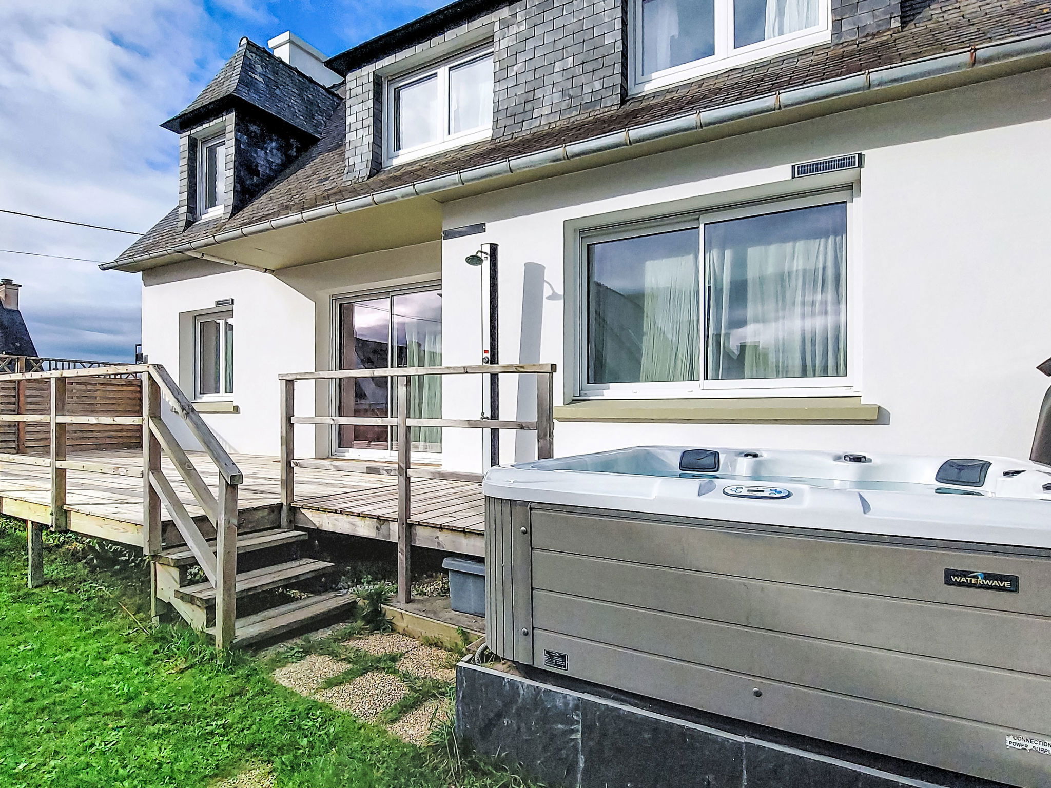 Belle maison individuelle moderne, confortable "Villa Koraill Glaz". Dans le quartier de Porsmeur, à 3 km du centre de Plouescat, dans un quartier résidentiel, à 250 m de la mer, à 250 m de la plage. A usage privé: terrain 300 m2, jardin entretenu avec pelouse et plantes. Douche extérieure, bain à remous , place de parking sur le terrain. Magasins 3 km, magasin d'alimentation 3 km, supermarché 2.7 km, restaurant, bar 300 m, boulangerie 3 km, café 700 m, arrêt de bus 2.5 km, ferry "Roscoff" 24 km, plage de sable "Porsmeur" 250 m, centre thermal "Thalasso Roscoff" 24 km. Port plaisance 24 km, marina 24 km, terrain de golf (9 trous) 6 km, ecole de surf 20 km, ecole de voile 660 m, golf miniature 1.2 km, chemins de randonnées pédestres depuis la maison 250 m. Attractions à proximité: Char à voile, Baie du Kernic 750 m, Dunes de Keremma, réserve ornithologique 8 km, Meneham, Kerlouan 18 km, Roscoff, Jardin exotique, Île de Batz 24 km, Château de Kerjean 18 km, Morlaix 37 km. Région de randonnées: GR34, sentier des Douaniers, 2 mn à pied 250 m.