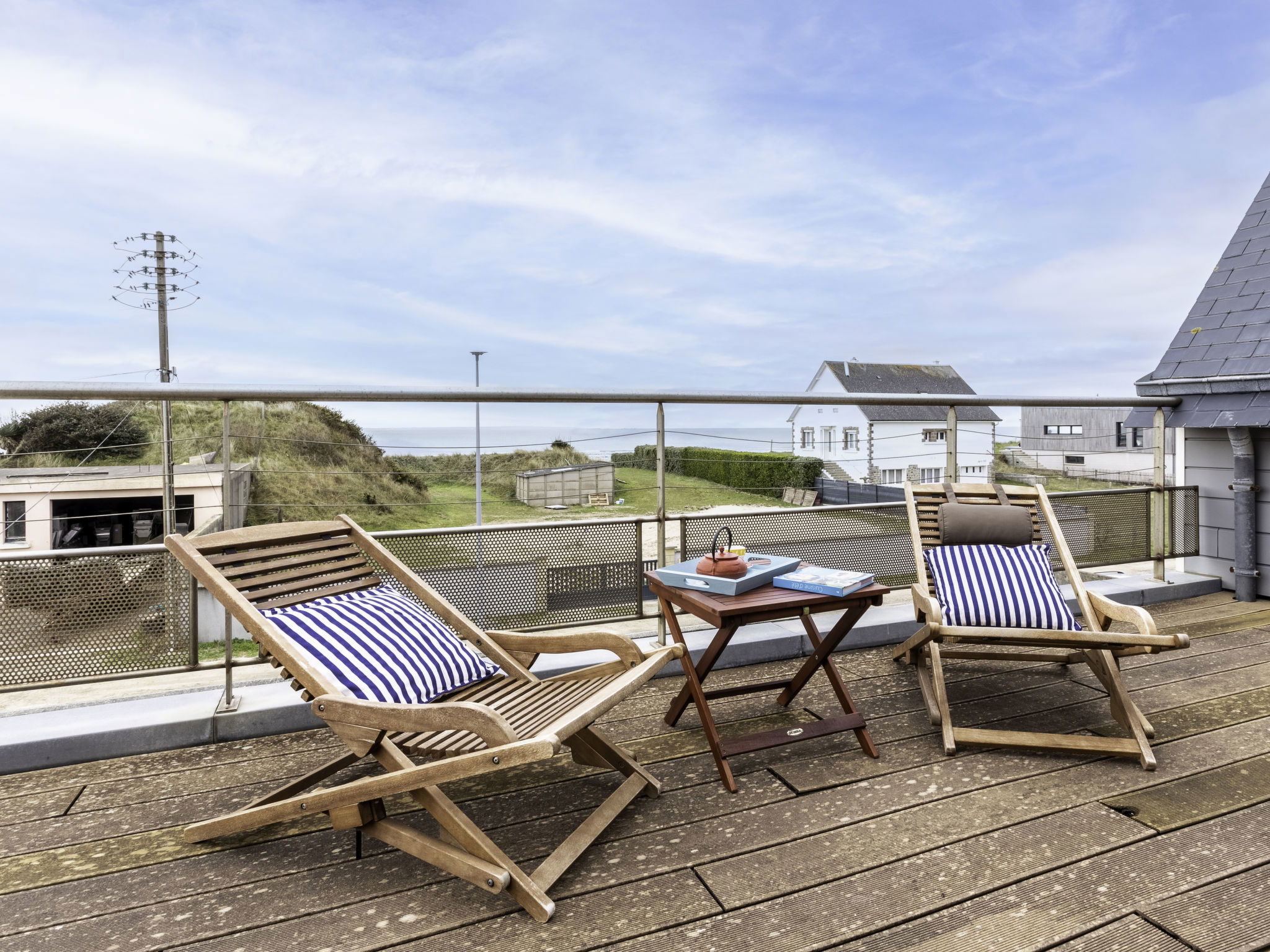 "La Plage", maison 5 pièces 115 m2 sur 2 niveaux. Aménagement très agréable et de bon goût: séjour/salle à manger avec TV (écran plat), chauffage électrique et poêle à bois. Sortie sur la terrasse. 1 chambre avec 1 grand-lit (1 x 140 cm, longueur 190 cm). Cuisine/séjour (four, lave-vaisselle, 4 plaques à induction, grille-pain, bouilloire électrique, micro-ondes, cafetière électrique). Douche/WC. À l'étage supérieur: 1 chambre avec 1 grand-lit (140 cm, longueur 190 cm). Sortie sur la terrasse. 1 chambre avec 2 lits (90 cm, longueur 190 cm). 1 chambre avec 1 grand-lit (140 cm, longueur 190 cm). Bain/WC. Superbe vue sur la mer. A disposition: Internet (Connexion WIFI, gratuit). Veuillez noter: maximum 1 animal/ chien autorisé. Détecteur de fumée. Dans chambre 1 avec terrasse et chambre 2 au premier étage, très belle vue mer exceptionnelle. Annonce d'un particulier (art 155, IV du CGI).