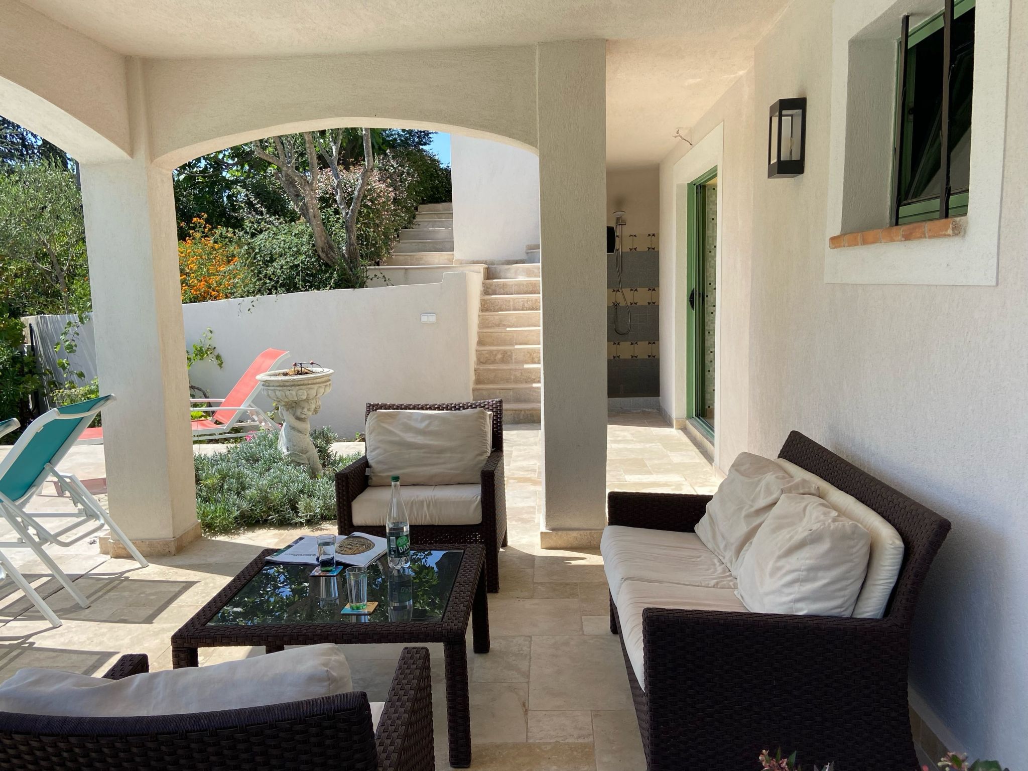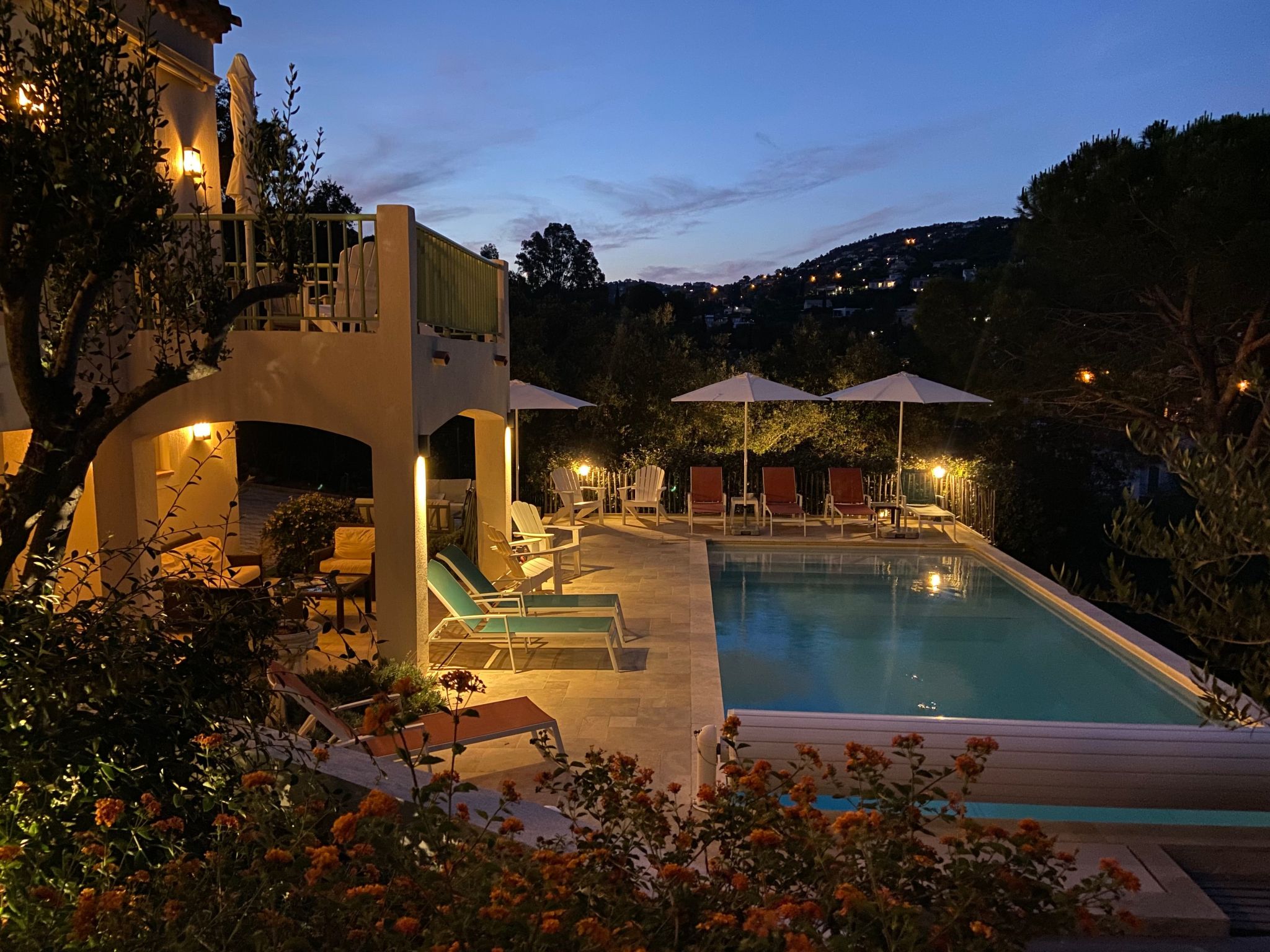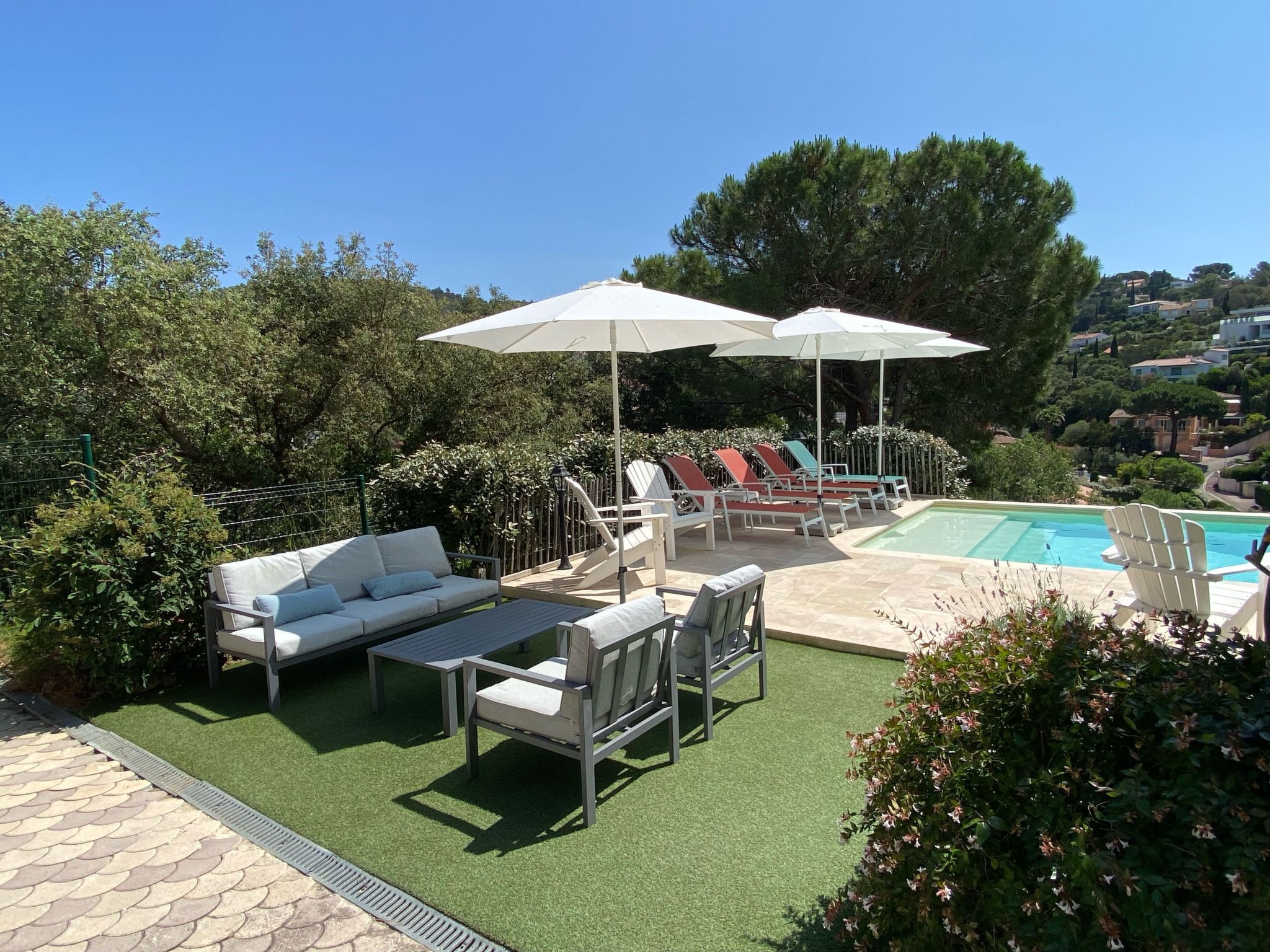 The villa has a lockable, heatable 9 x 4 metre saltwater outdoor pool with a "plage" for small children (20 cm shallow water), as well as an indoor pool with countercurrent. The fully enclosed Mediterranean garden (with figs, olives and plums) and outdoor shower, offers a beautiful sea view over the bay of Saint-Tropez and has spacious, partly covered terraces equipped with lounge sets, luxurious and comfortable garden chairs, gas barbecue, dining tables and sun loungers.