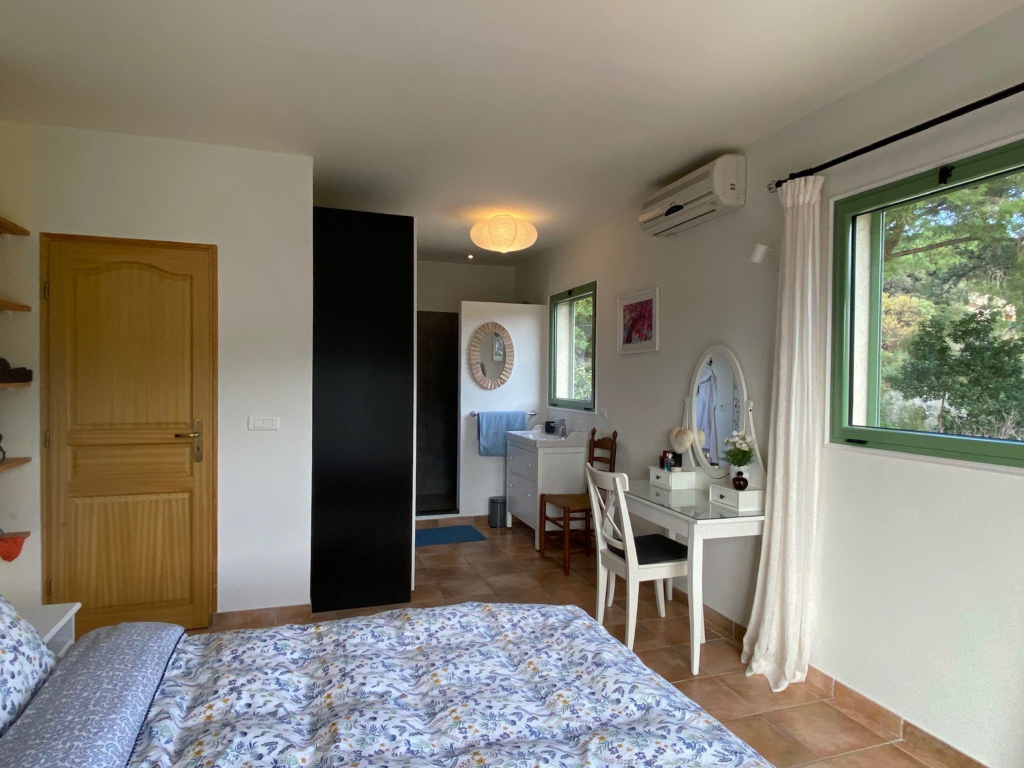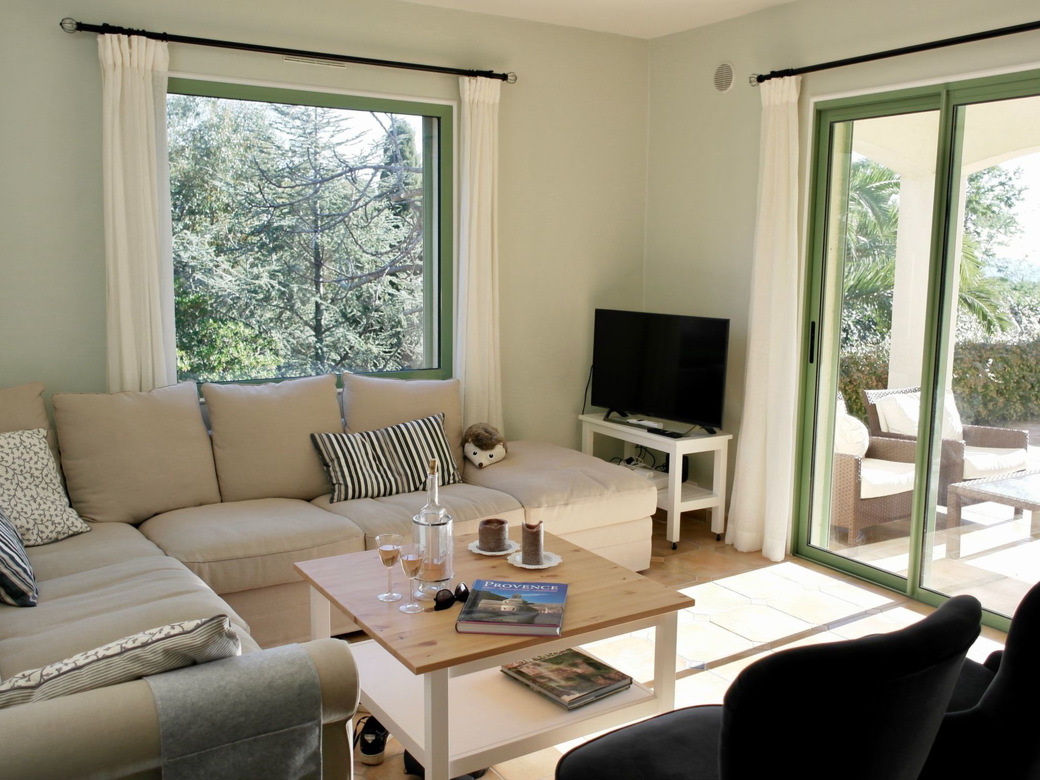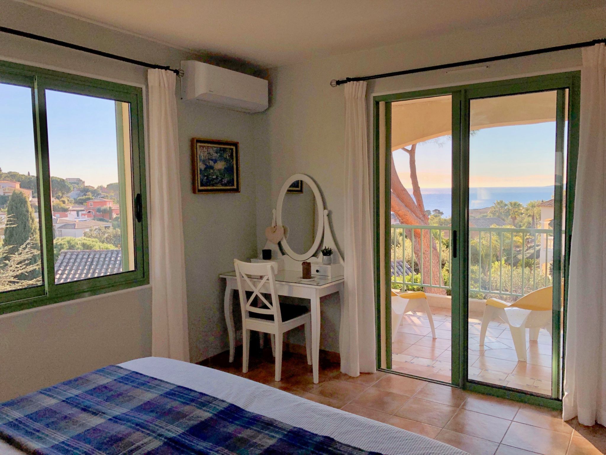 Lovely quiet Provencal Villa, completely newly furnished in 2019 with 6 bedrooms and 3 bathrooms. The villa is ideally suited for a stay with family, or several families with children, with a total of 10-12 people. The many, partly covered, terraces of over 150 m² always provide plenty of shade and the possibility to find a quiet spot. There are 4 bedrooms on the ground floor and 2 bedrooms on the floor. The villa is fully air-conditioned and has a lockable, heated 9 x 4 metre saltwater outdoor pool with a "plage" for small children (20 cm shallow water), as well as an indoor pool. The indoor pool of 3 x 4 metres, is equipped with a countercurrent system, so you can swim endlessly. The Mediterranean garden (with figs, olives and plums) and outdoor shower, offers a beautiful sea view over the bay of Saint-Tropez and has spacious, partly covered terraces equipped with lounge sets, luxurious and comfortable loungers, gas barbecue, dining tables and chairs. The villa is very fully equipped and furnished with attention to detail. There are electric shutters, satellite TV, Smart TV and WLAN. The kitchen is equipped with Miele dishwasher, oven/microwave, fridge with separate freezer compartment, induction hob and fully automatic coffee machine. The bedrooms have ample wardrobe space. -class beds (Auping) and mosquito netting for the windows in all bedrooms ensure a carefree and good night's sleep. In short, a comfortable and spacious house, which has much to offer, partly due to its quiet location at a short walking distance from the sandy beach (with restaurants and sunbed rental) and the coastal village of Les Issambres, with many facilities and a nice marina. From this harbour there is also a direct boat connection to Saint Tropez (12 minutes) and Cannes!
