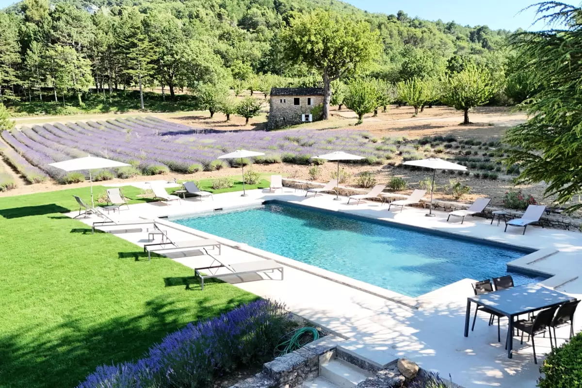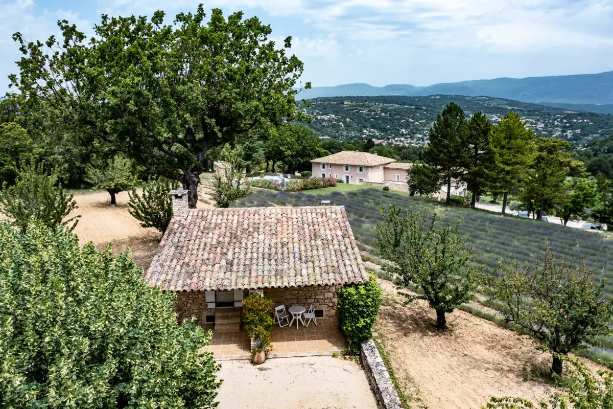 La piscine privée, perchée sur les hauteurs de la bastide, offre une vue panoramique sur les paysages pittoresques des Monts du Vaucluse, des massifs du Luberon et du Rocher de Saignon. Imaginez-vous, plongeant dans une eau scintillante, tandis que les parfums de lavande et les chants des cigales accompagnent vos journées ensoleillées. À l’ombre d’un chêne séculaire, la grande terrasse invite à des repas conviviaux ou à des moments de détente à tout moment de la journée.