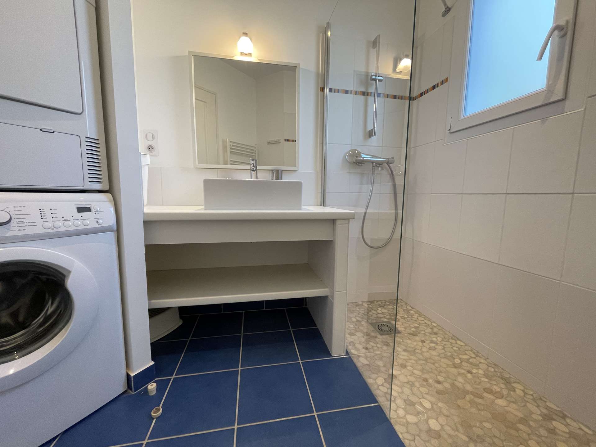 Salle de bains avec baignoire, 1 vasque, lave-linge et sèche-linge. Salle d'eau avec douche à l'italienne et 2 vasques