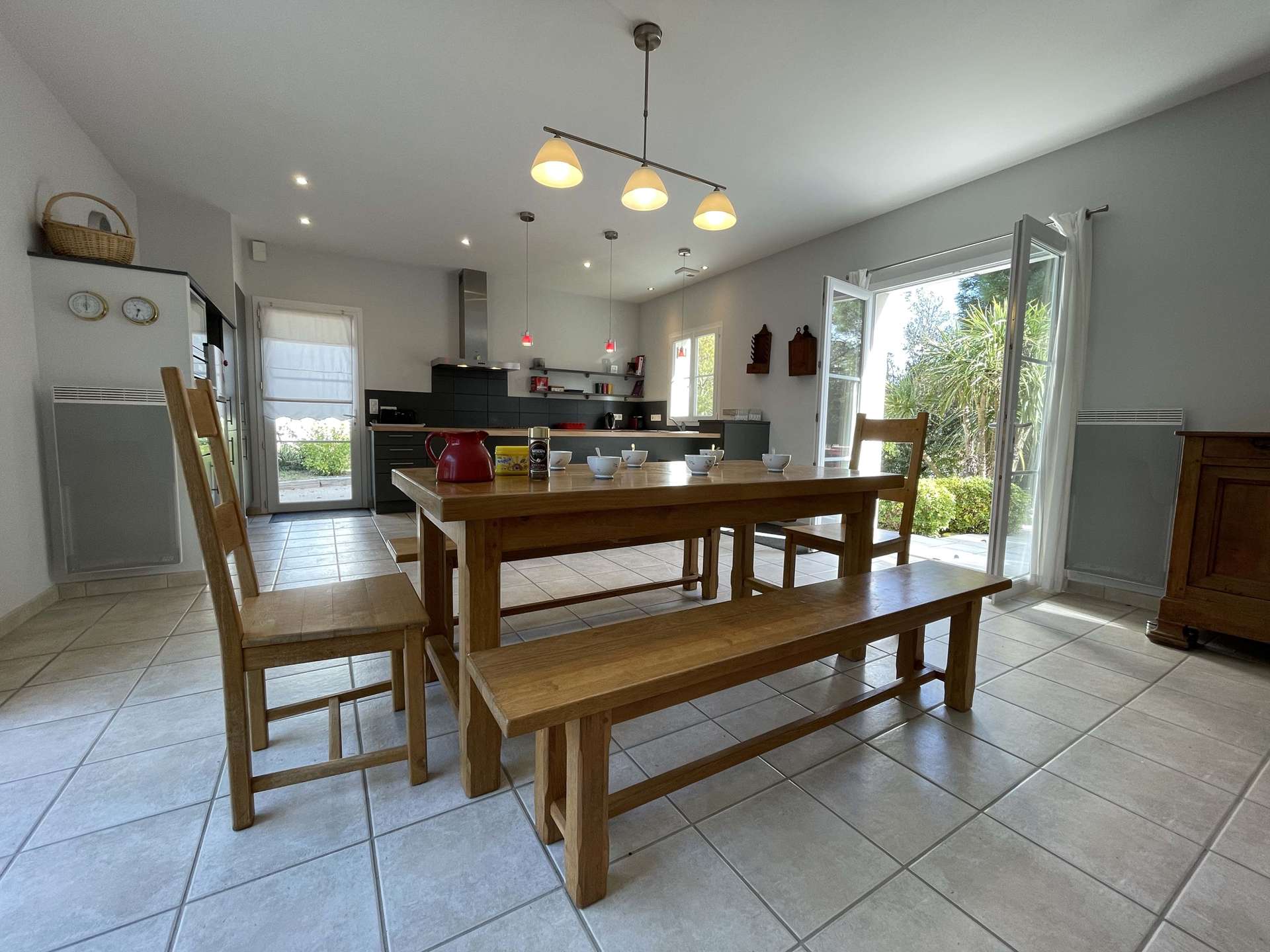 Superbe villa de vacances se composant d'une grande pièce à vivre (55m²) avec séjour avec canapé d'angle, TV écran plat, WIFI, table à manger avec bancs, coin cuisine équipé et aménagé avec plaque induction, frigo avec partie congélateur, micro-ondes, lave-vaisselle et petit électroménager.