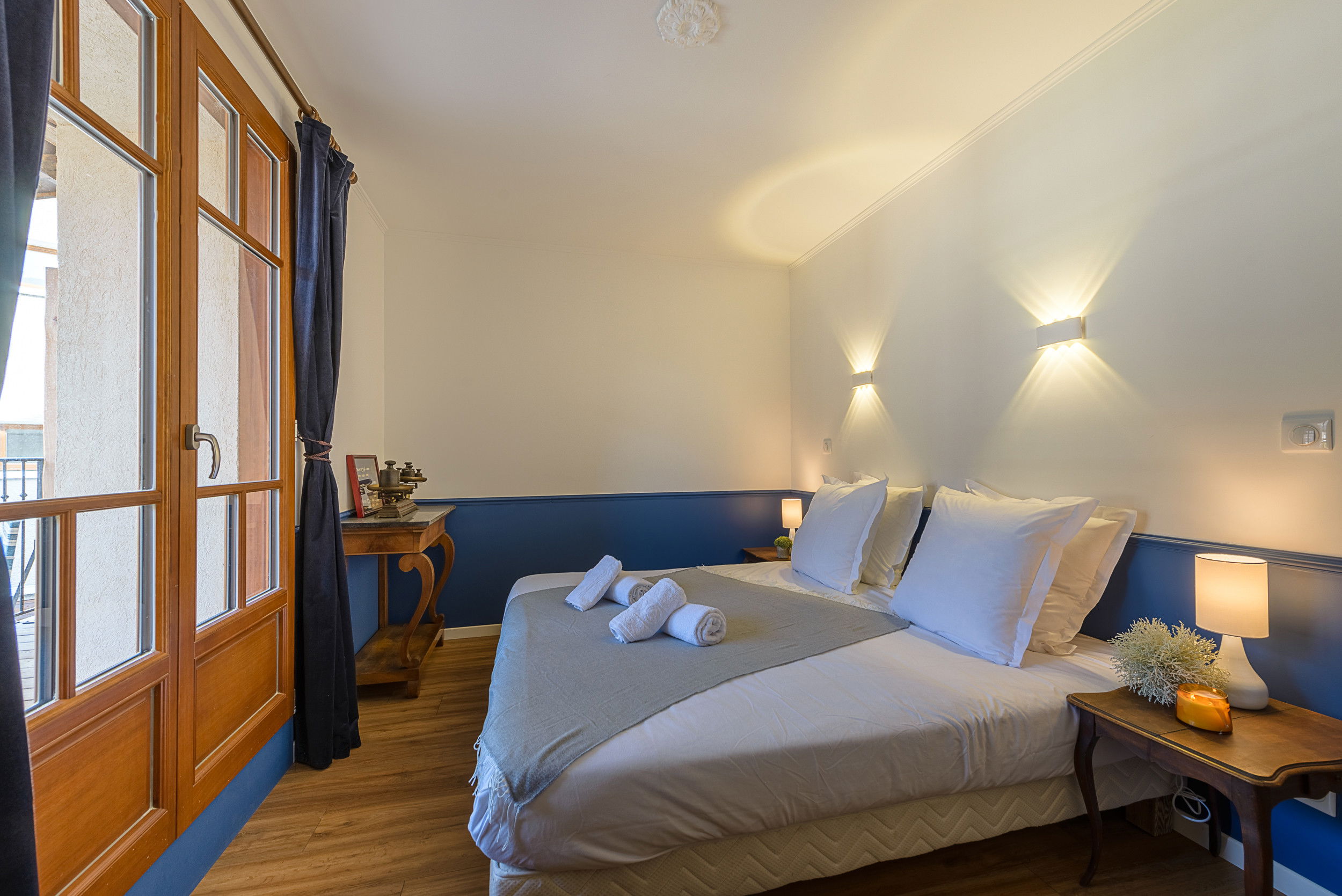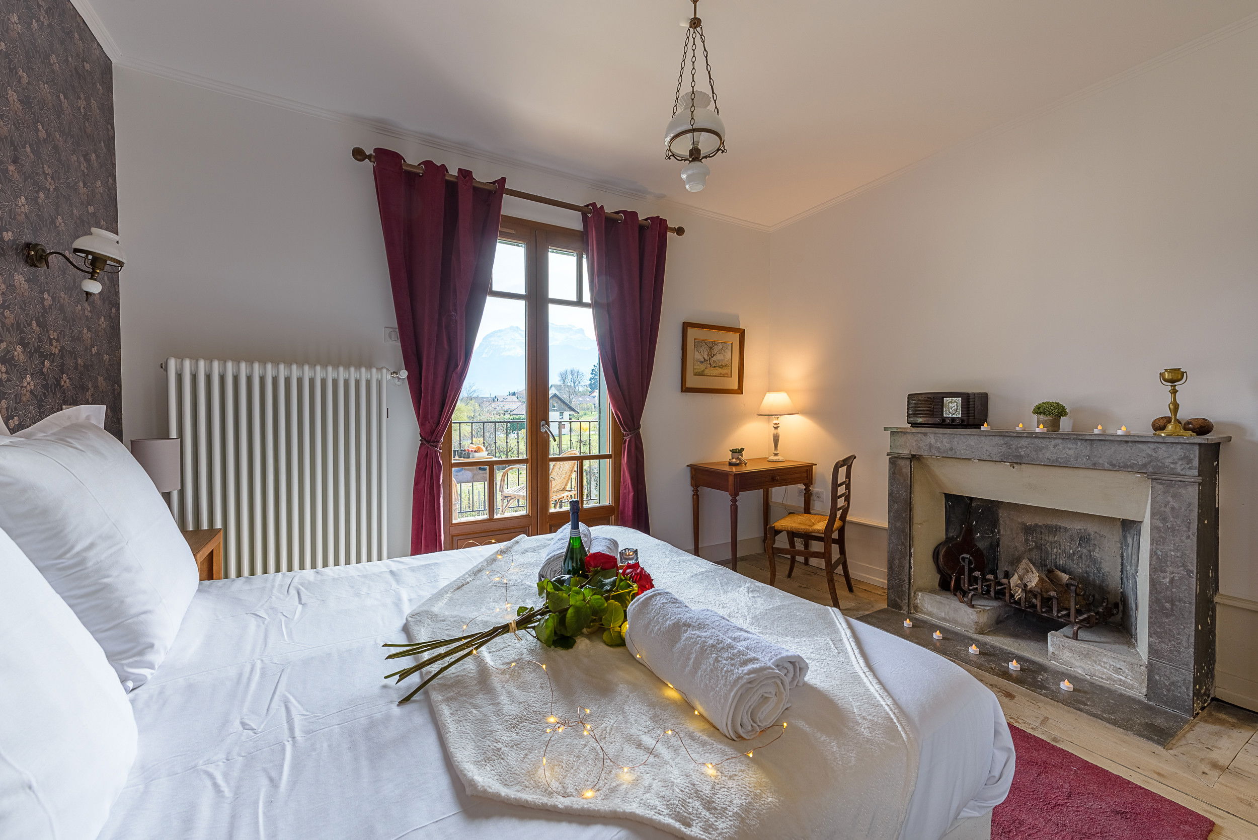 - Chambre n°2 - Suite Lanfon : 1 lit queensize 160x200cm avec placards de rangement, cheminée non fonctionnelle et un accès au balcon partagé avec la chambre n°3, superbe vue sur les montagnes !