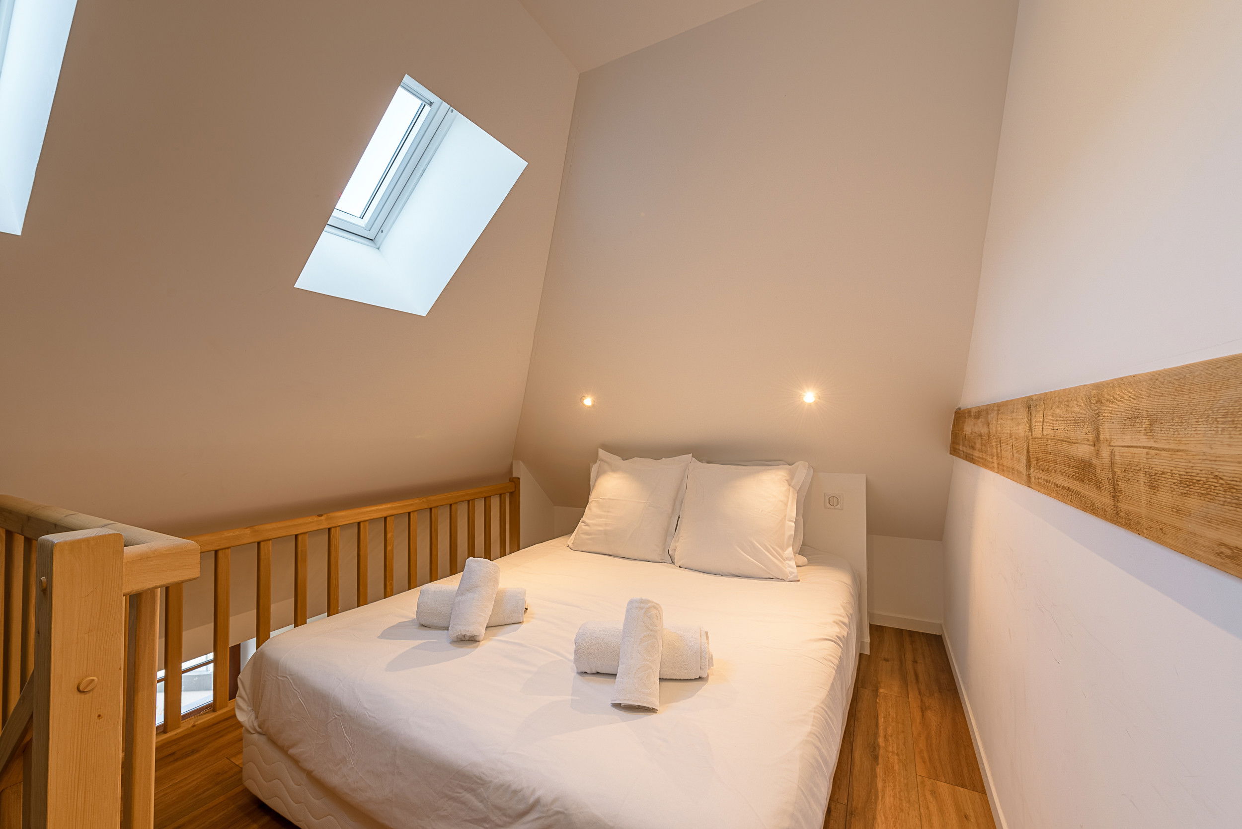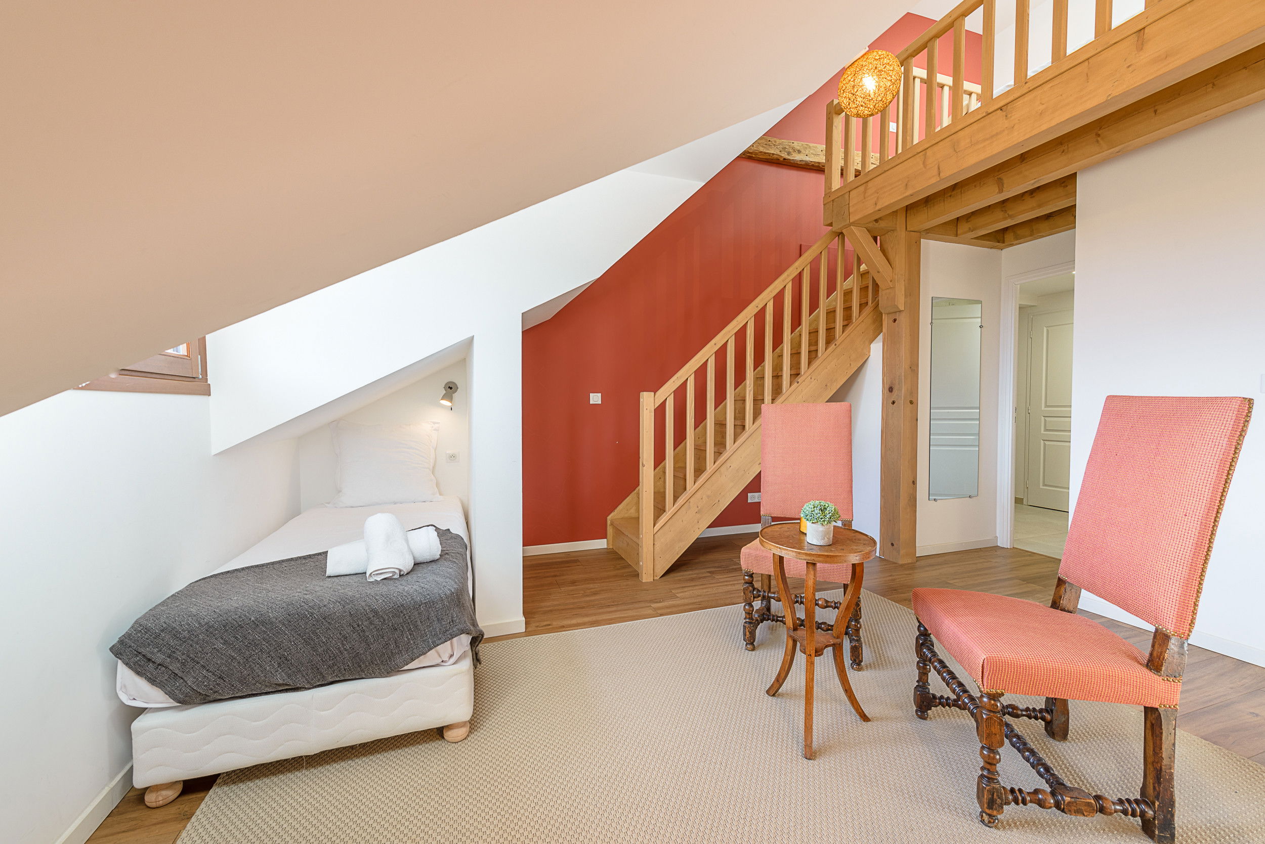 - Chambre n°4 - Suite L'Arcalod : 1 lit queensize sur la mezzanine, 1 lit simple 80x190 disposant d'une salle de douche attenante avec WC, espace jour-bureau