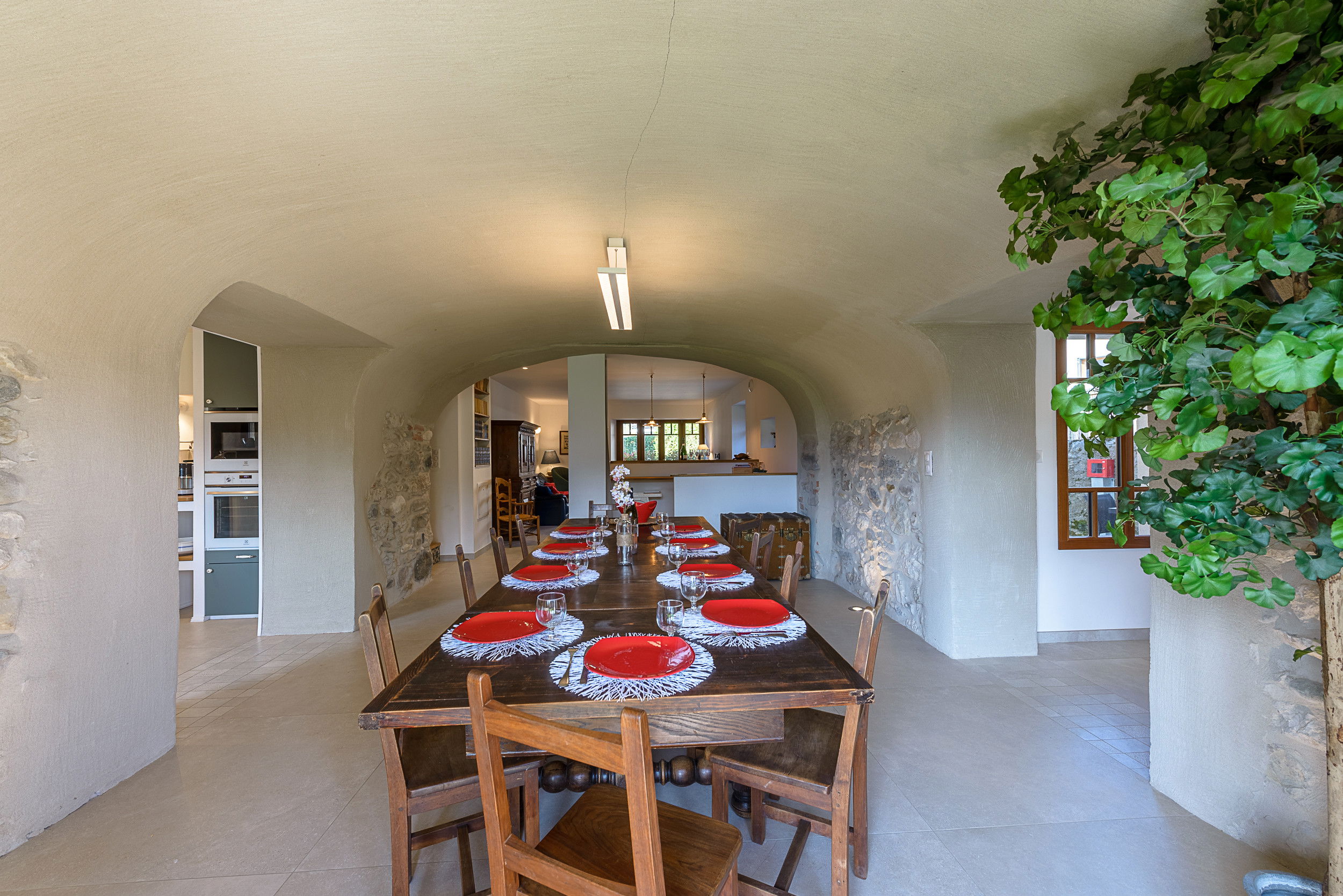 - Une salle à manger sous voute disposant d'une table à manger avec rallonge pouvant accueillir jusqu'à 16 personnes avec un accès au jardin