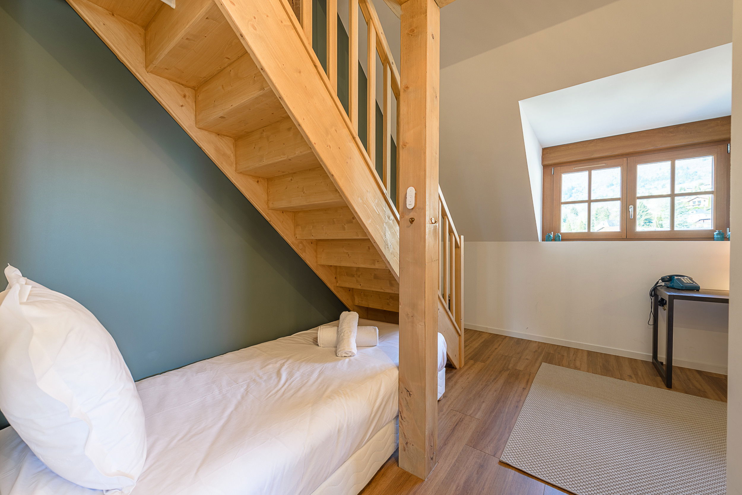- Chambre n°5 - Suite La Tournette : 1 lit queensize sur la mezzanine, 1 lit simple 80x190 disposant d'une salle de bain attenante avec WC, espace jour/bureau