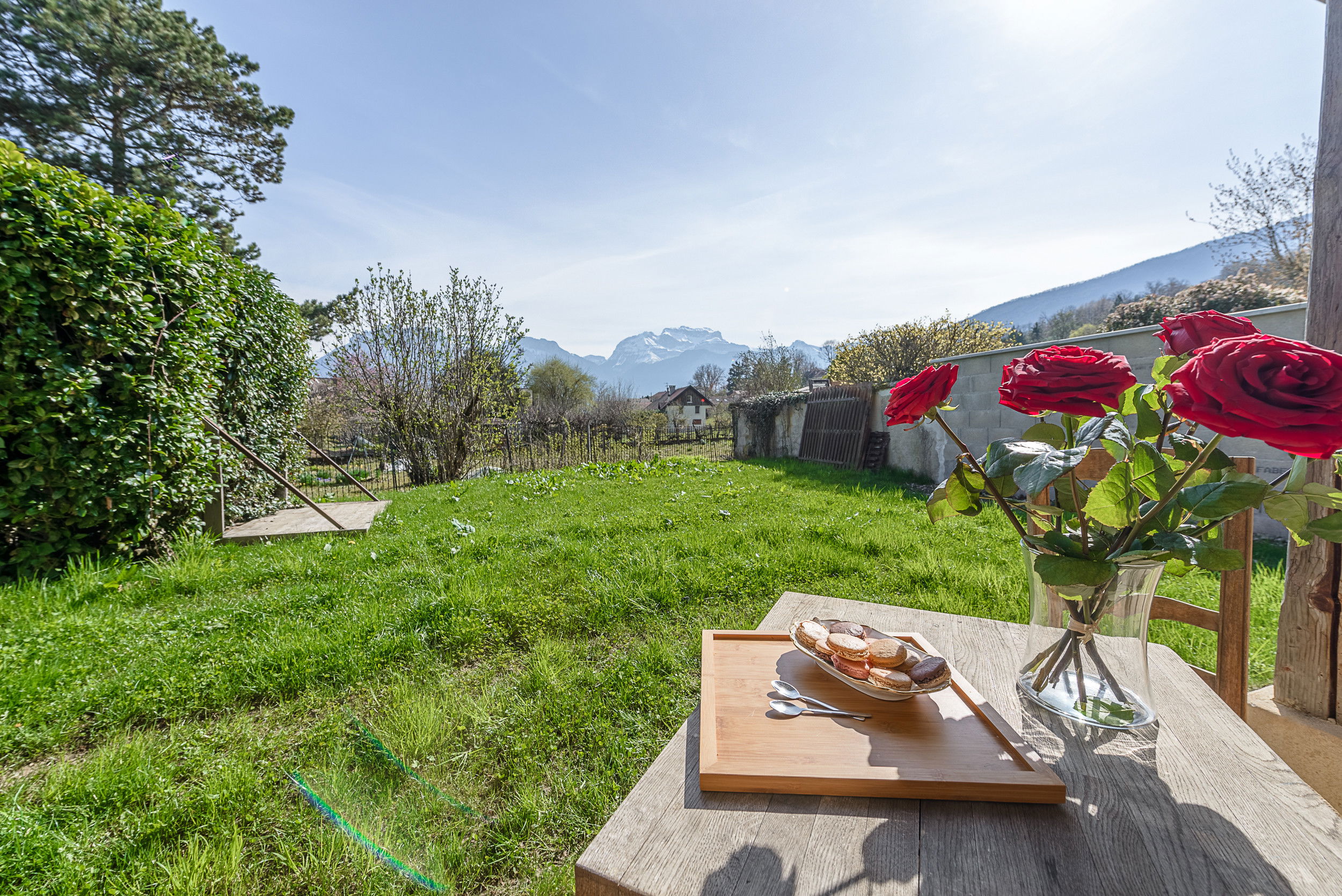 - Côté salle à manger et cuisine, un jardin avec vue montagnes, table pour les petits déjeuners au soleil levant, chaises longues à l'abri des regards pour les amateurs de bronzette !