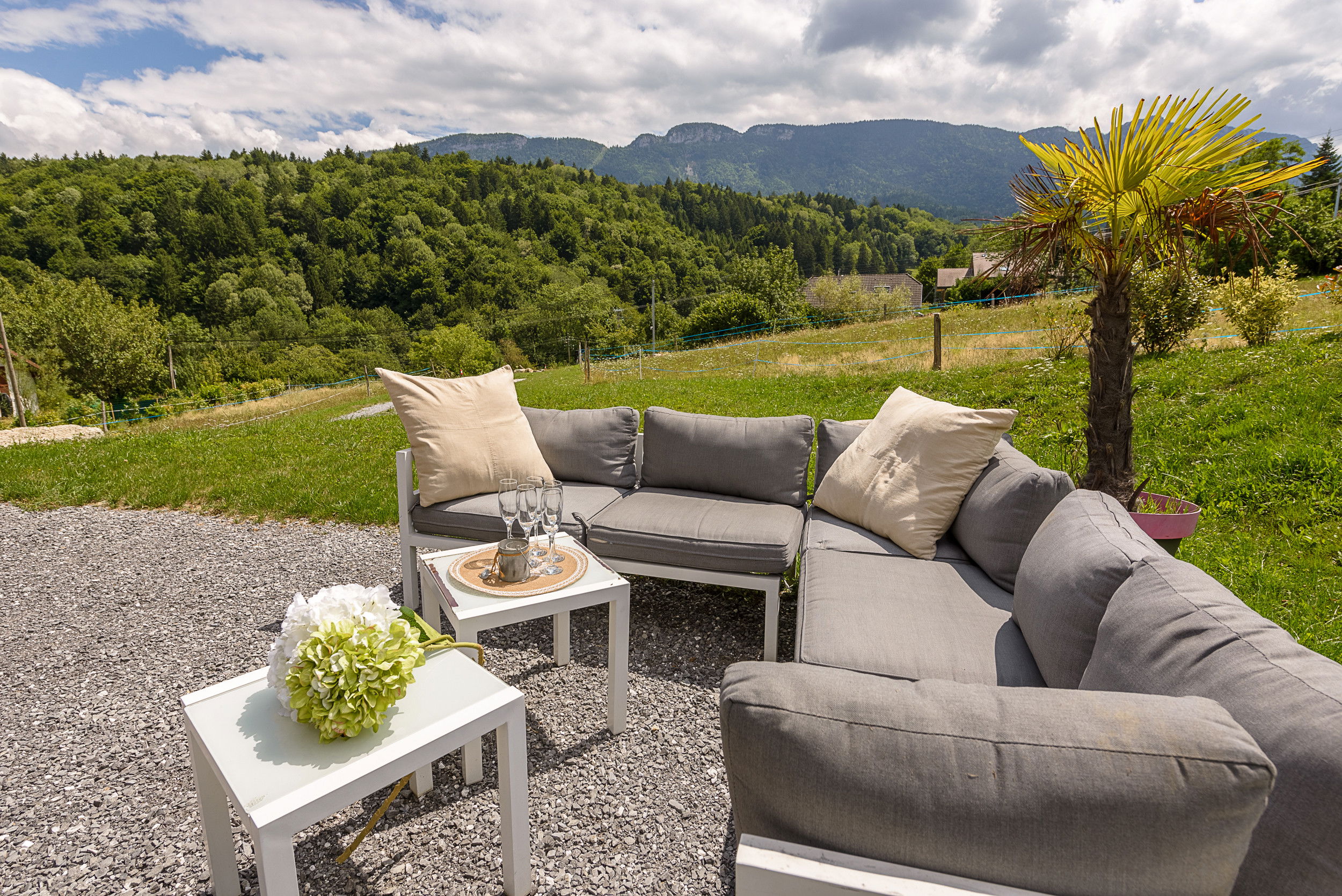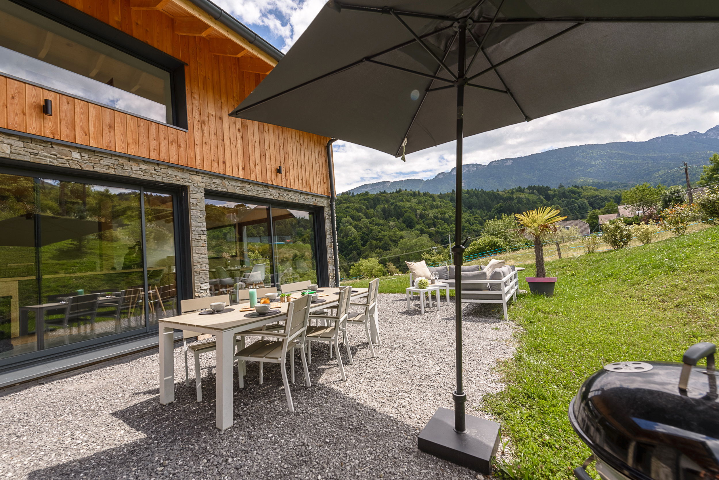 - Terrasse plein sud aménagée avec salon de jardin, grande table extérieure et barbecue Weber