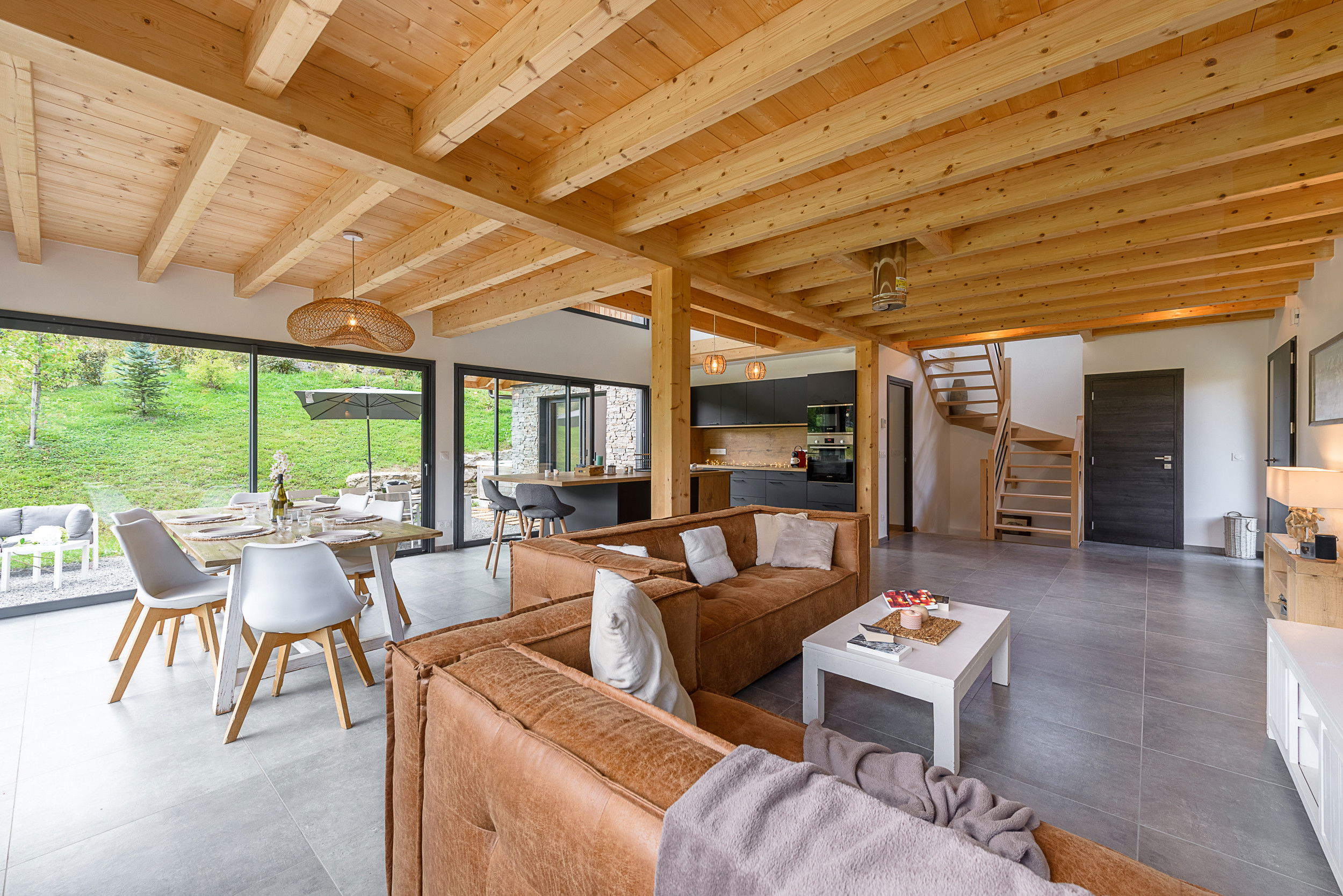 - Pièce de vie de 60 m² baignée de lumière, offrant un grand espace salon avec deux canapés confortables et TV connectée