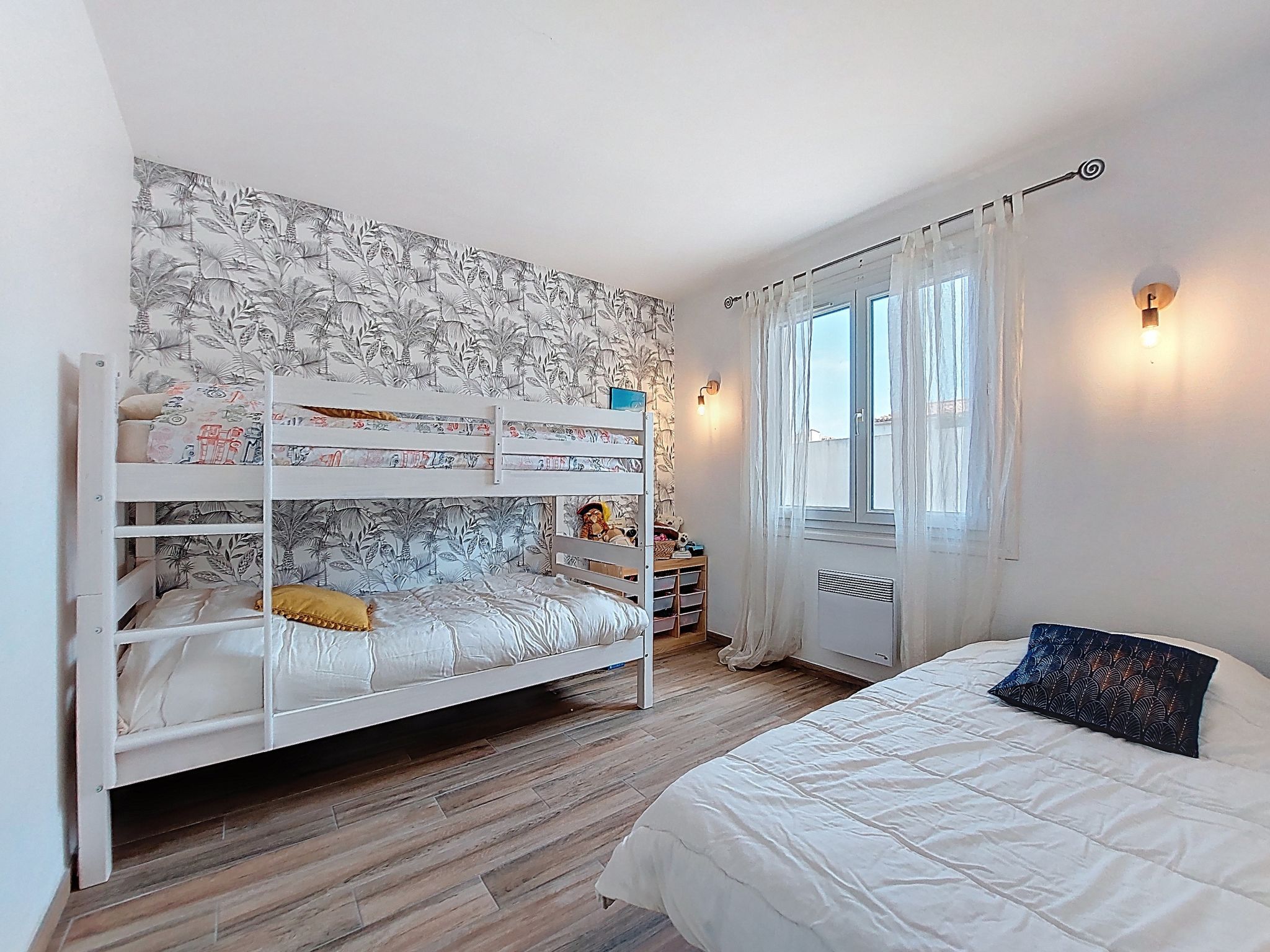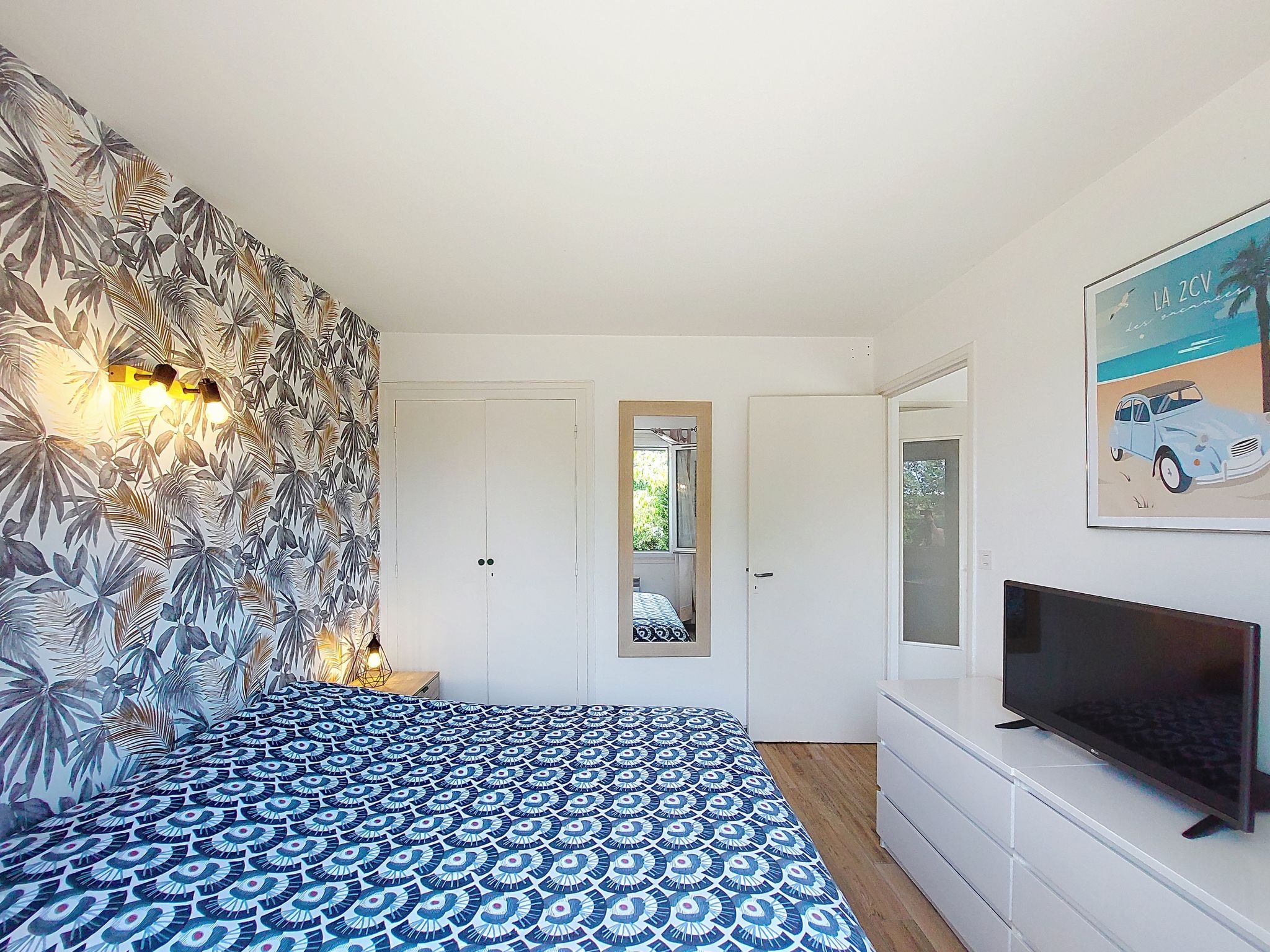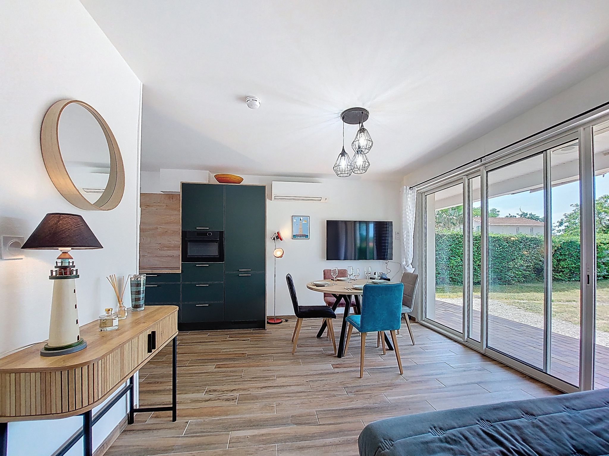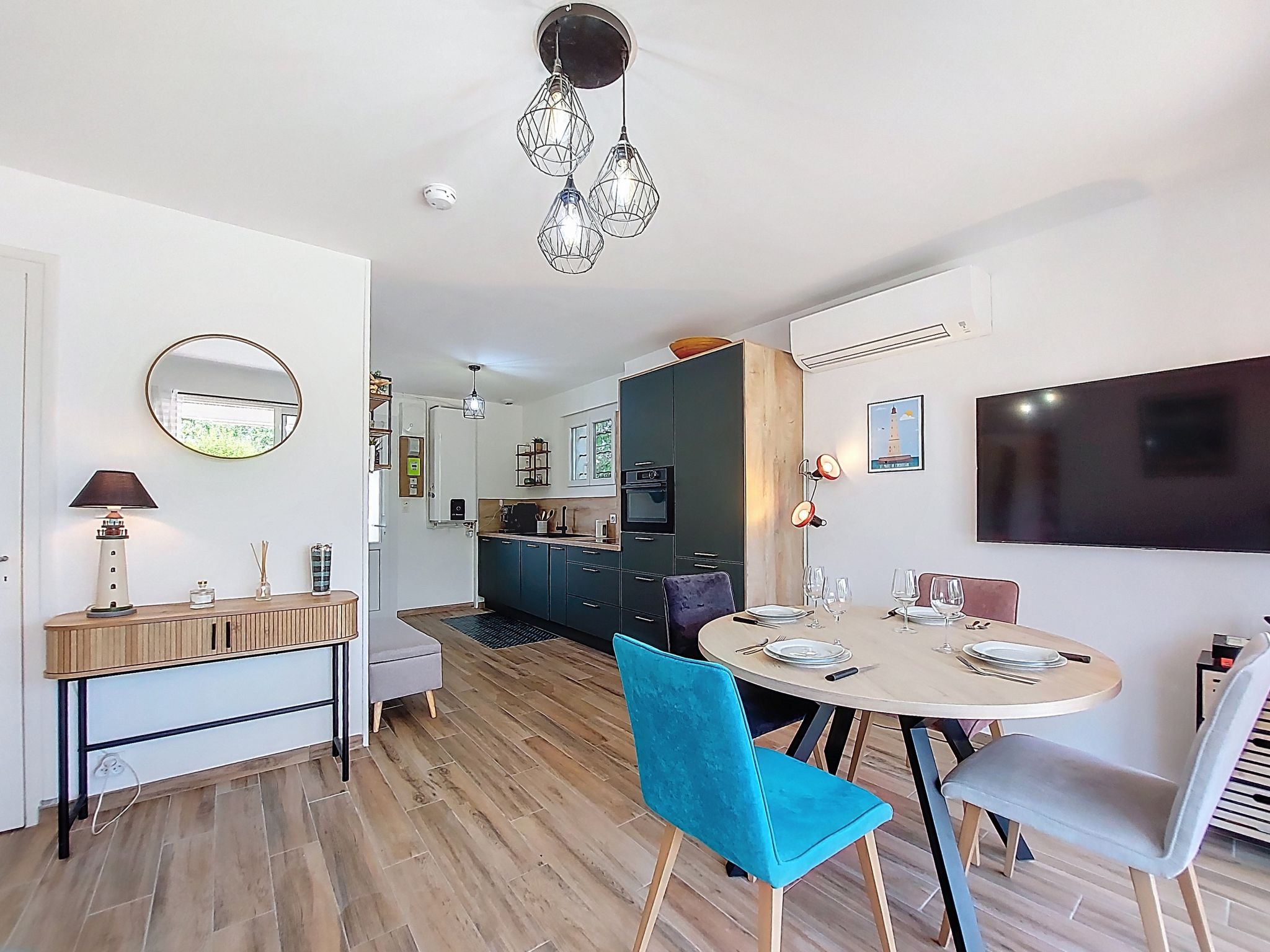 Maison 3 pièces 60 m2, situation est. Clair, aménagement plaisant: séjour avec TV (écran plat). Sortie sur le jardin, sur la terrasse. 1 chambre avec 1 grand-lit (1 x 160 cm, longueur 190 cm), TV (écran plat). 1 chambre avec 1 lit (90 cm, longueur 190 cm), 1 x 2 lits superposés (90 cm, longueur 190 cm). Cuisine ouverte (lave-vaisselle, 3 plaques à induction, grille-pain, bouilloire électrique, congélateur, cafetière électrique, combiné micro-ondes). Douche/WC. Air-conditionné. Terrasse 8 m2, jardin 650 m2. Meubles de terrasse. A disposition: lave-linge. Internet (Connexion WIFI, gratuit). Place de parking (2 Voitures). Veuillez noter: maison non-fumeur. 1 animal/ chien de petite taille autorisé. Détecteur de fumée. Annonce d'un particulier (art 155, IV du CGI).