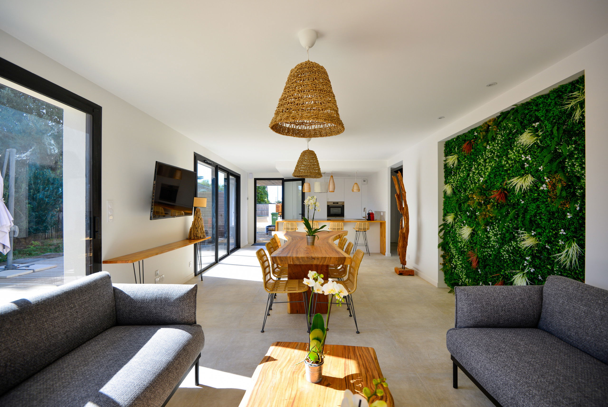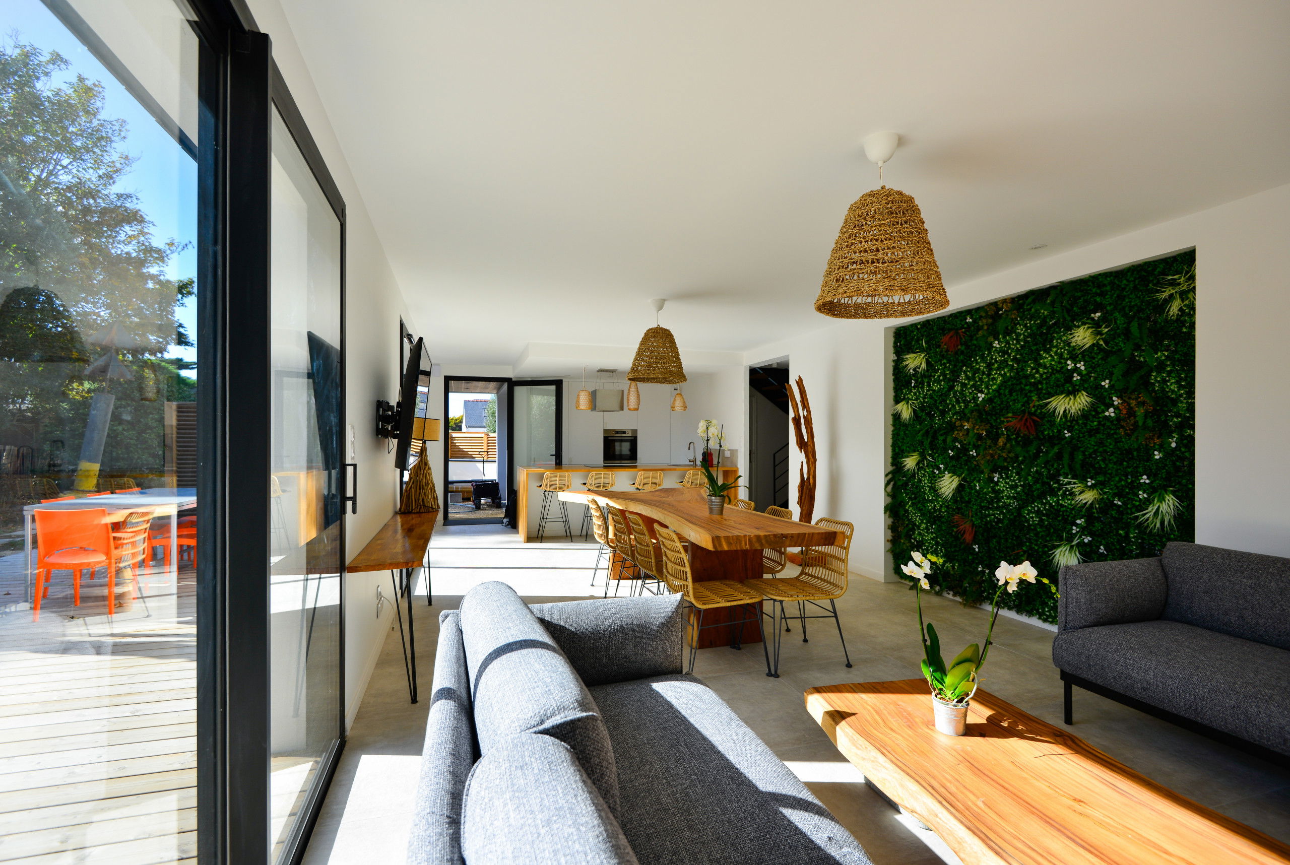 Loin de la route, l'environnement de cette villa d'architecte est calme, résidentiel et arboré.