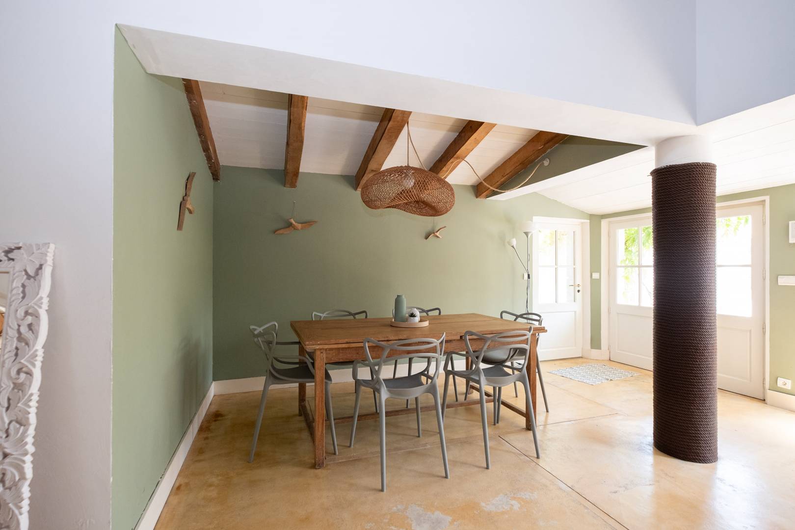 * Un vaste séjour, salle à manger de 70m2 avec une table pour 10 personnes donnant sur la piscine