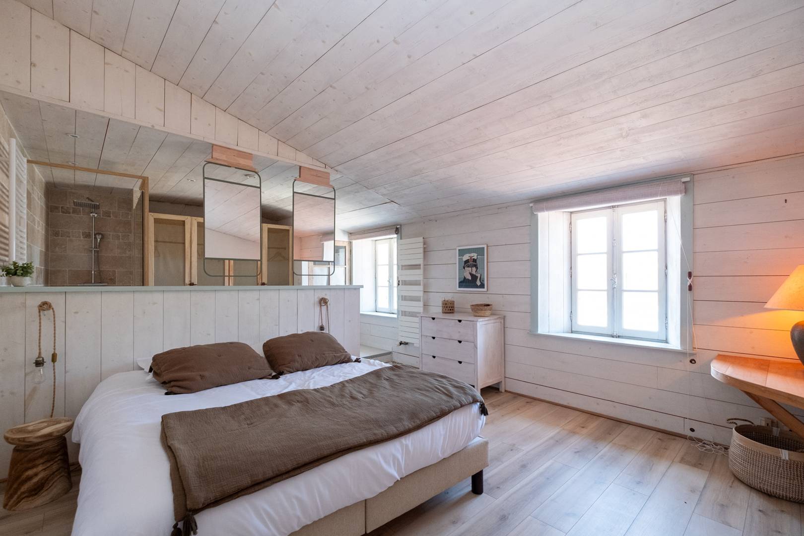 * Chambre 1 - A l'étage : (escalier escarpé sans rambarde) : suite parentale (lit de 180cm) avec salle de bain parentale, 1 WC séparé