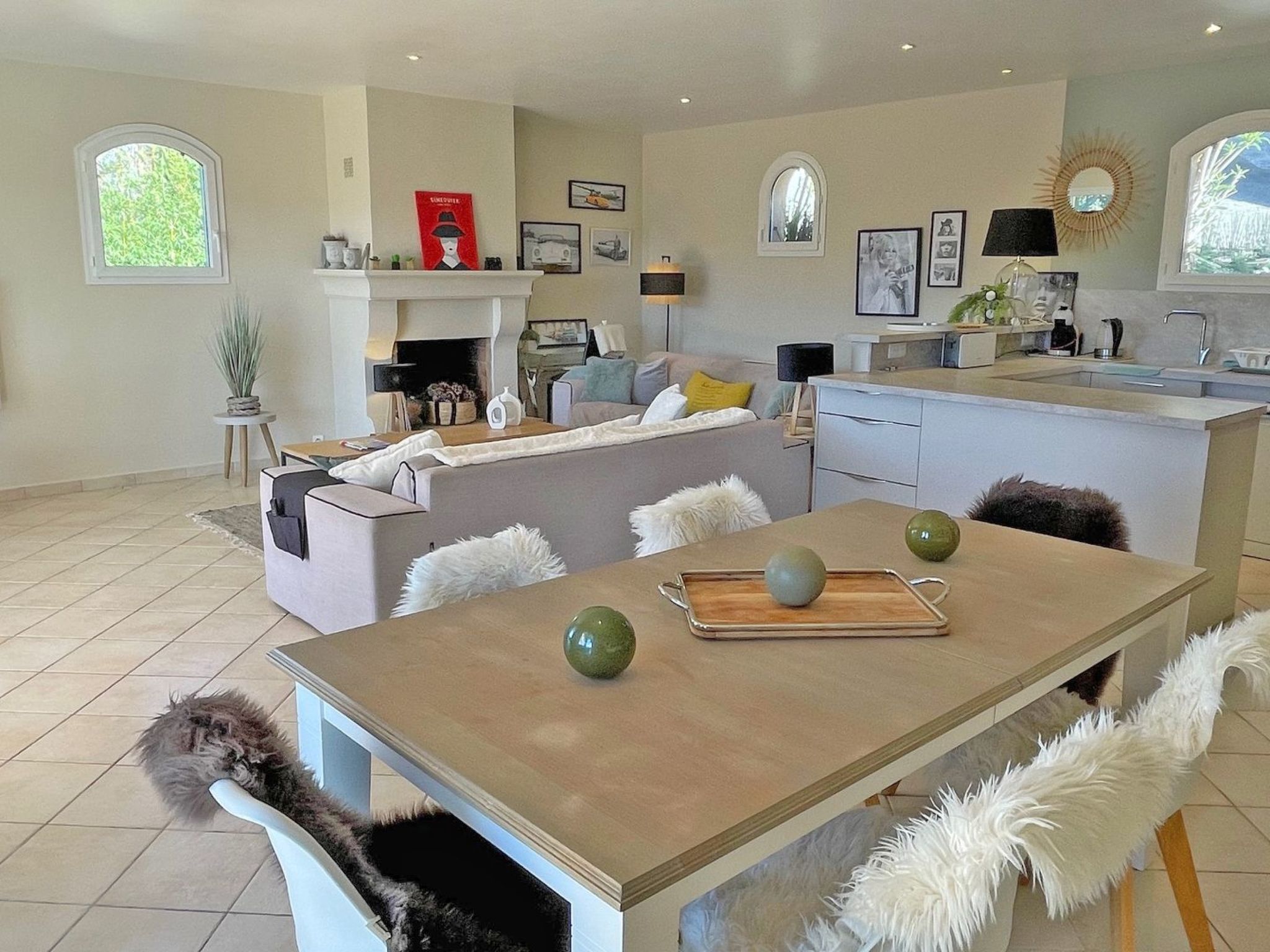 - Belle pièce à vivre climatisée donnant accès sur l'extérieur, répartie en 3 espaces : salon avec 2 canapés pouvant accueillir tous les convives, grand écran TV, le coin repas pour 8 personnes et la cuisine américaine très bien équipée (réfrigérateur, congélateur, plaques de cuisson, hotte aspirante, lave-vaisselle, four, micro-ondes, vaisselles diverses)