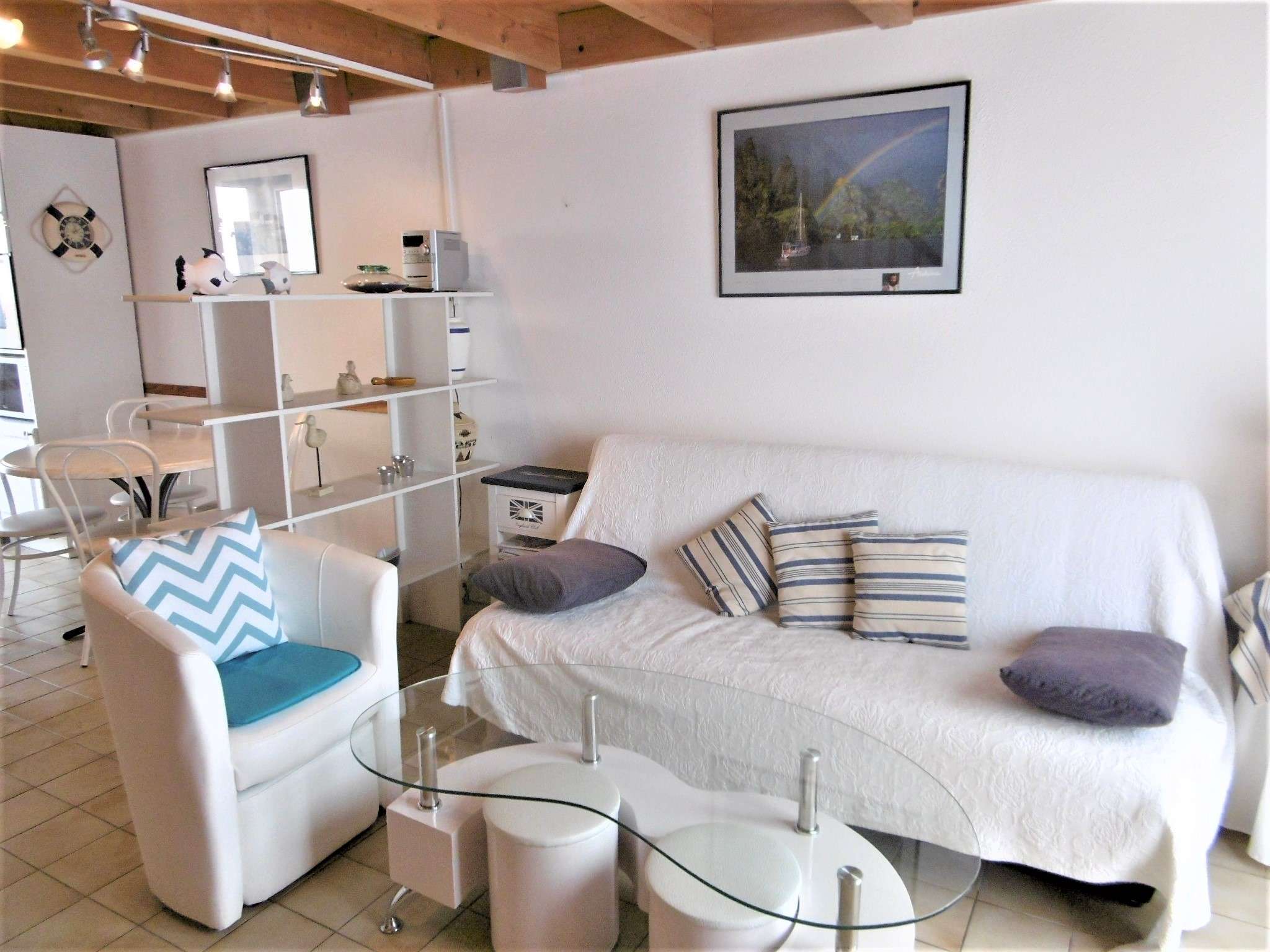 - Un séjour avec un canapé-lit donnant sur le jardin