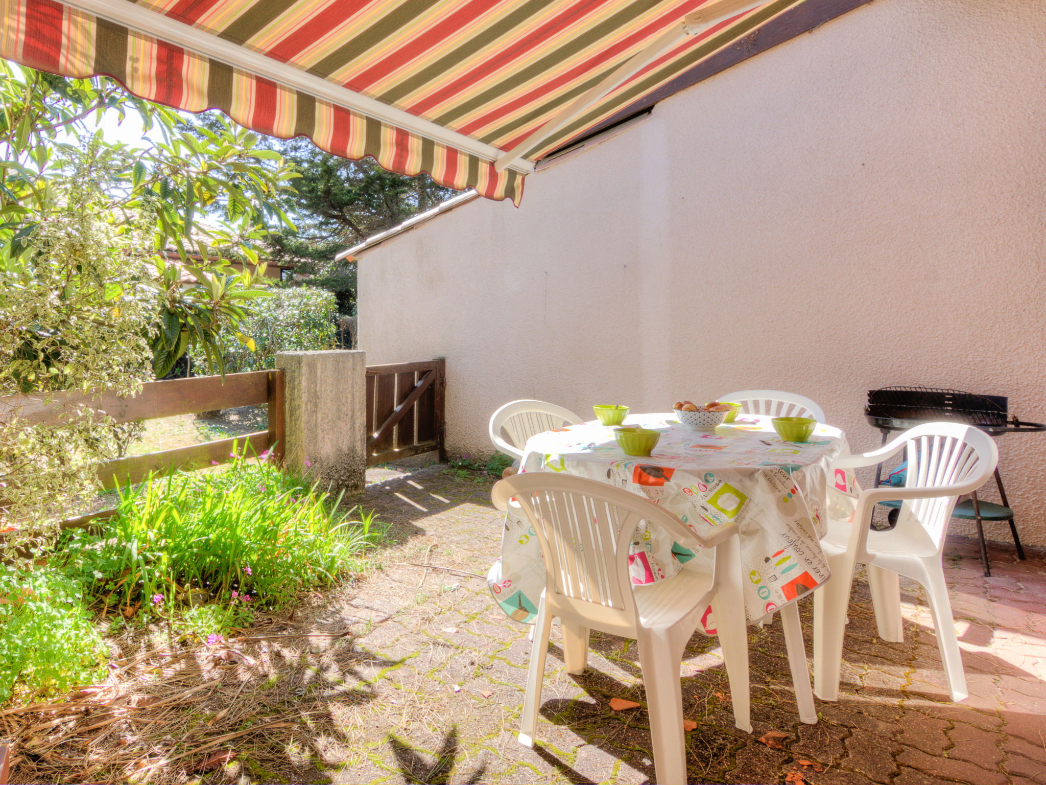 Seignosse Le Penon à 6 km de Hossegor: La résidence "Juncades" est un ensemble de maisons mitoyennes, environnées de verdure. Maison mitoyenne "Juncades". À 500 m de la mer, à 5 km du lac. Place de parking. Magasins 800 m, arrêt de bus "seignosse office du tourisme", gare ferroviaire, plage de sable 500 m. Terrain de golf (18 trous) 3.5 km, tennis 300 m.