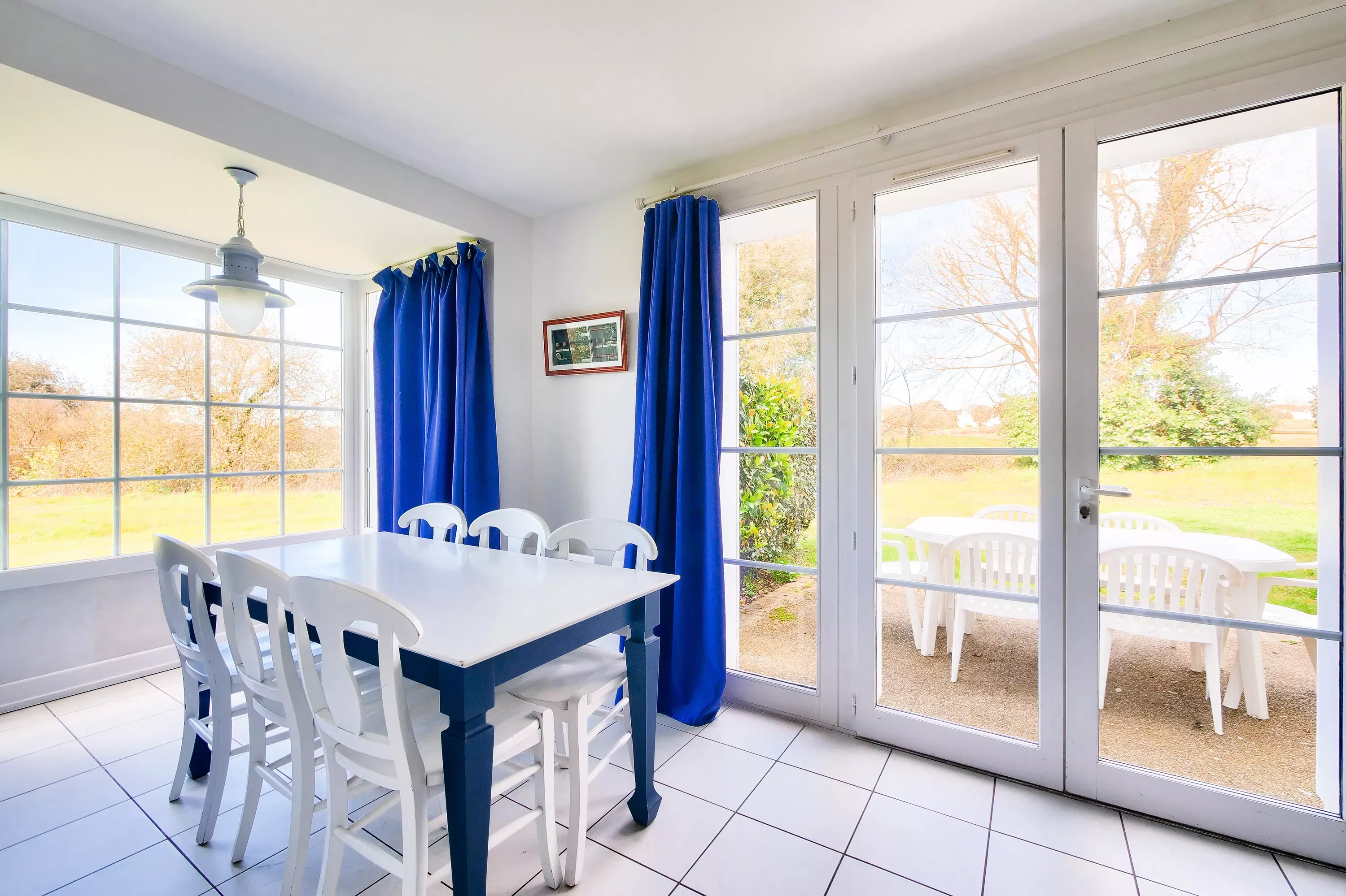 Composition du séjour : 1 canapé-lit (2 couchages) et 2 fauteuils. Côté repas : 1 table avec 6 chaises et 2 tabourets.