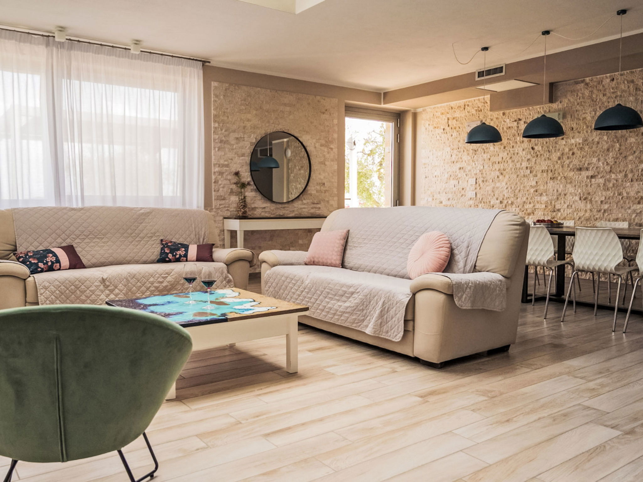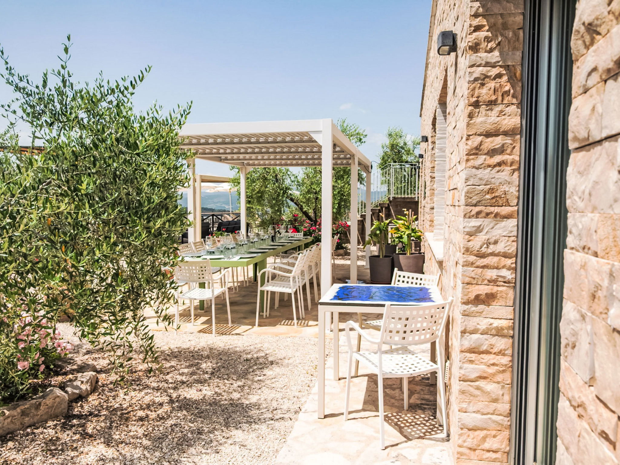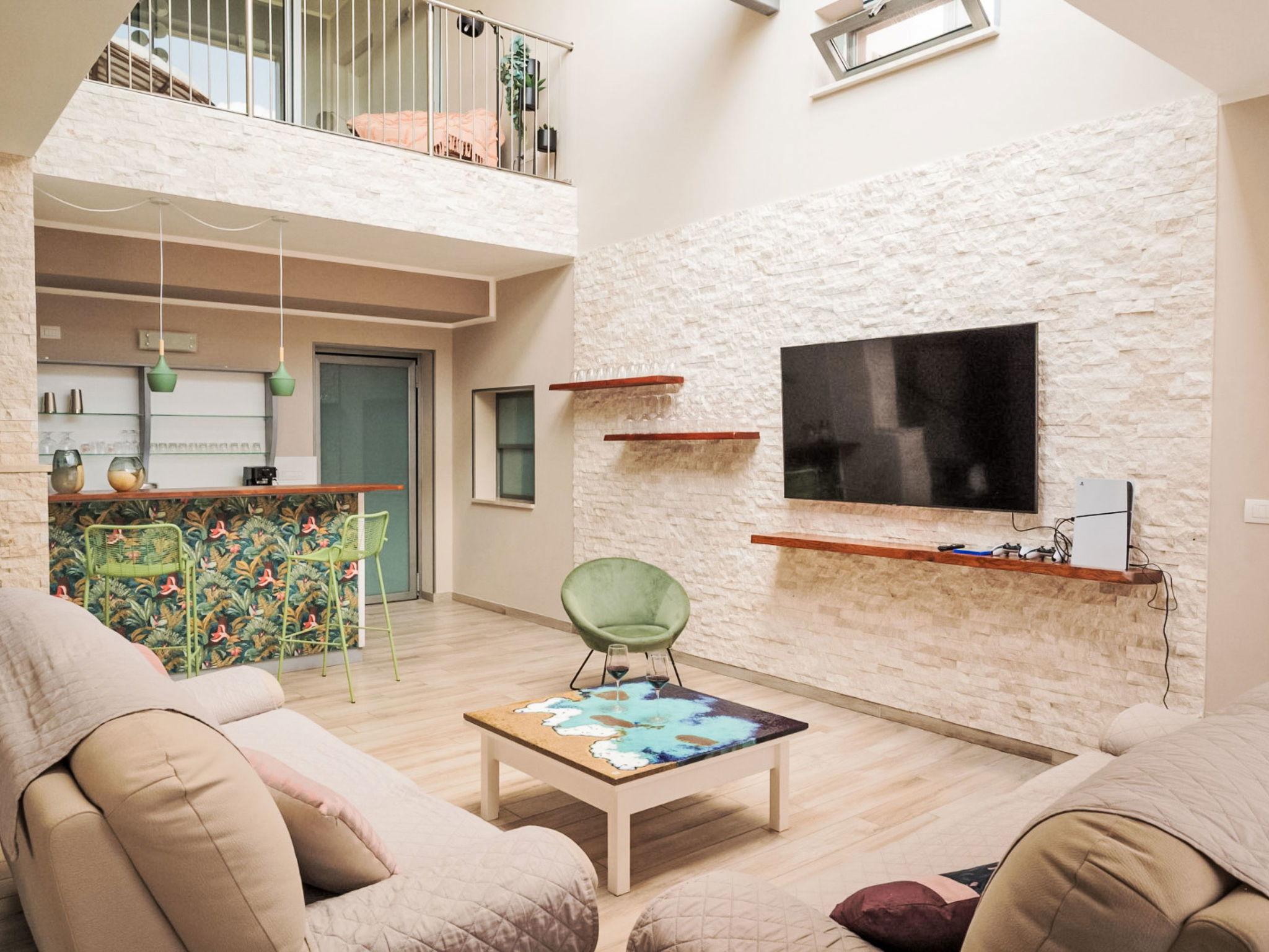 Villa 8 pièces 250 m2 sur 2 niveaux. Aménagement fonctionnel et moderne: grand séjour avec table pour les repas et TV (écran plat). Sortie sur le jardin. 2 chambres, chaque chambre avec: 1 x 2 lits superposés, 1 lit double, douche/bidet/WC et TV (écran plat). Sortie sur le jardin. Grande cuisine (four, lave-vaisselle, 6 feux, bouilloire électrique, micro-ondes, congélateur, gril, cafetière électrique, four à pizza) avec WC séparés. Sortie sur le jardin. 2 WC séparés. Chauffage électrique, air-conditionné. Possibilité de chauffage uniquement du 15.10. au 15.04. À l'étage supérieur: galerie ouverte. 1 chambre double avec douche/bidet/WC et TV (écran plat). Sortie sur le balcon. 2 chambres, chaque chambre avec: 1 lit, 1 lit double, douche/bidet/WC et TV (écran plat). Sortie sur le balcon. 1 chambre avec 1 lit, 1 lit double, douche/bidet/WC et TV (écran plat). Sortie sur le jardin, sur le balcon. Belle vue panoramique sur les alentours. A disposition: lave-linge, coffre-fort, chaise haute pour enfant, lit bébé, sèche-cheveux. Internet (Connexion WIFI). 1 animal/ chien de petite taille autorisé. Toutes les chambres sont équipées d'un coffre-fort et d'un minibar. L'une des chambres double du rez-de-chaussée possède une salle de bain accessible aux personnes à mobilité réduite. IT054052B501031390